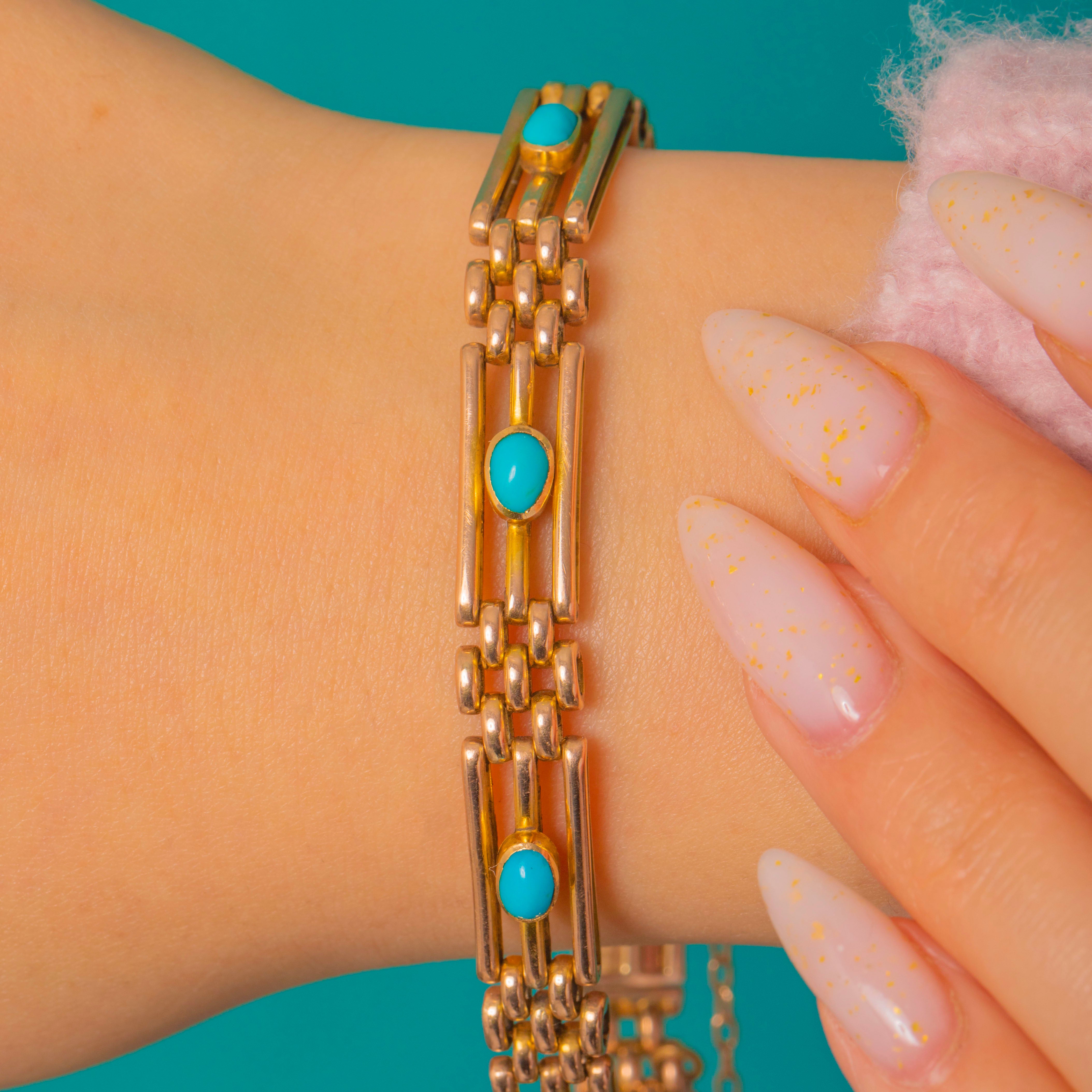 A sleek Victorian gate bracelet finished in warm 9ct Gold, set with a string of bright turquoise cabochons.