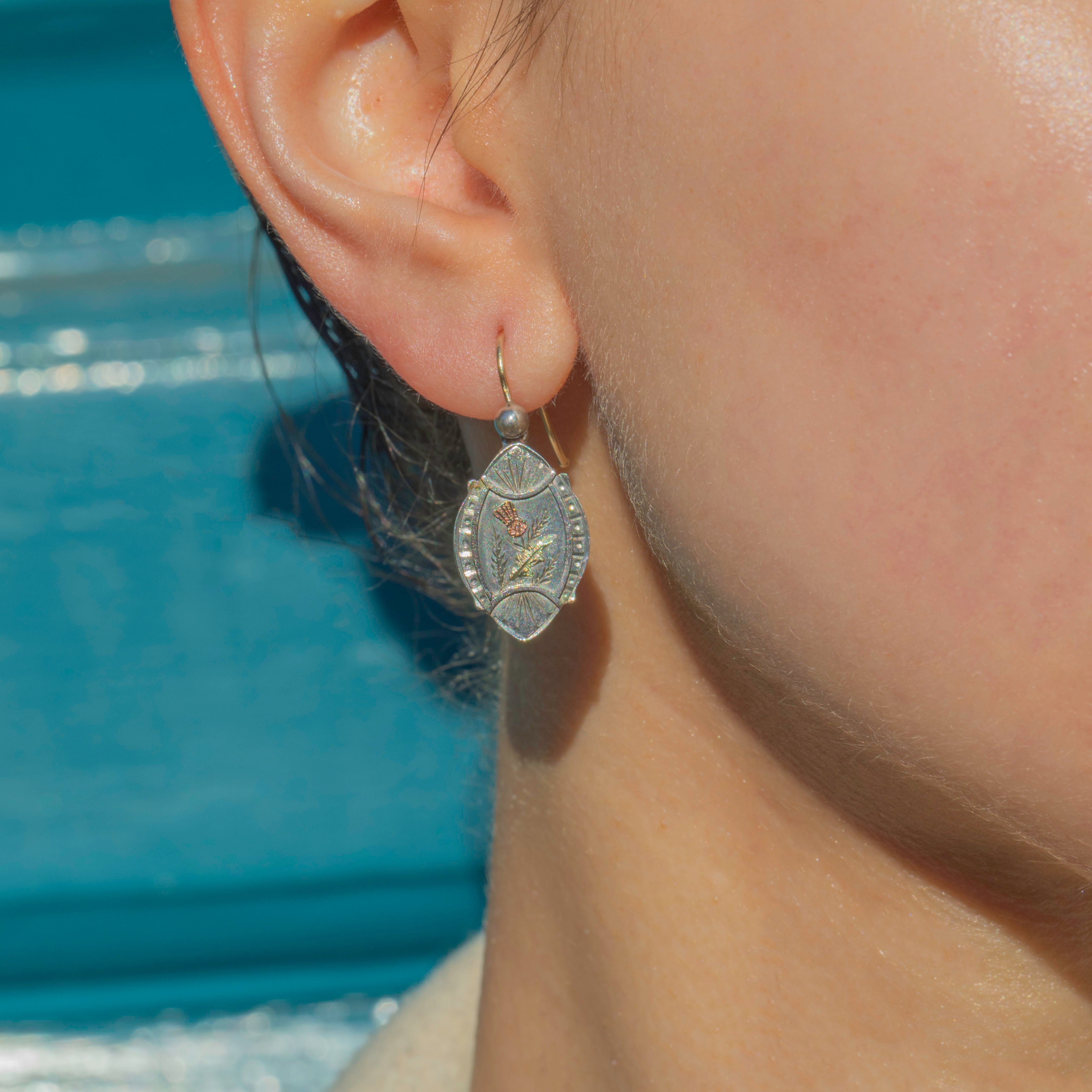 VERY GOOD: These Victorian Aesthetic Silver & 9ct Gold floral navette earrings are in very good condition. The Silver is bright and has accrued an admirable patina within the details making them pop. The engravings are defined and the rose Gold thistles are pristine. There is some general age-related wear throughout, including evidence of a conversion on the back. However, this is all minor and does not detract from their overall beauty. The hooks are slender and comfortable to wear, so you can enjoy these Victorian Aesthetic earrings with confidence!