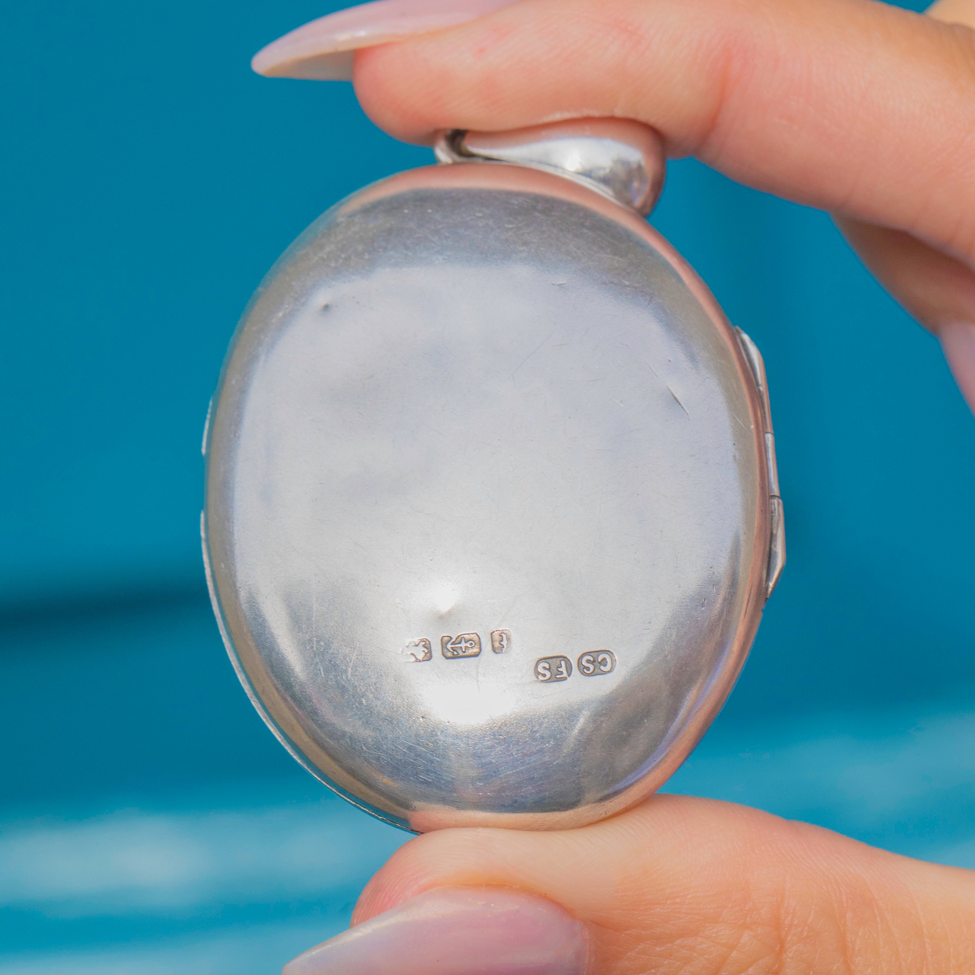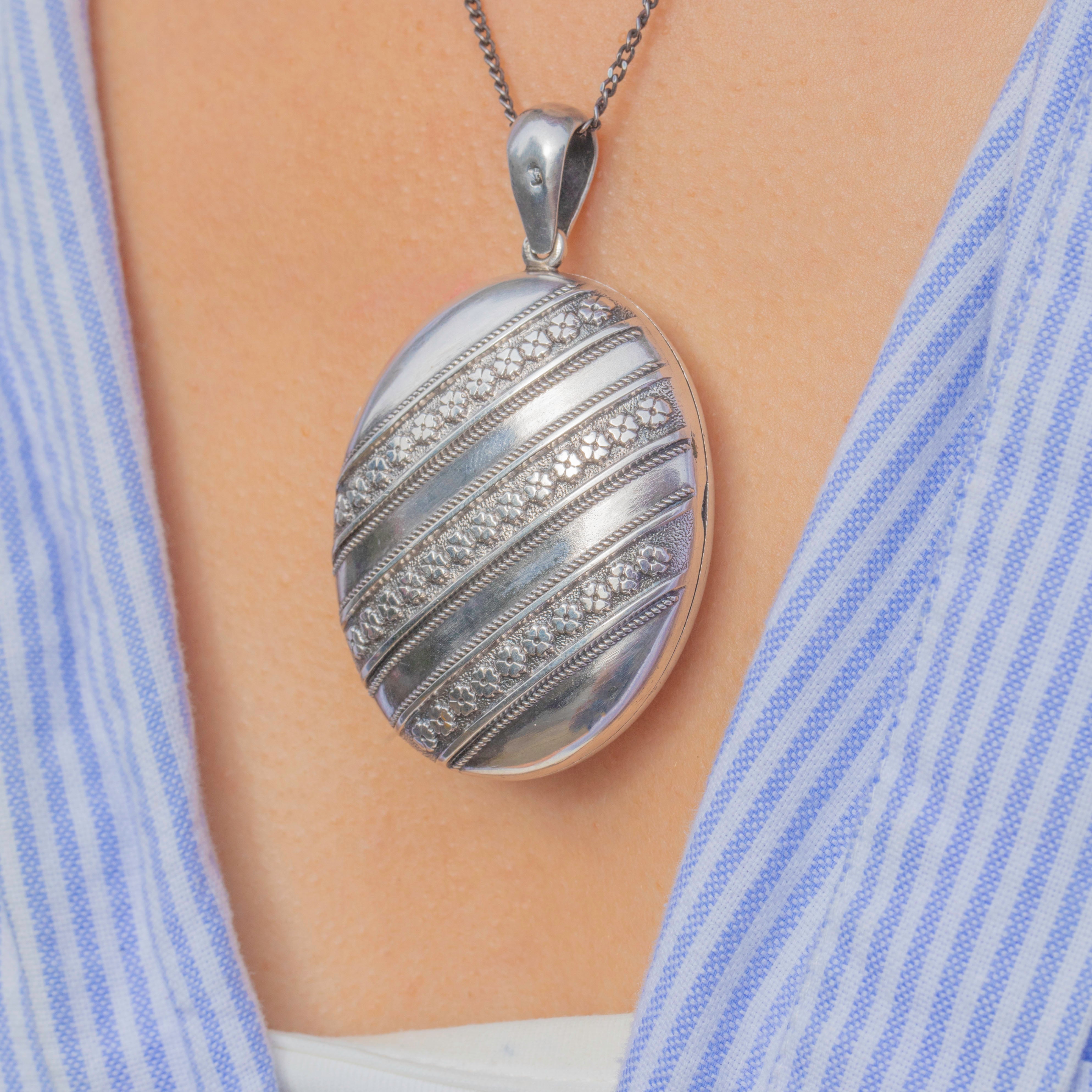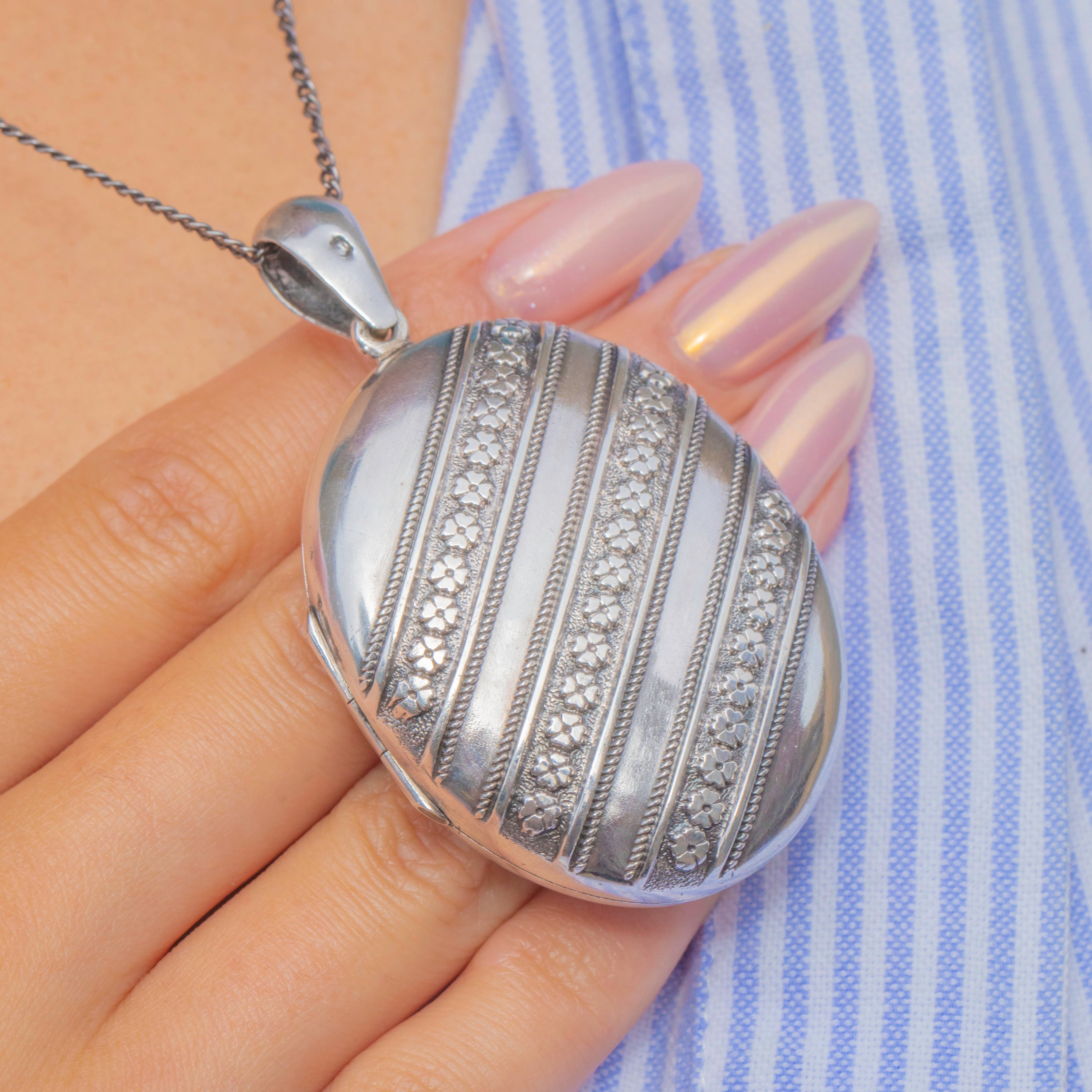 This large antique Silver locket is adorned by floral details, a quintessential Victorian motif which provides a lovely texture and depth. It is fully hallmarked and dated to 1880.