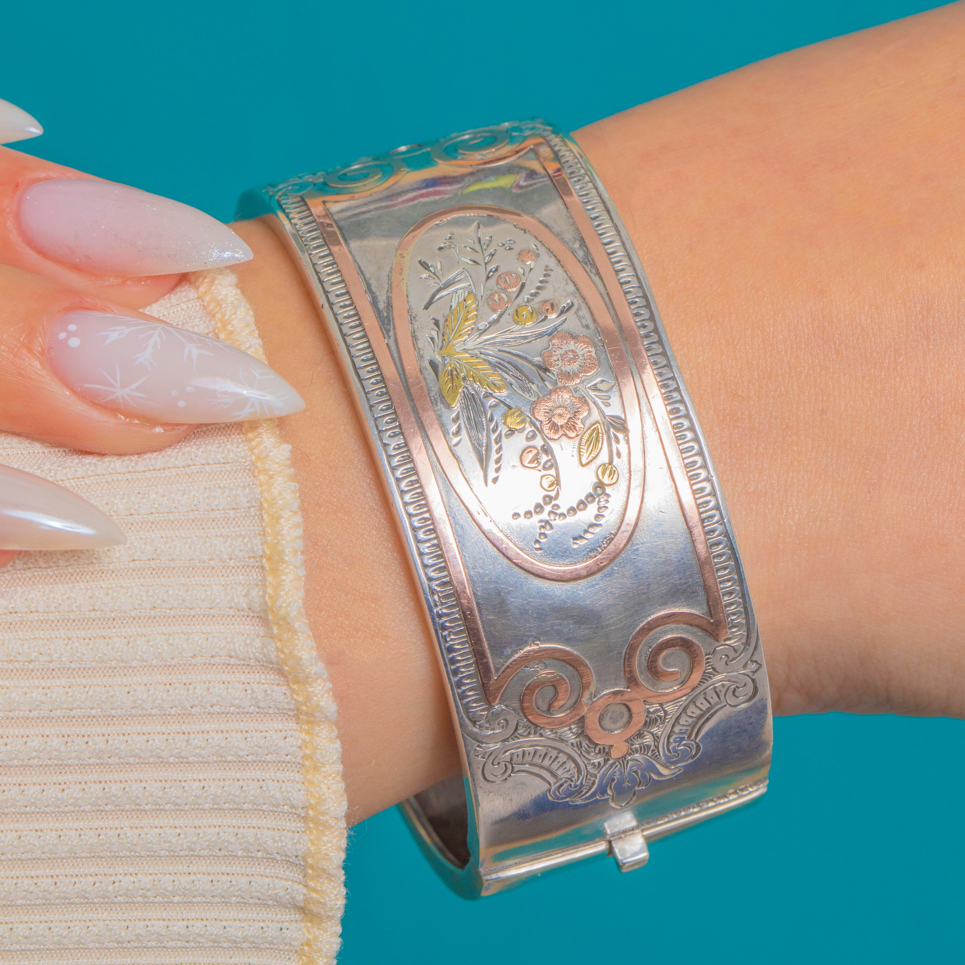 The wide, hinged cuff form is quintessentially late 19th century, with mixed-metal botanical motifs and fine scrollwork embodying the era’s love of nature and contrast.
