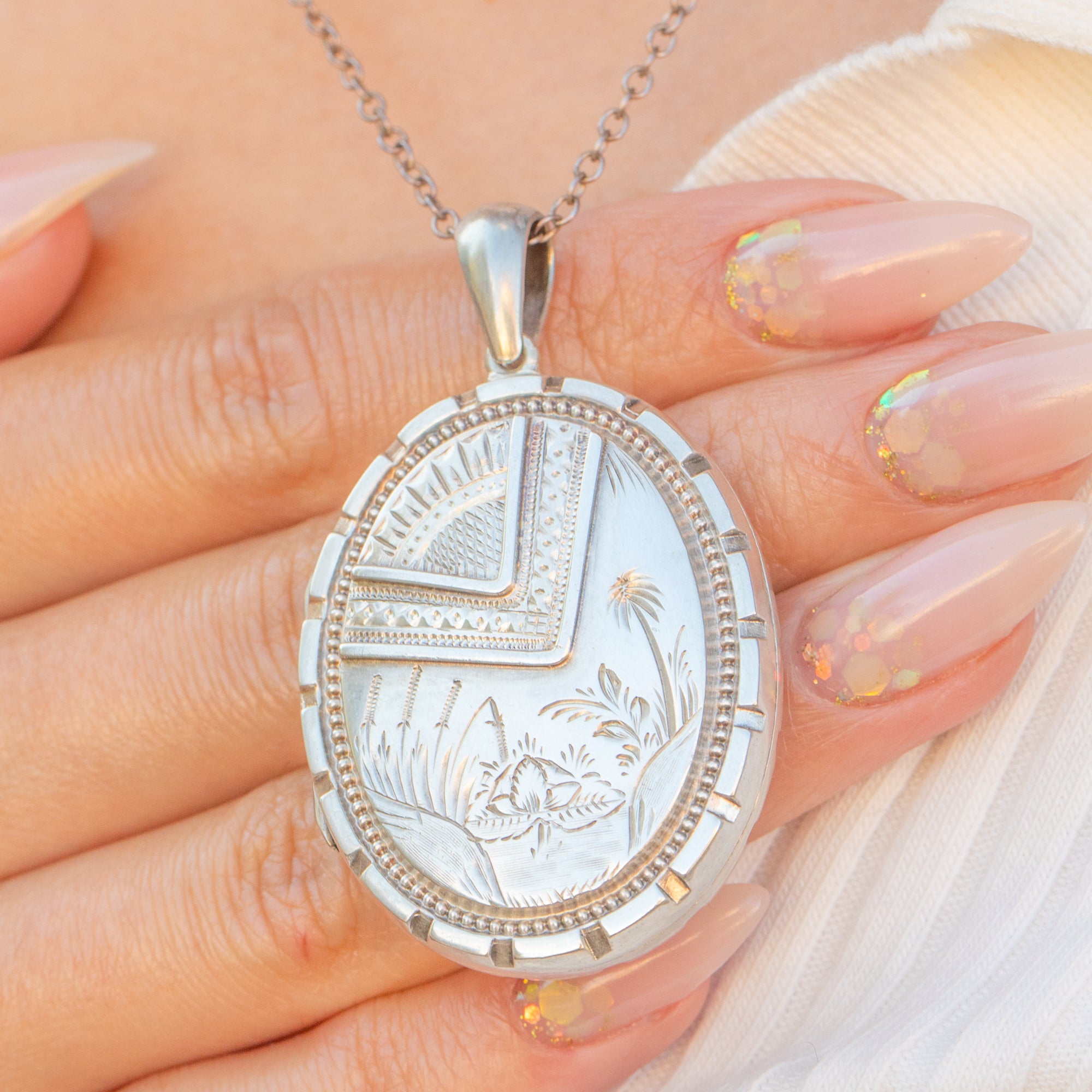 This striking Victorian Silver locket features an intricately engraved palm tree, a rare and evocative motif in 19th-century jewellery. The oval form opens to reveal both original frames inside, perfect for keeping photographs or mementos safe. Substantial in size and weight, this locket carries the bold yet refined charm of the Aesthetic period.