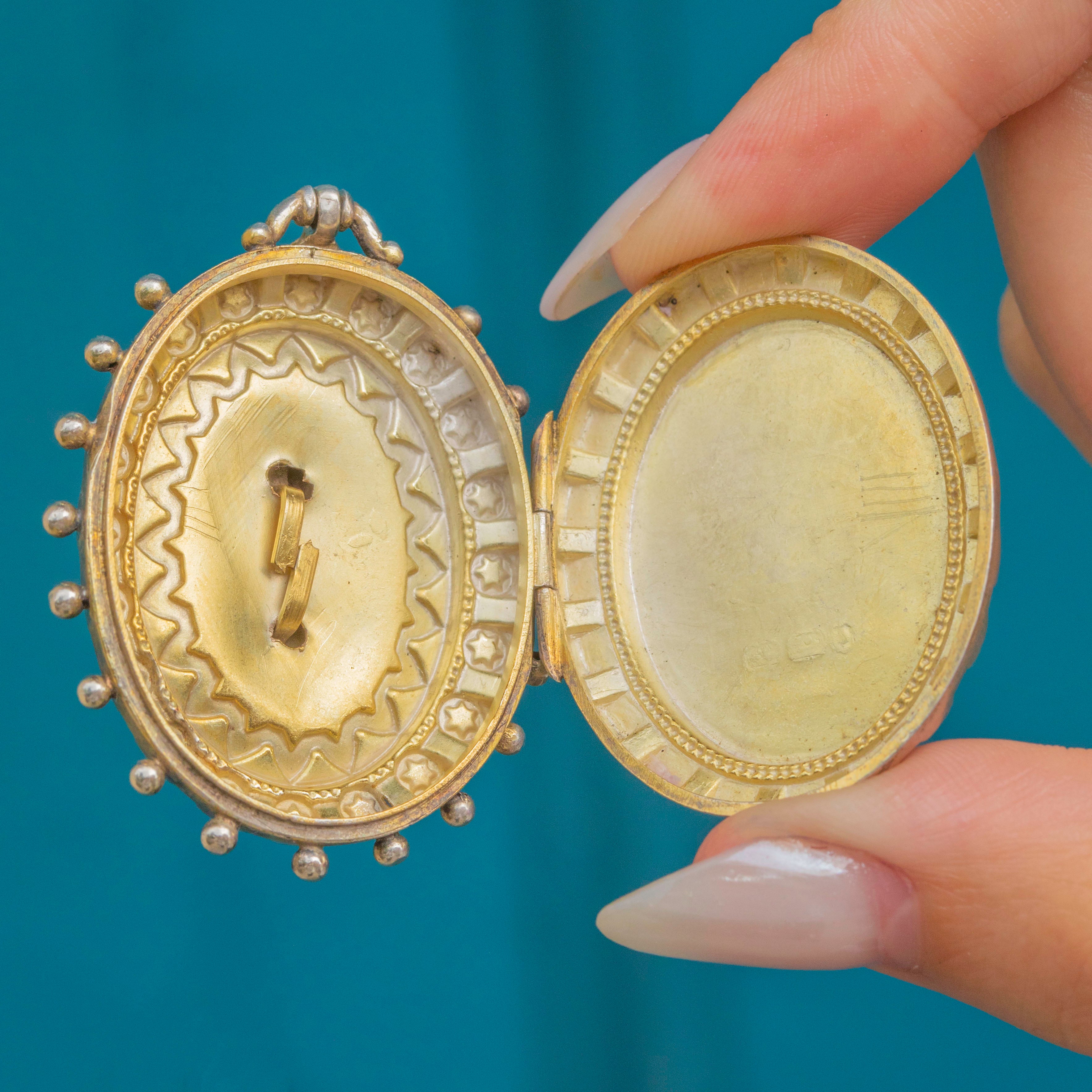 This Victorian locket has a distinctive design, with a floral engraved centre and a star border, that sets it apart from the crowd, and we love the addition of the beaded edge, another classic Victorian touch!