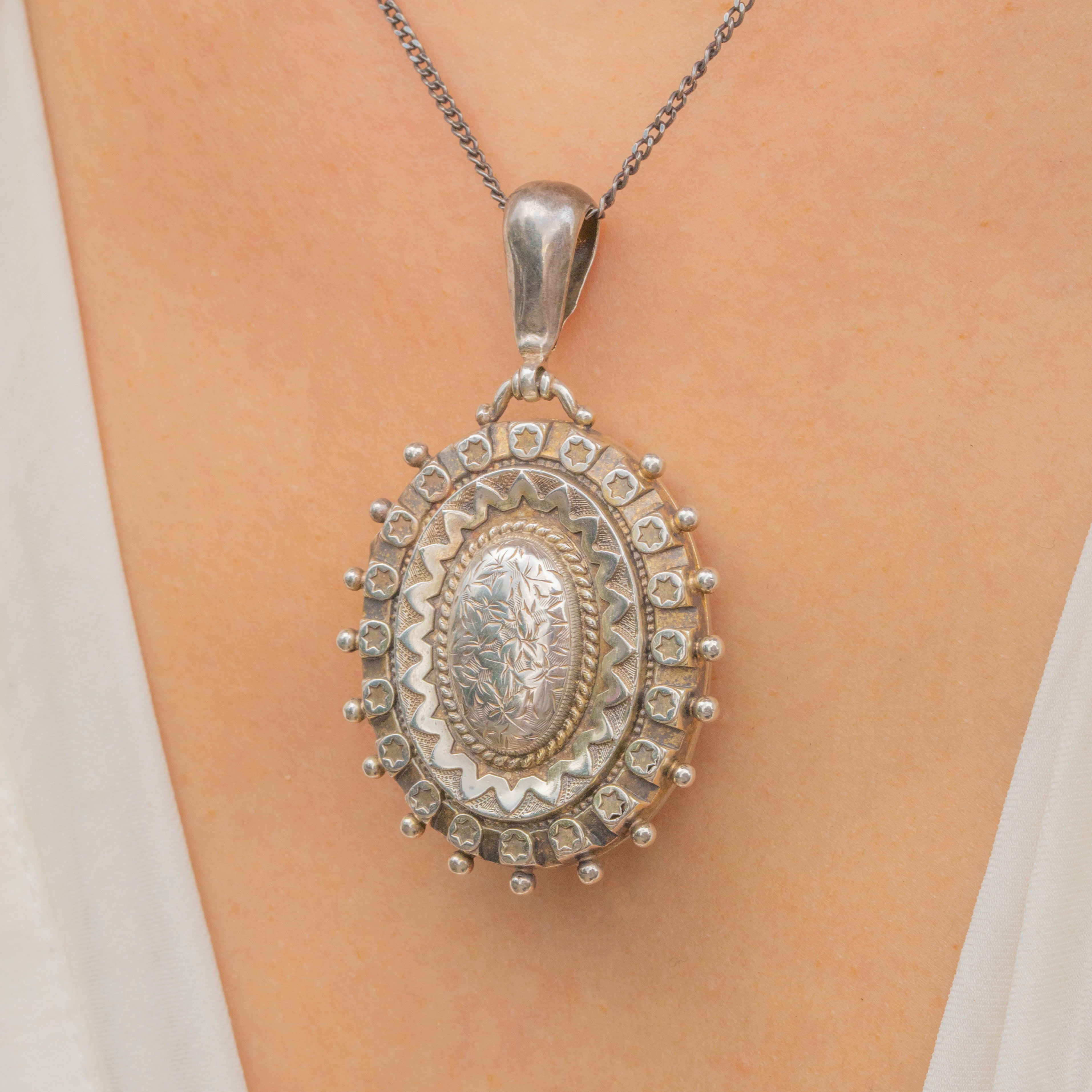 Victorian Aesthetic Silver Star Engraved Locket c.1885, Beaded Edge