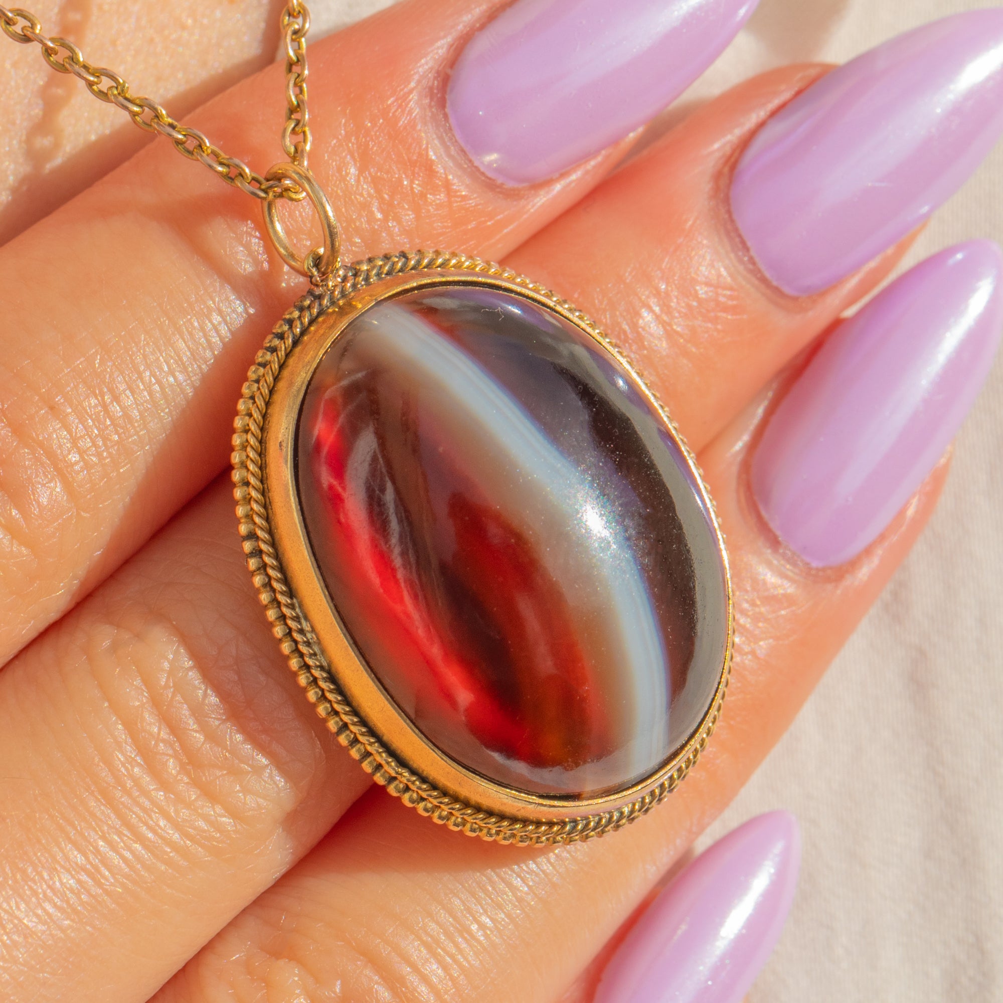 This Victorian pendant showcases a striking high-domed Banded Agate, its natural ribbons of deep red and warm brown flowing through inky black to a soft cream-grey. The stone is framed in a closed-back gilded Sterling Silver mount with an elegant twisted-rope surround and fine beaded edge, finished with a simple jump ring for effortless styling.