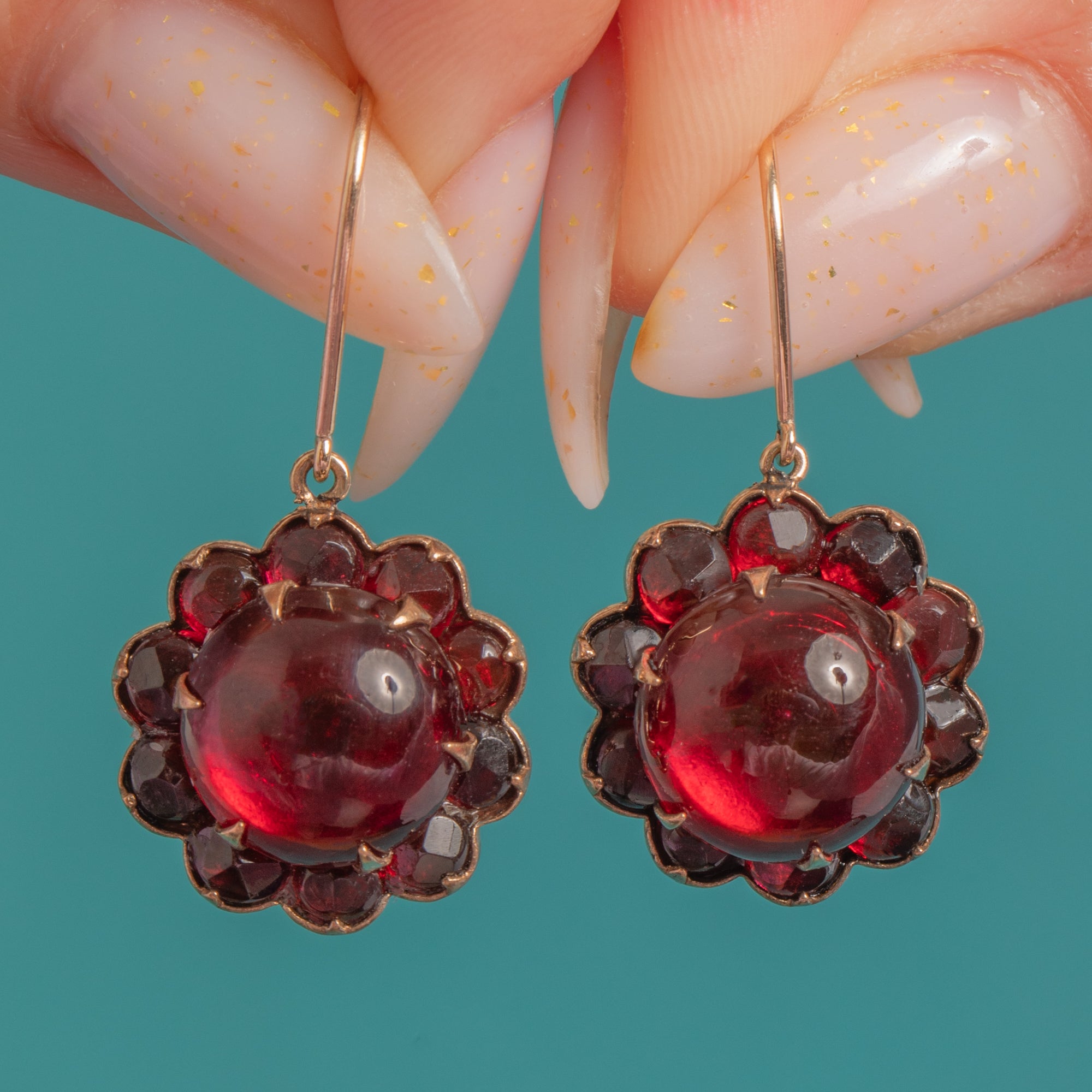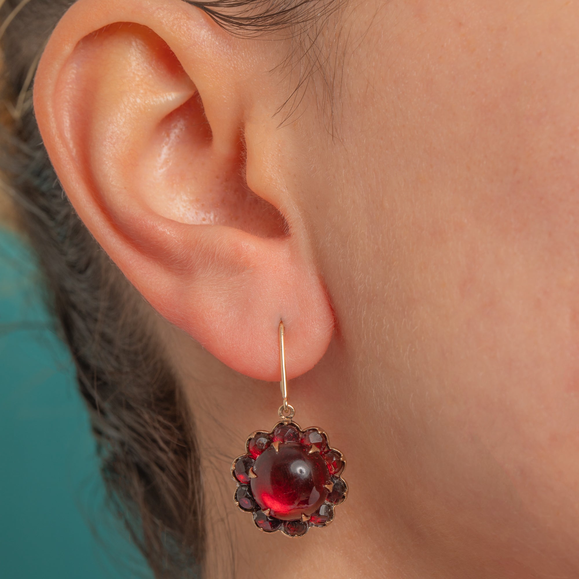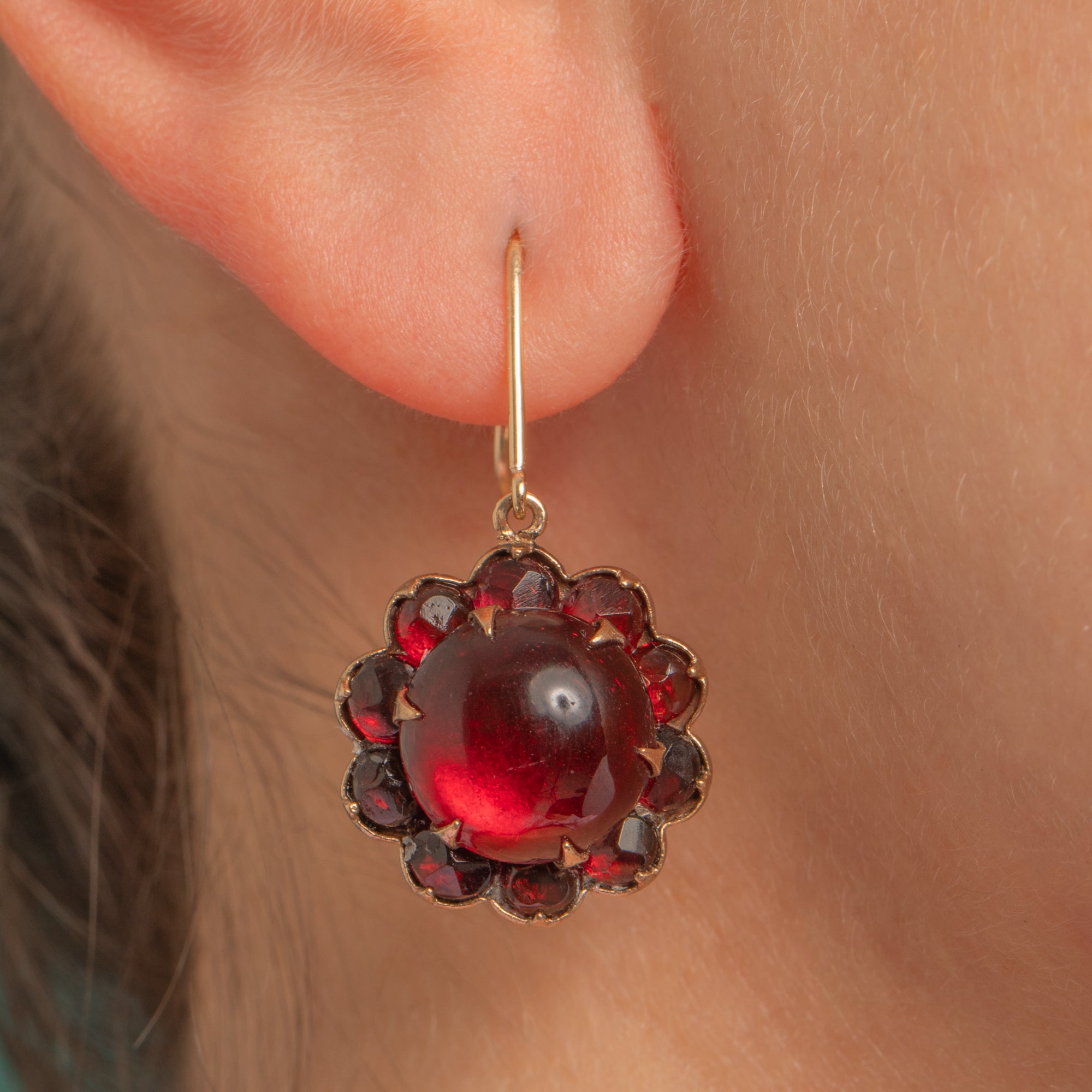 Radiant and romantic, these Victorian Garnet glass flower earrings glow with a deep pomegranate hue. Each earring centres a high-domed Garnet glass cabochon, framed by a halo of petite faceted Garnet glass in a scalloped, rosette silhouette. The rich reds are beautifully complemented by warm Gold tone settings, with elegant 9ct Gold shepherd hooks for comfortable, graceful wear.