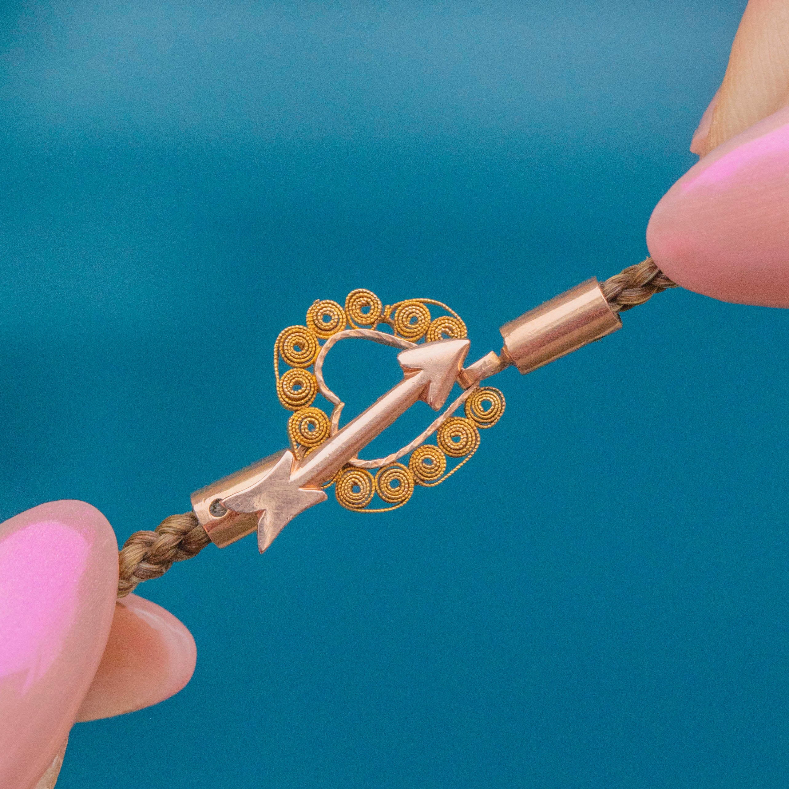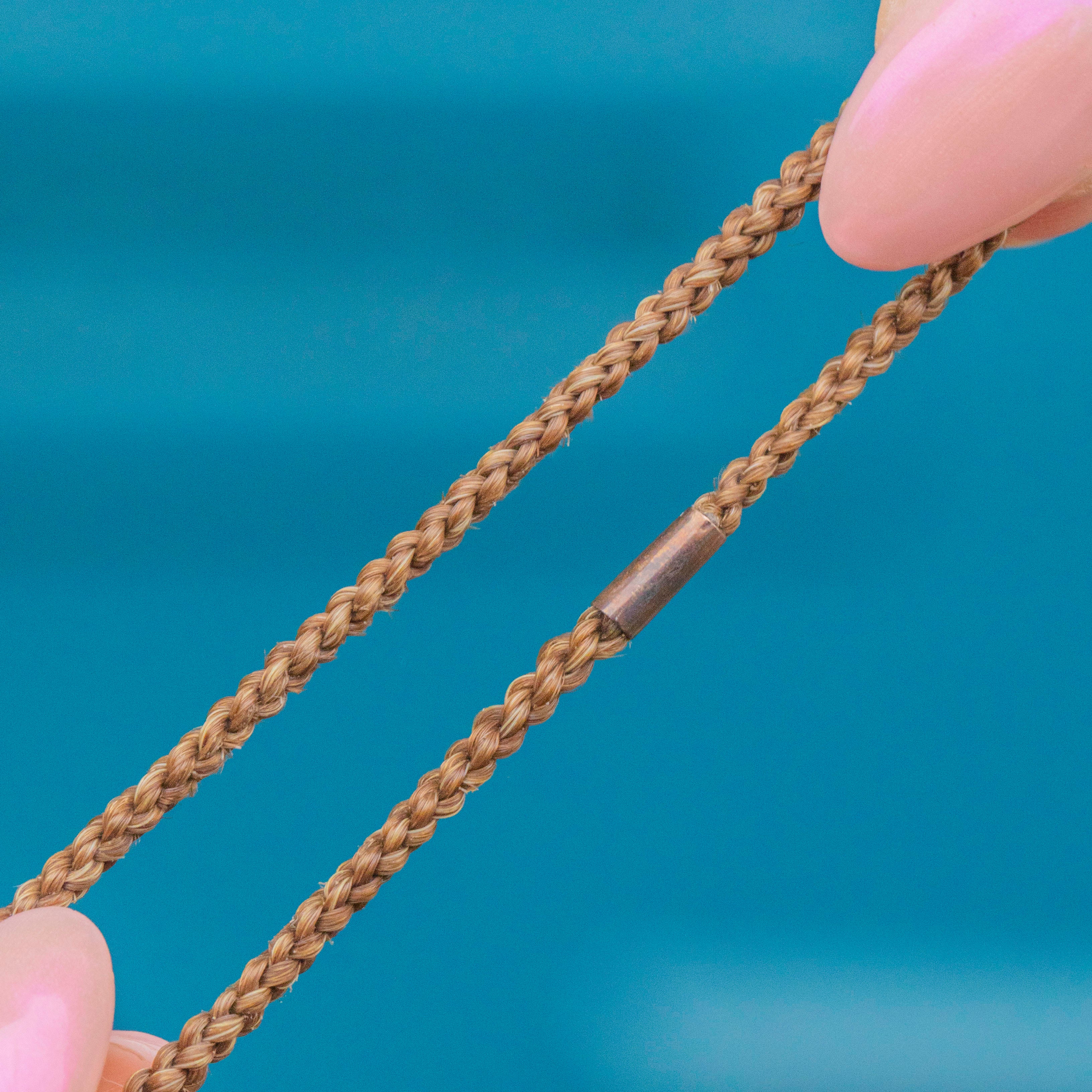 This Victorian mourning hair necklace, with a 15ct Gold locket, is one of our most historic treasures! Entirely crafted from woven brunette hair, this antique necklace is complete with a unique pierced heart clasp and locket.