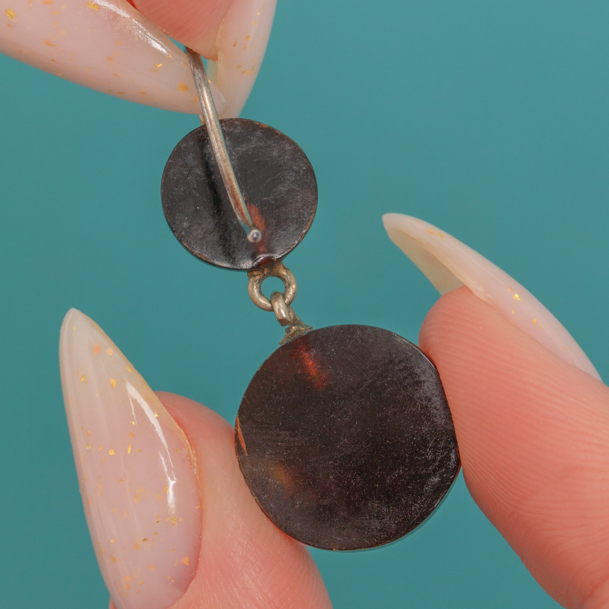These Victorian Piqué double-drop earrings are a beautifully balanced study in contrast and craft. Each glossy dark “lentil” is enriched with fine 9ct Gold foliate sprays, rosettes and dotted scrollwork, the larger drop encircled by a delicate garland motif for an elegant Aesthetic/Japonisme flourish. The graduated, articulated construction gives a subtle sway that catches the light on every detail.