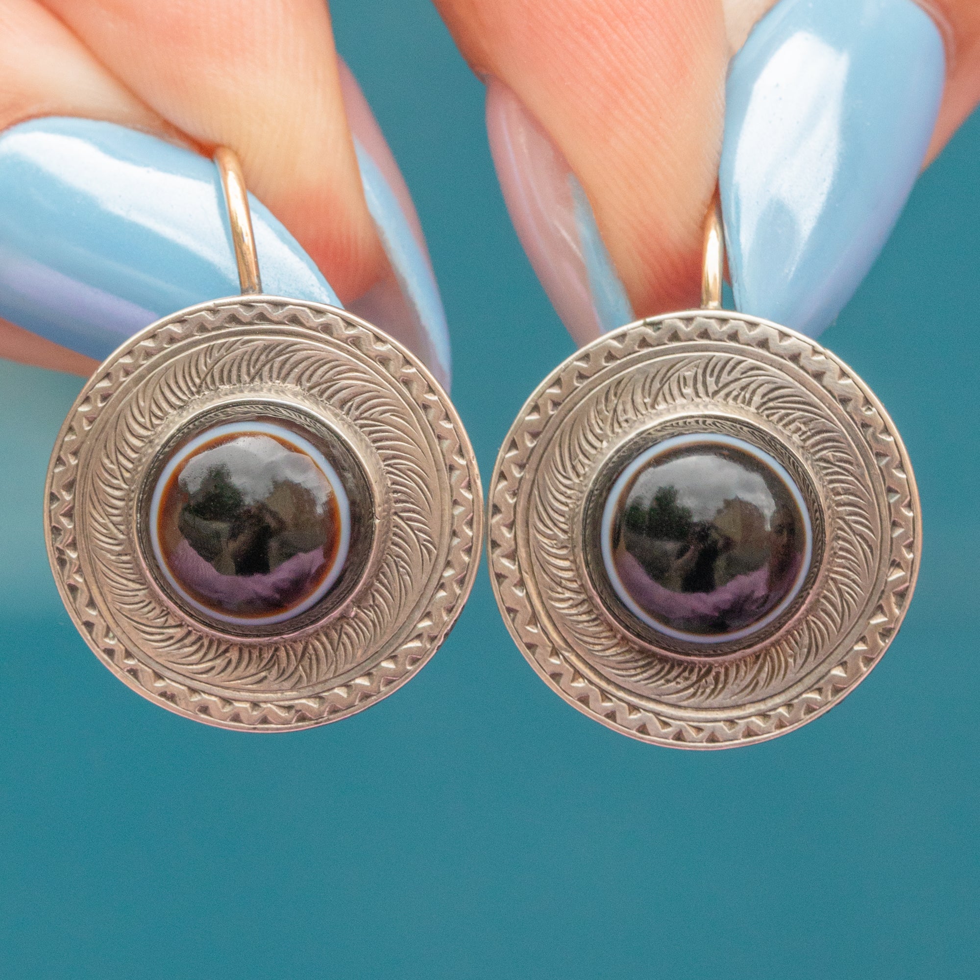 Boasting character and antique charm, this pair of Victorian earrings each presents a plump banded Agate with a white band running the circumference of the stone - akin to a bullseye.