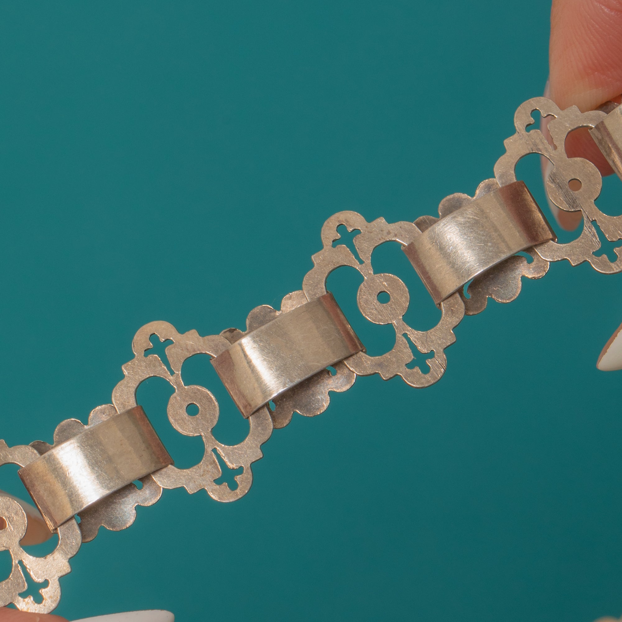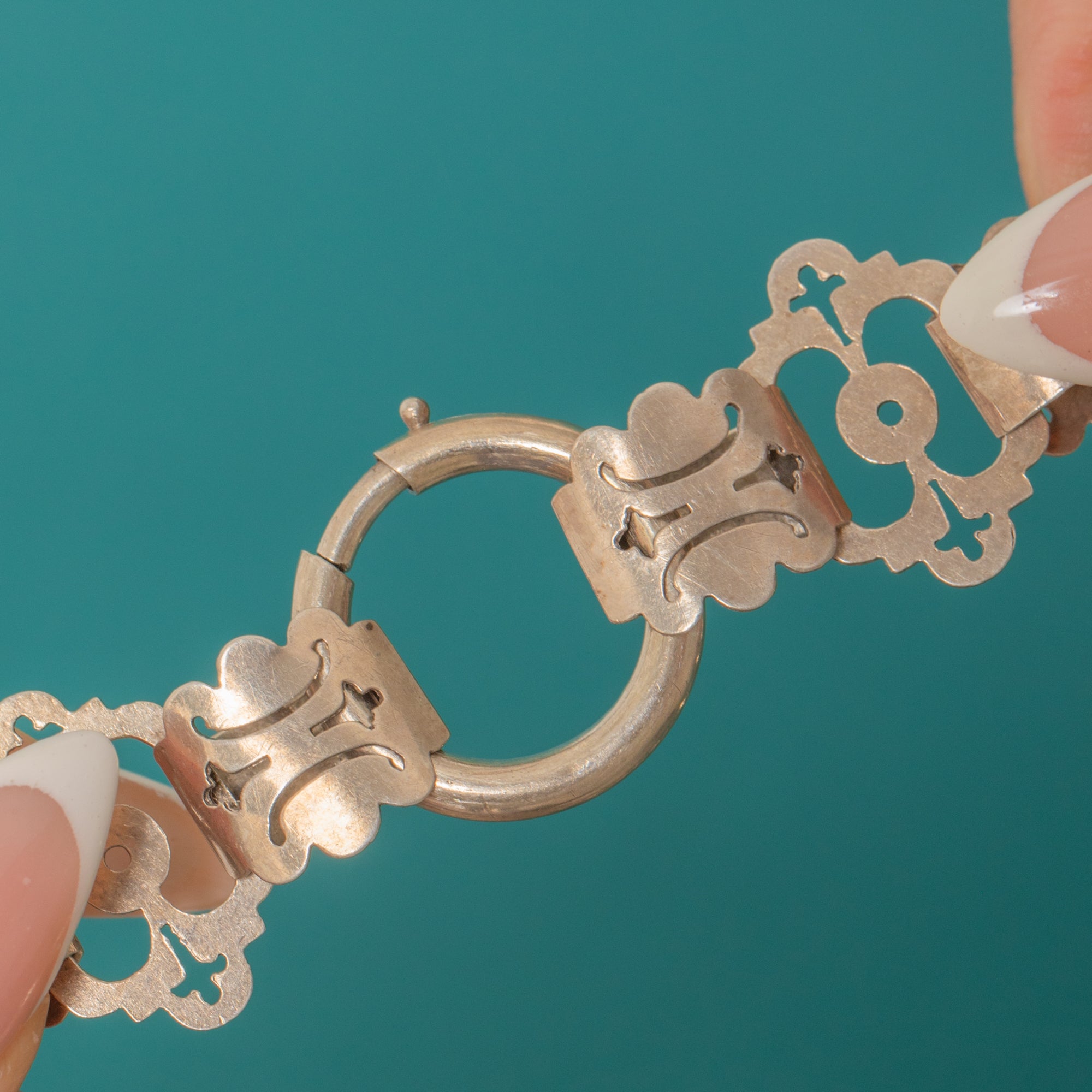 A beautifully ornate Victorian Silver book chain collar, pierced with gothic quatrefoils and tiny crosslet details across a procession of scalloped plaques. The articulated panels sit close to the neckline, with raised ribbon-like strips and domed stud accents catching the light against a soft, even patina.
