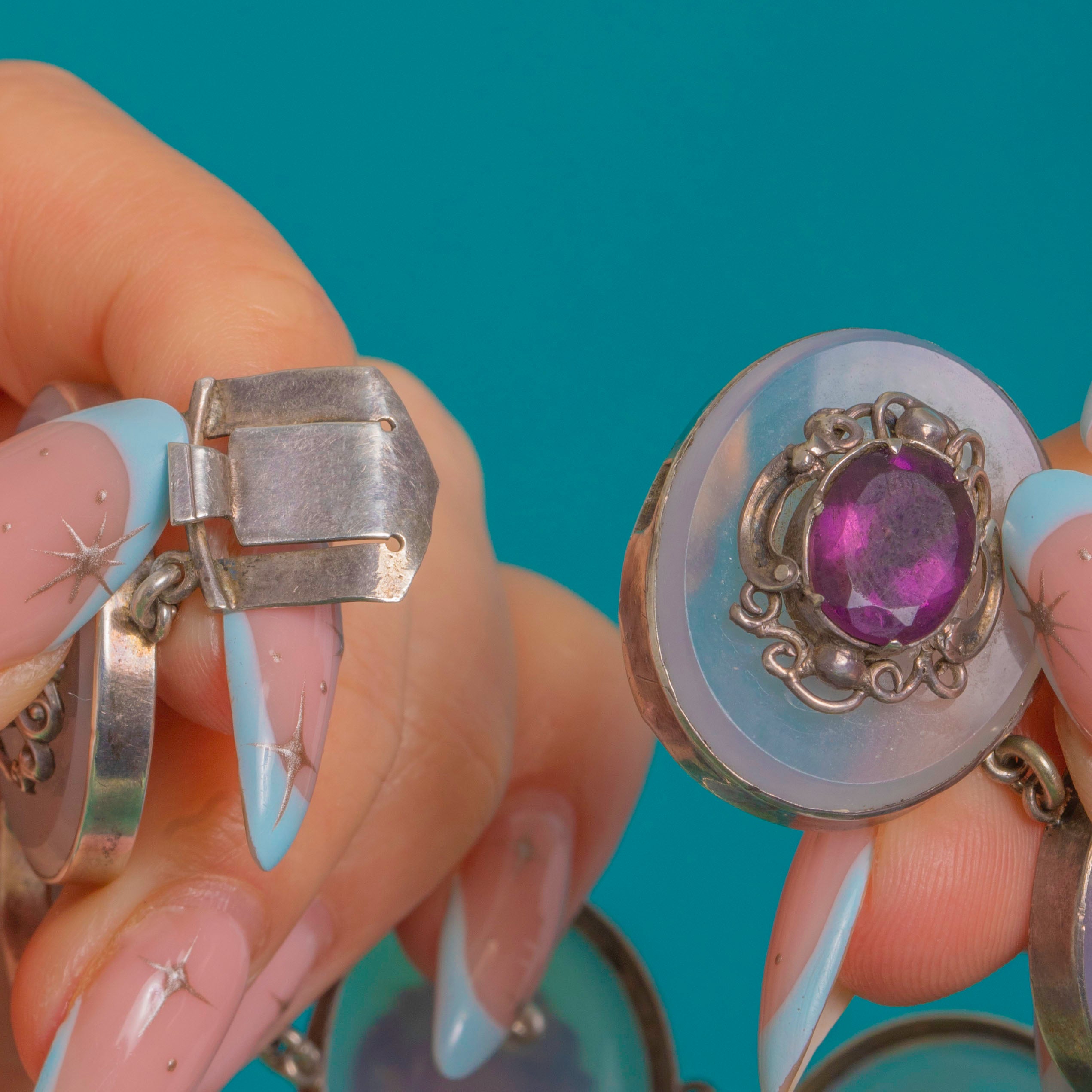 VERY GOOD: The White Chalcedony discs show light surface abrasions commensurate with age; the purple stones display minor facet and surface wear with bright colour retained. The Sterling Silver panels, articulation, and box clasp with safety chain are secure, with a gentle patina that enhances the detail. Two stones are later Purple Paste replacements (one adjacent to the clasp and one centrally), and some small screws to the backs of certain links are absent; this does not affect the security or wear of the bracelet.
