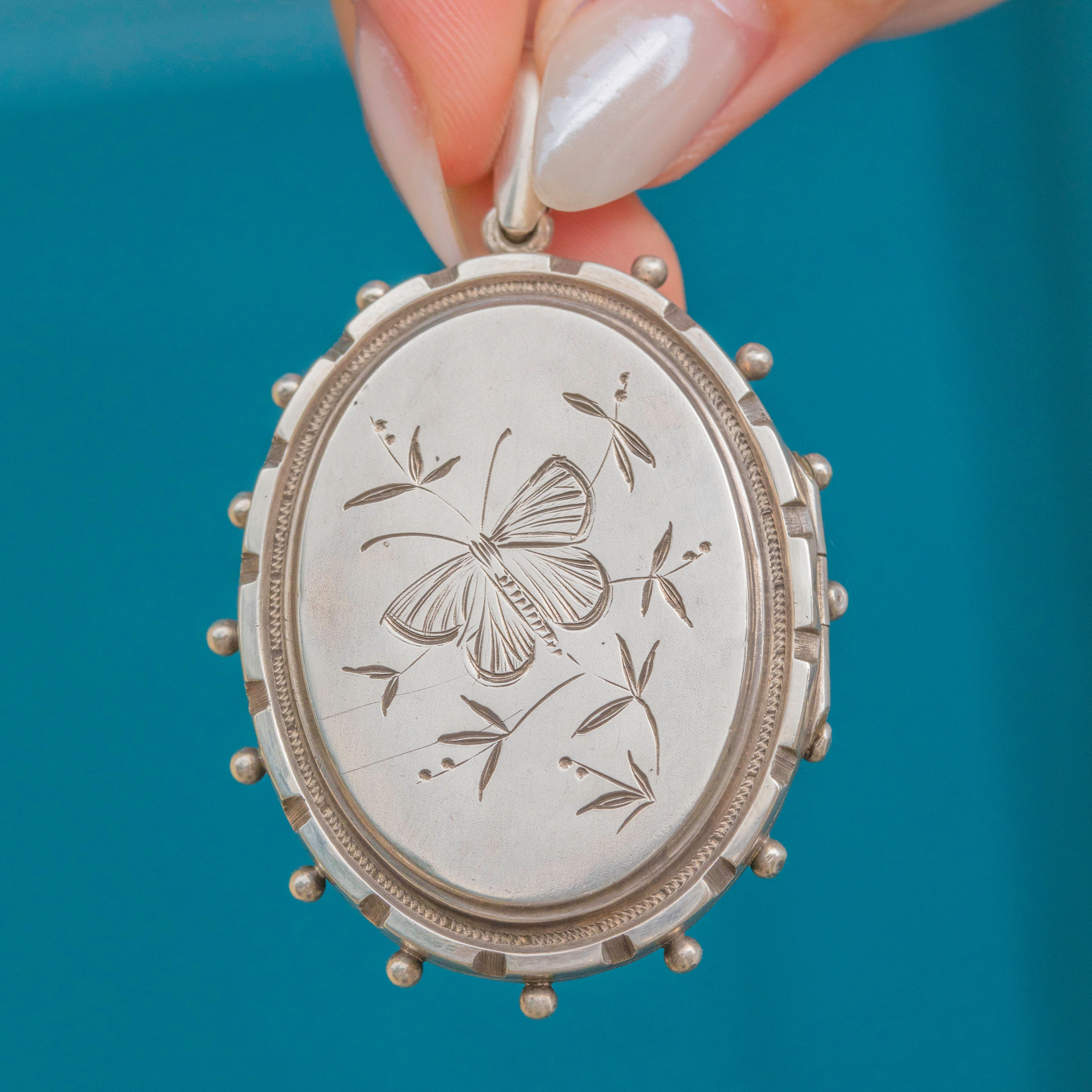 Victorian Sterling Silver Engraved Butterfly Oval Locket, c.1879