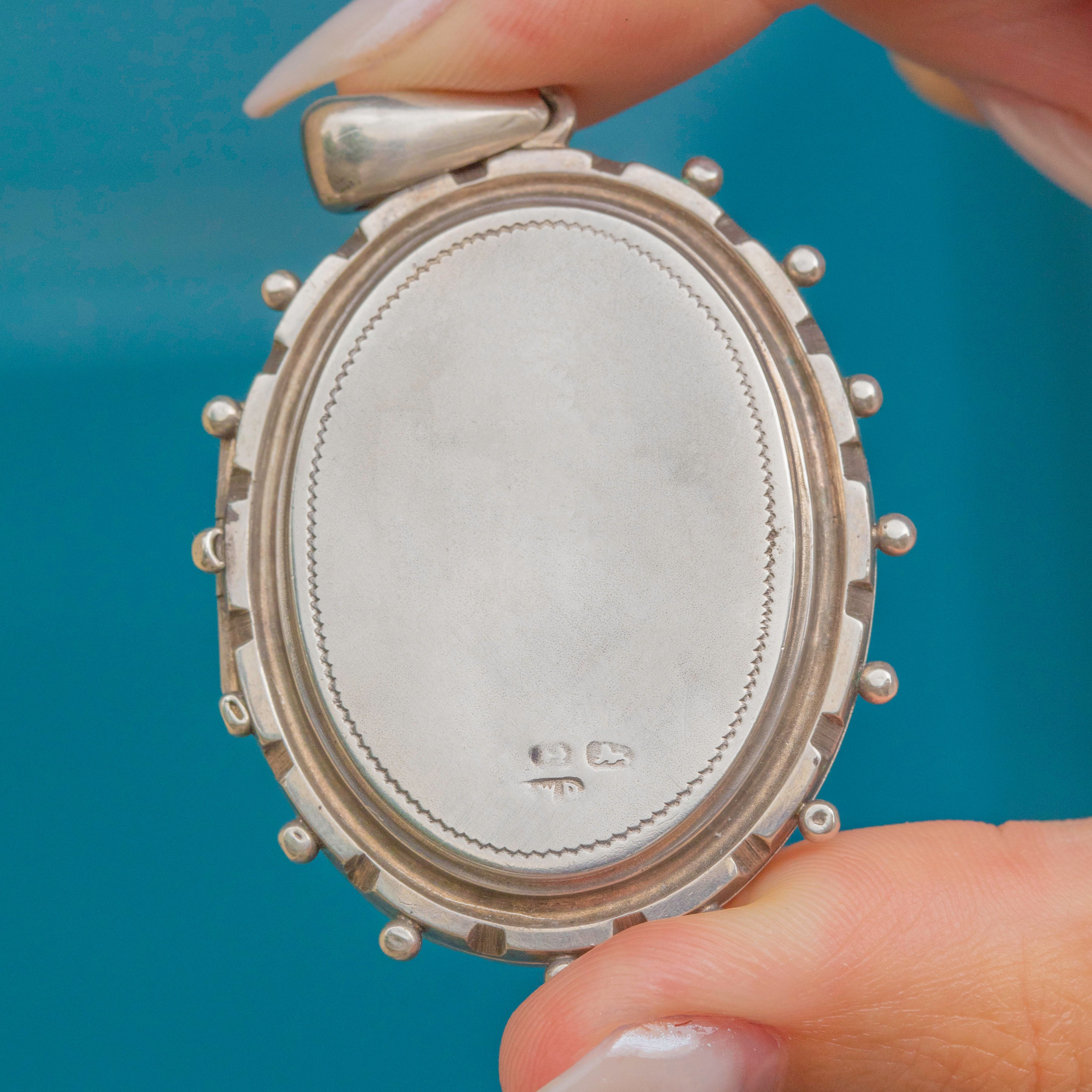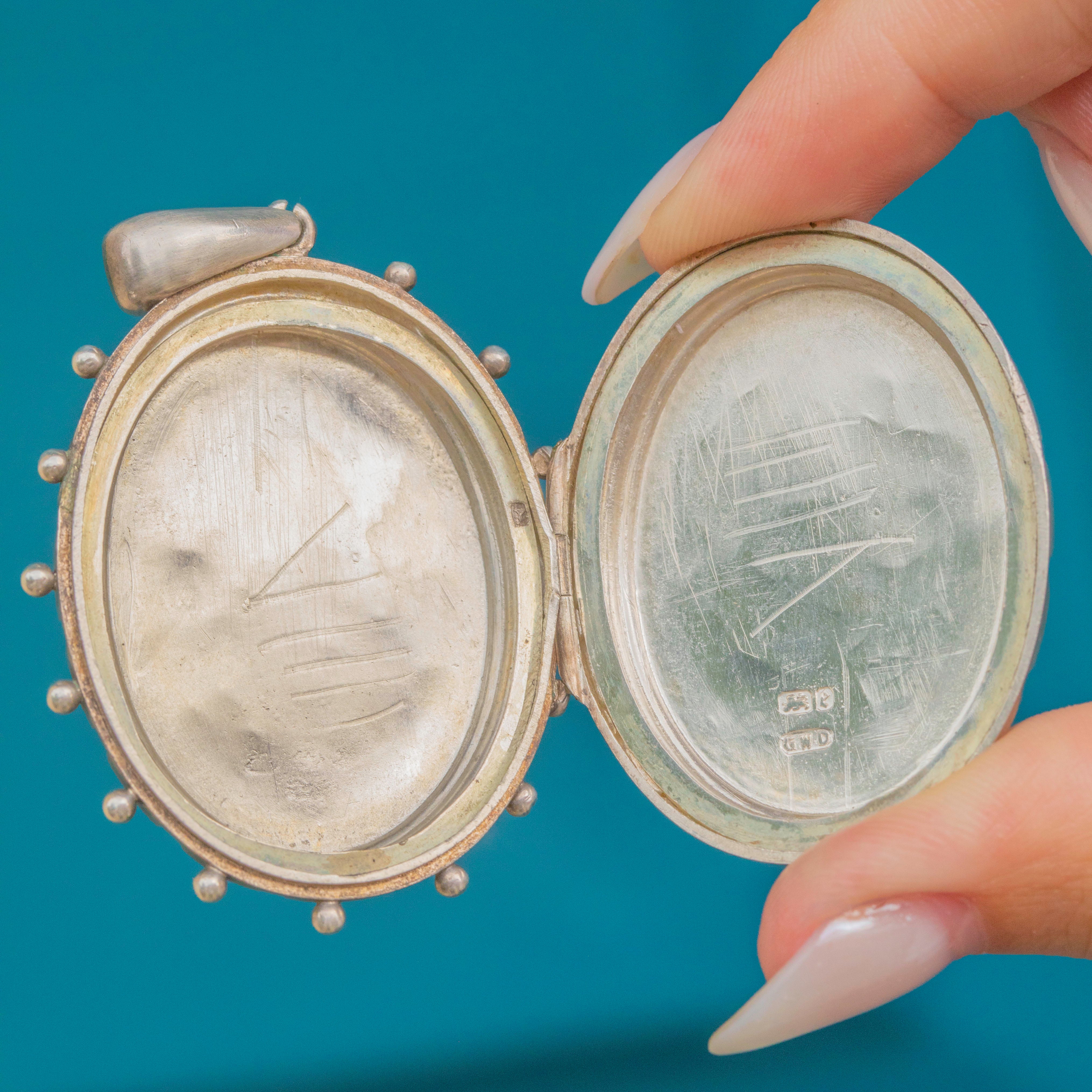 VERY GOOD. The Silver is bright and the engraved details are crisp, with only two thin scratches on the front, noticeable under close inspection. The back of the locket has some faded hallmarks, and the Silver has some dings to note. The inside of the locket is shiny, with two frames present. The beaded detailing has lasted really well, with only minor wear to note.
