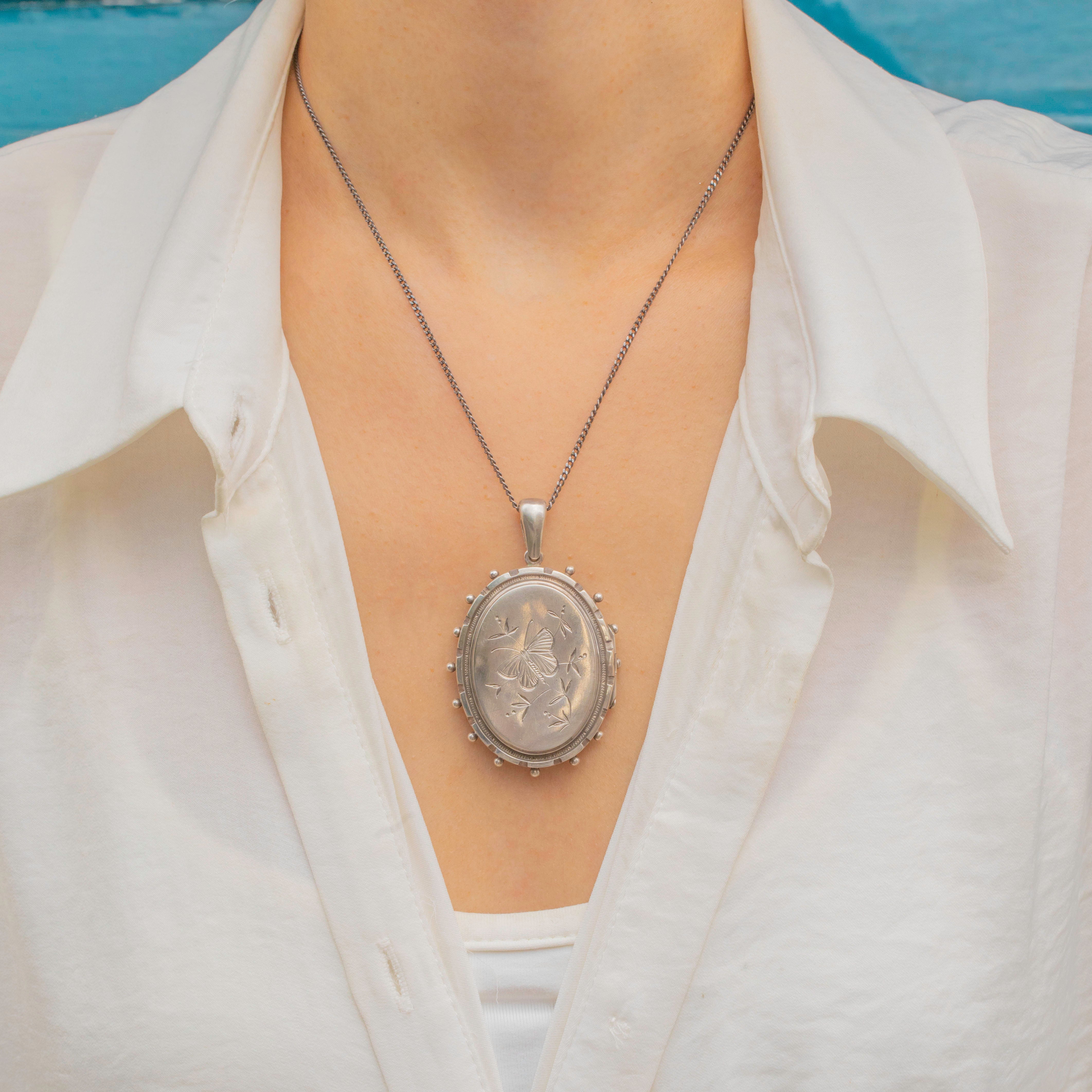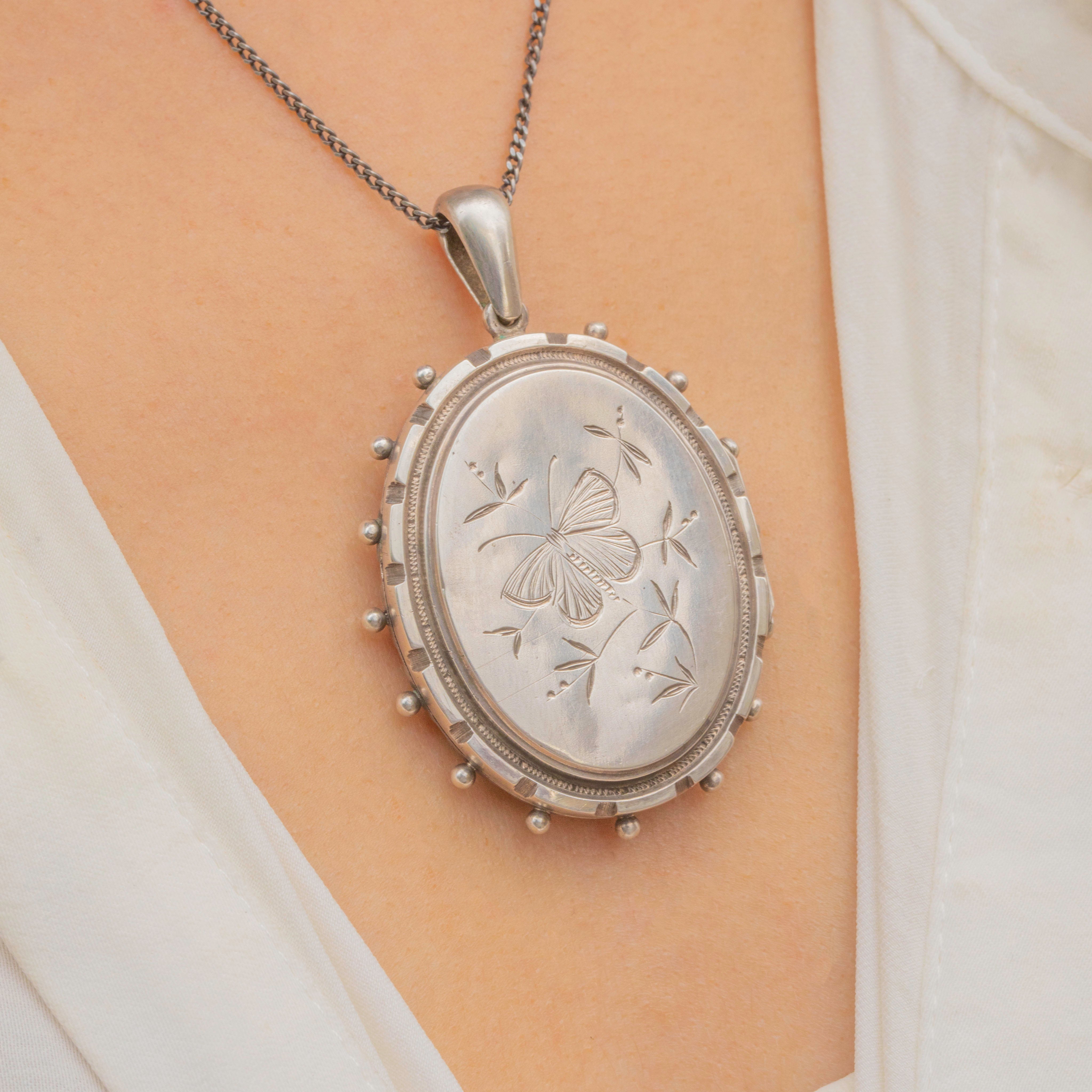 Victorian Sterling Silver Engraved Butterfly Oval Locket, c.1879 Item added
