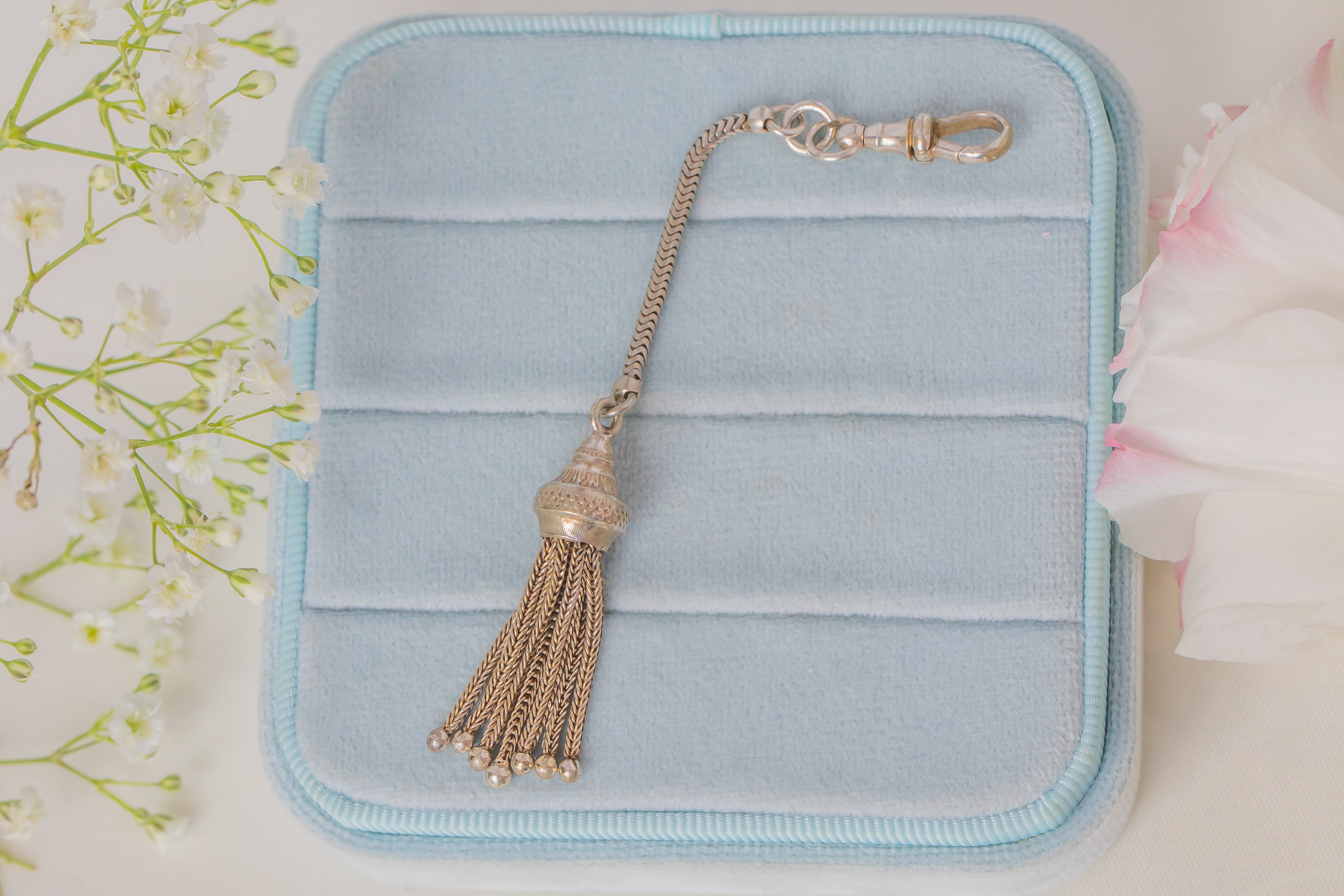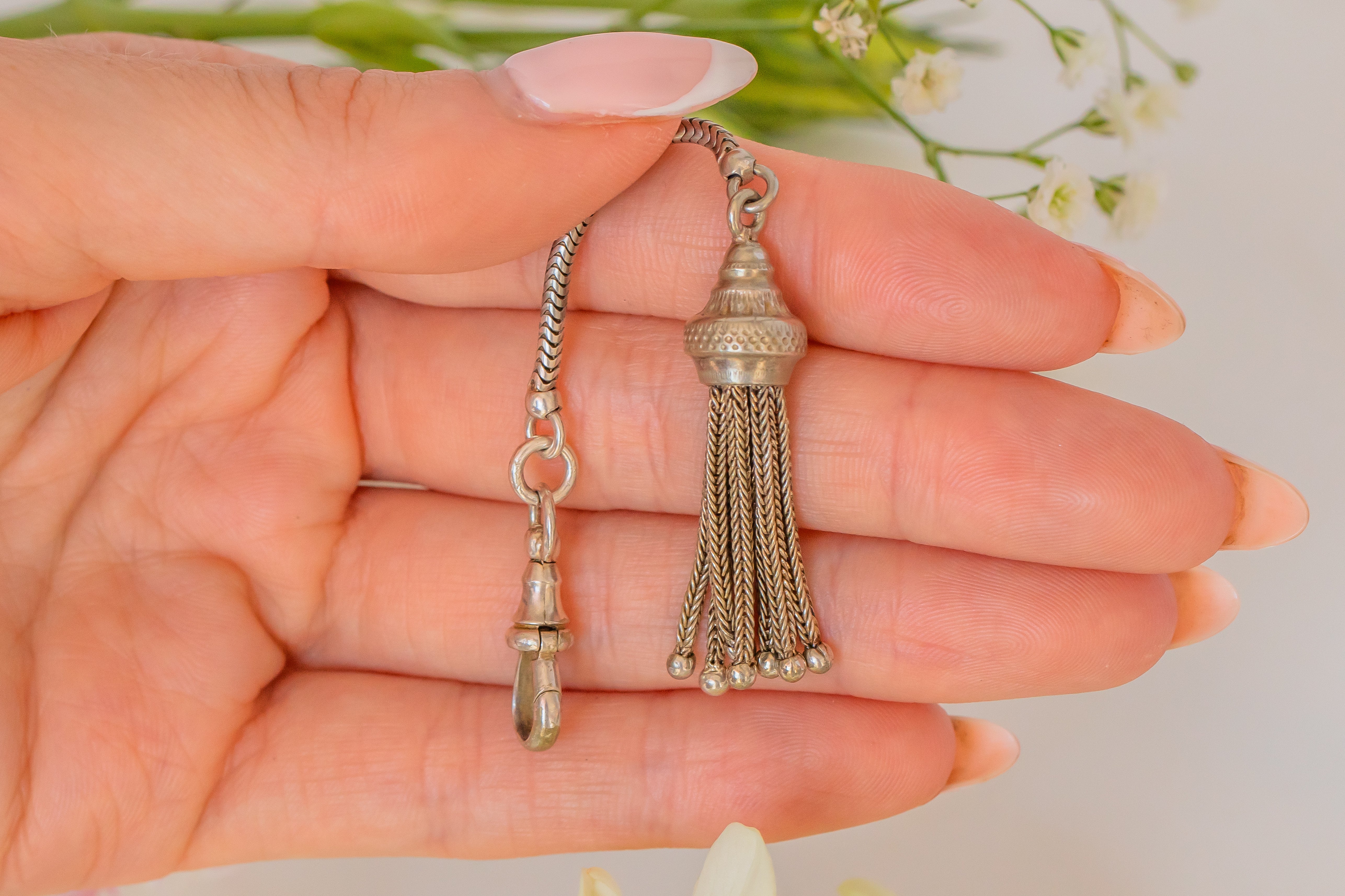 This Sterling Silver beauty boasts two of the Victorian's favourite features, a tassel and a dog clip! Wear with a Silver chain to have an extended pendant, or use the dog clip to attach some of your favourite charms.