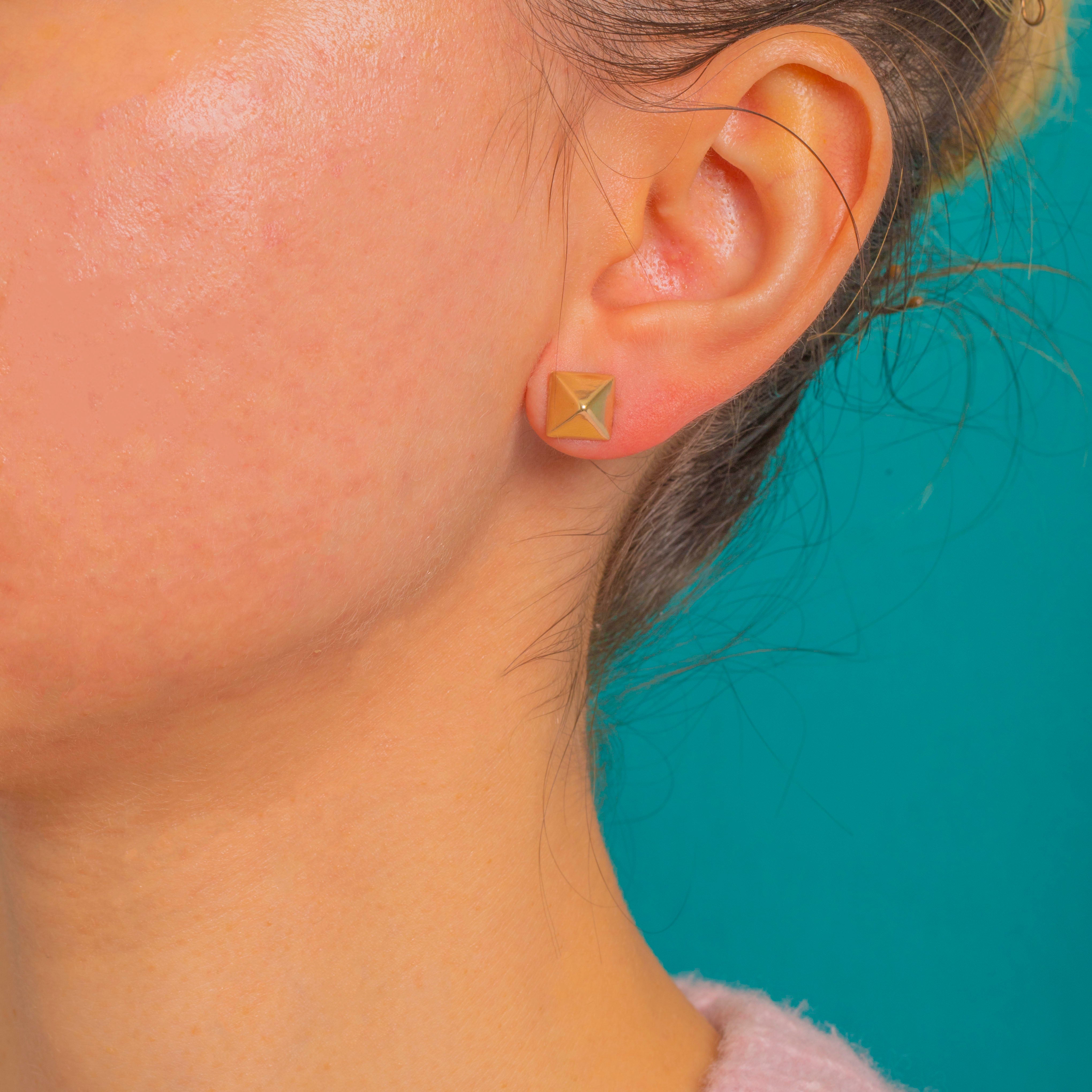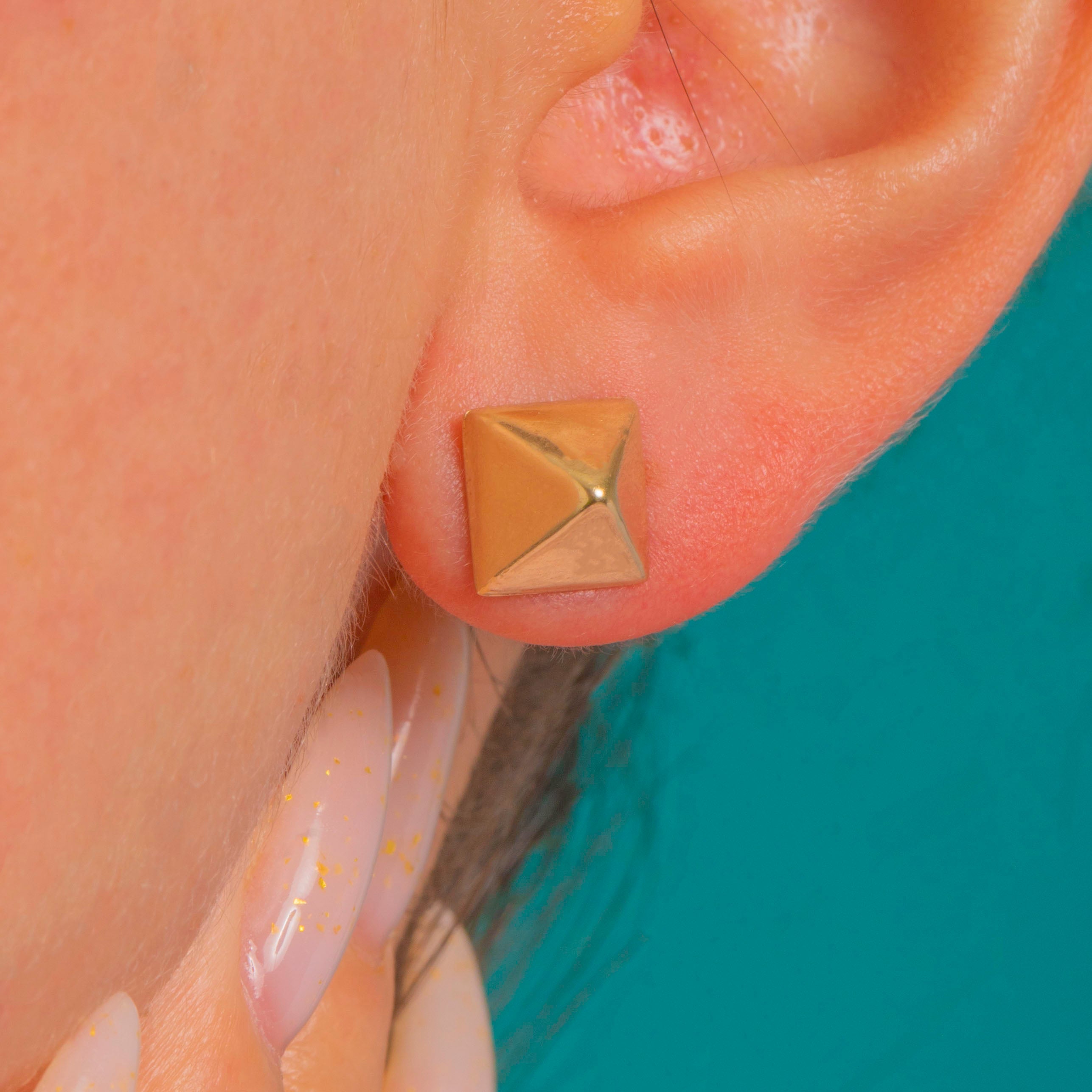 A compact pair of square‑pyramid stud earrings in warm 10ct Gold, their crisp four‑faceted forms rendered with an architectural, minimalist poise.