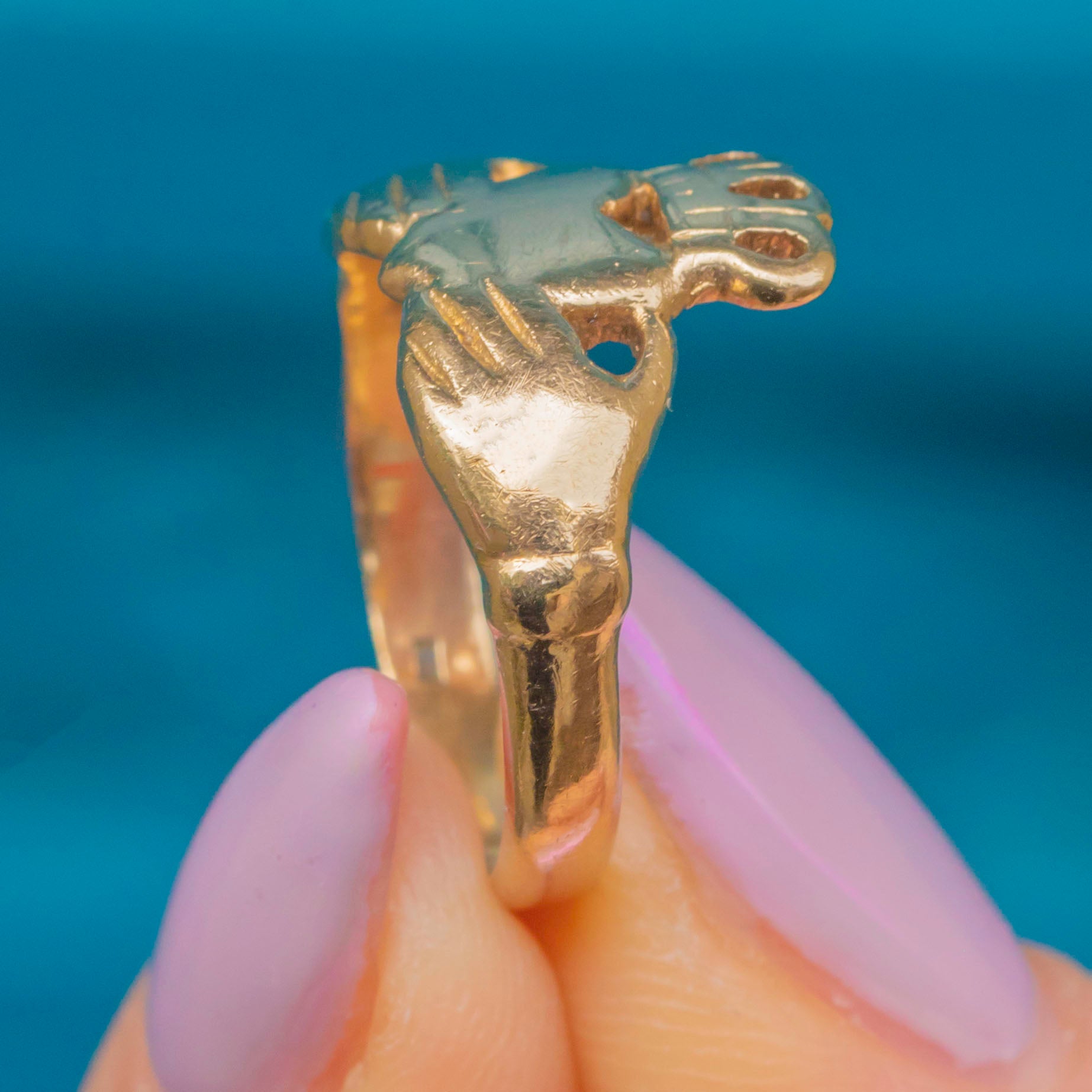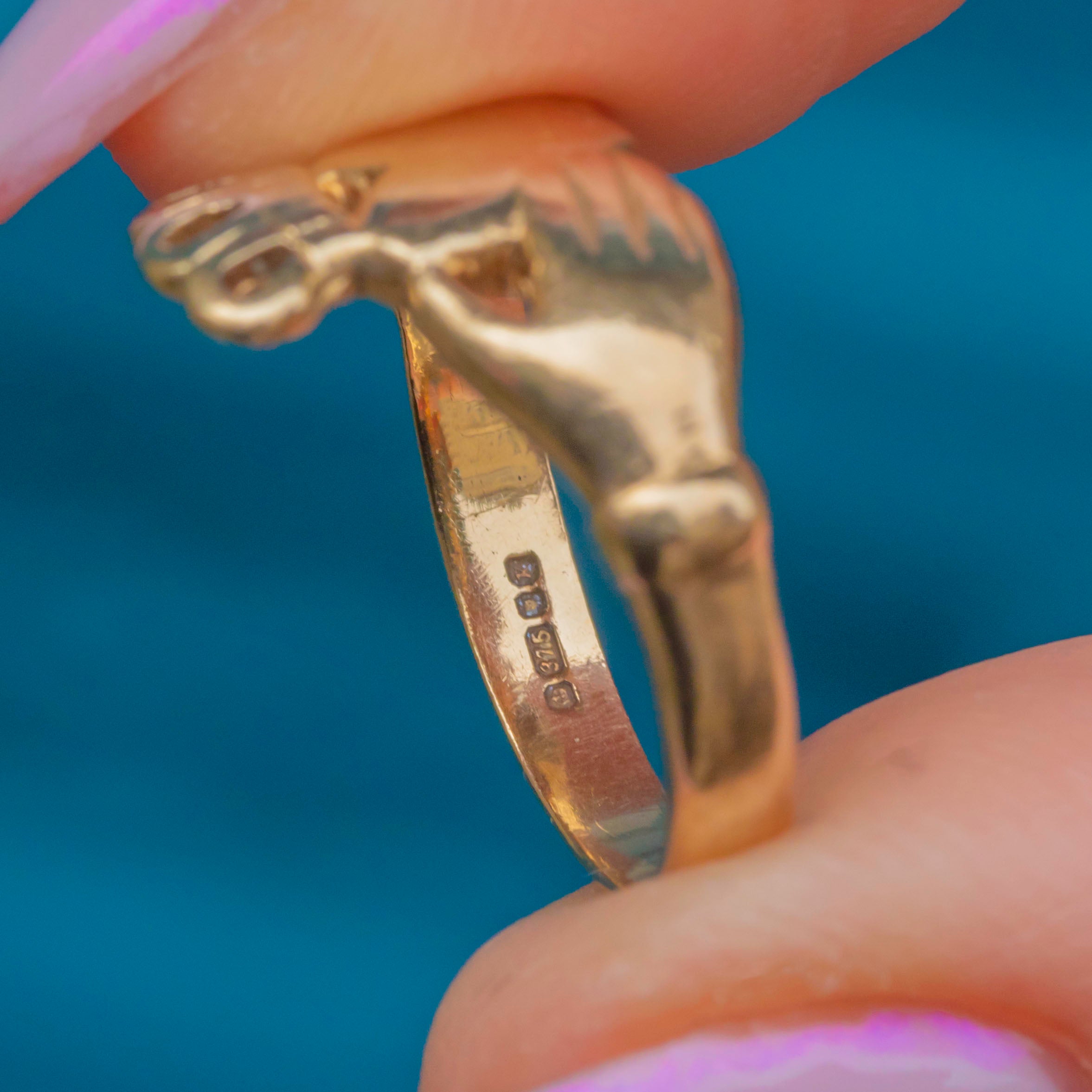 This traditional Claddagh ring is crafted in solid 9ct Gold, featuring the classic motif of two hands clasping a crowned heart, a timeless Irish symbol of love, loyalty and friendship. Beautifully made and richly polished, this vintage piece carries both sentiment and style.