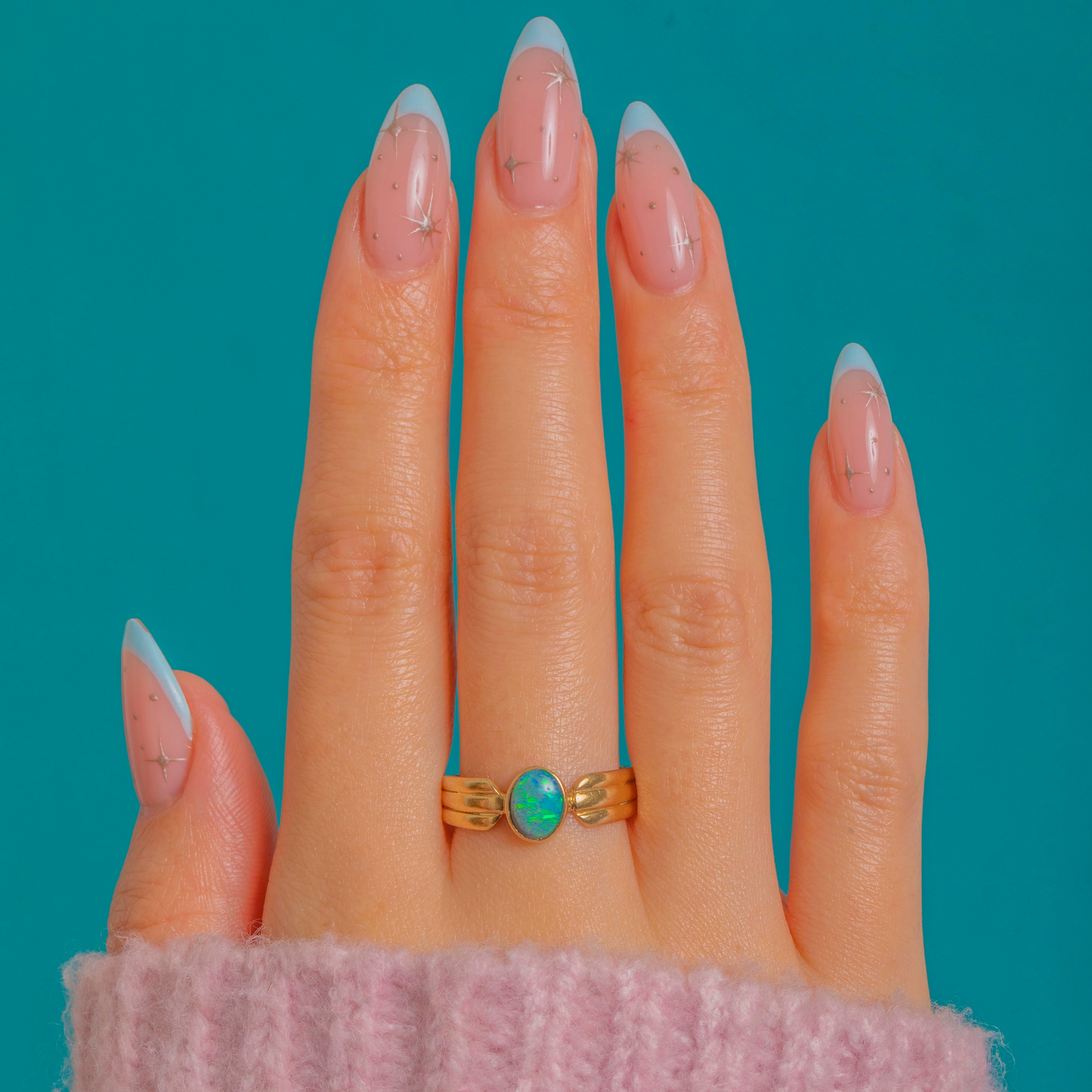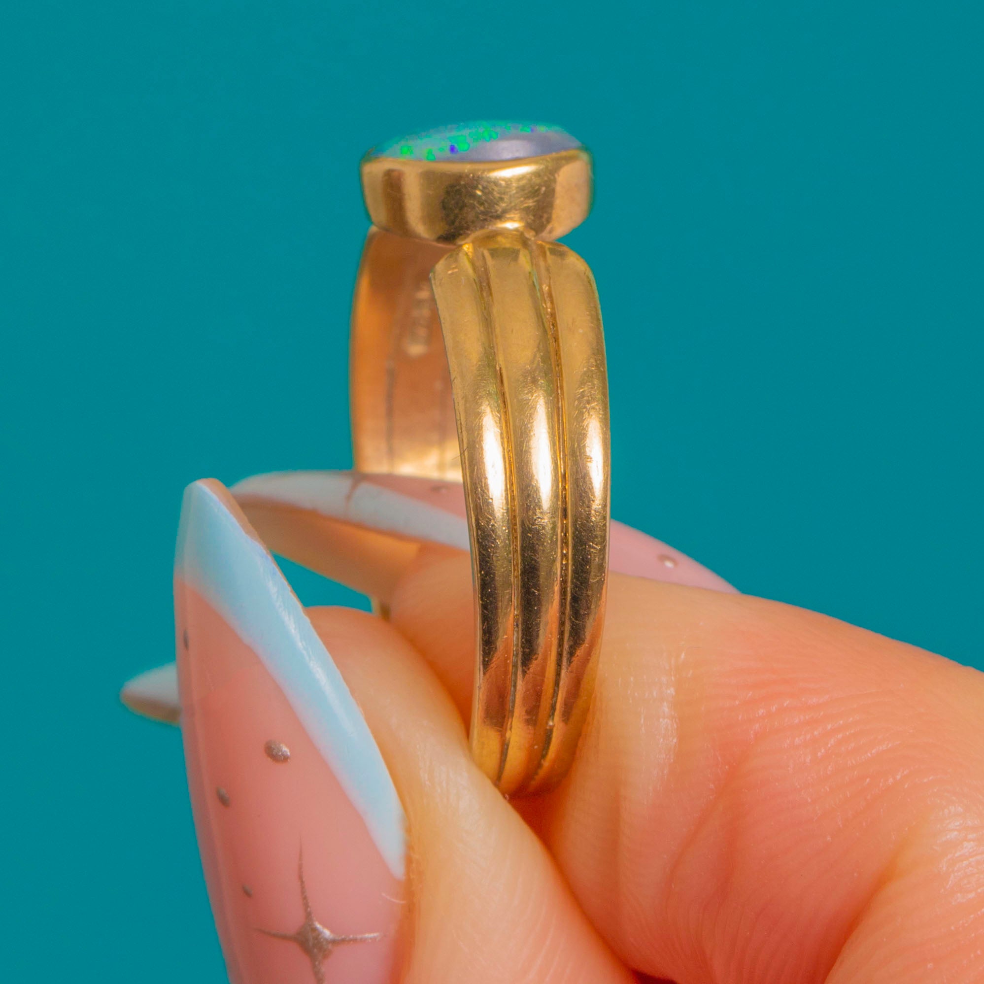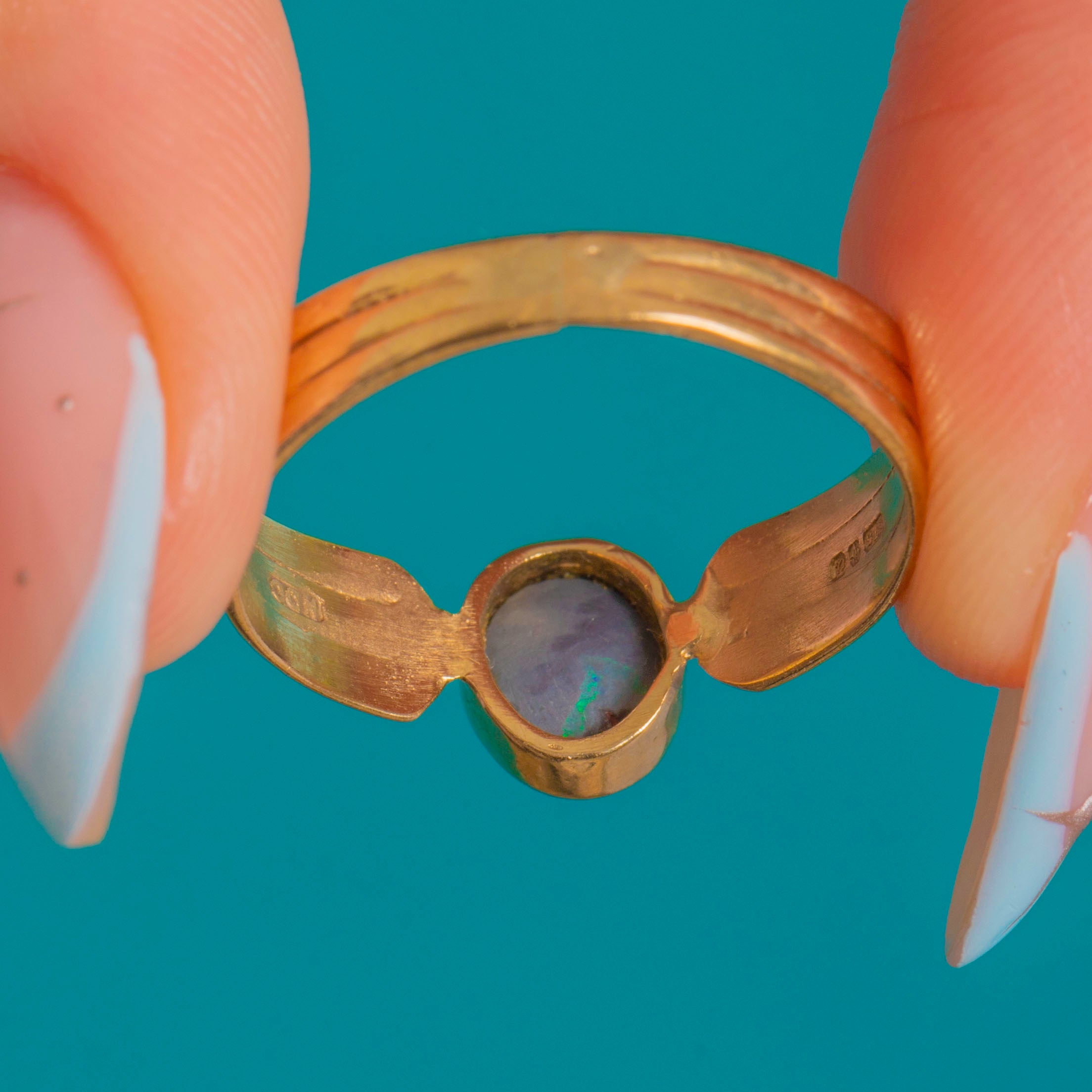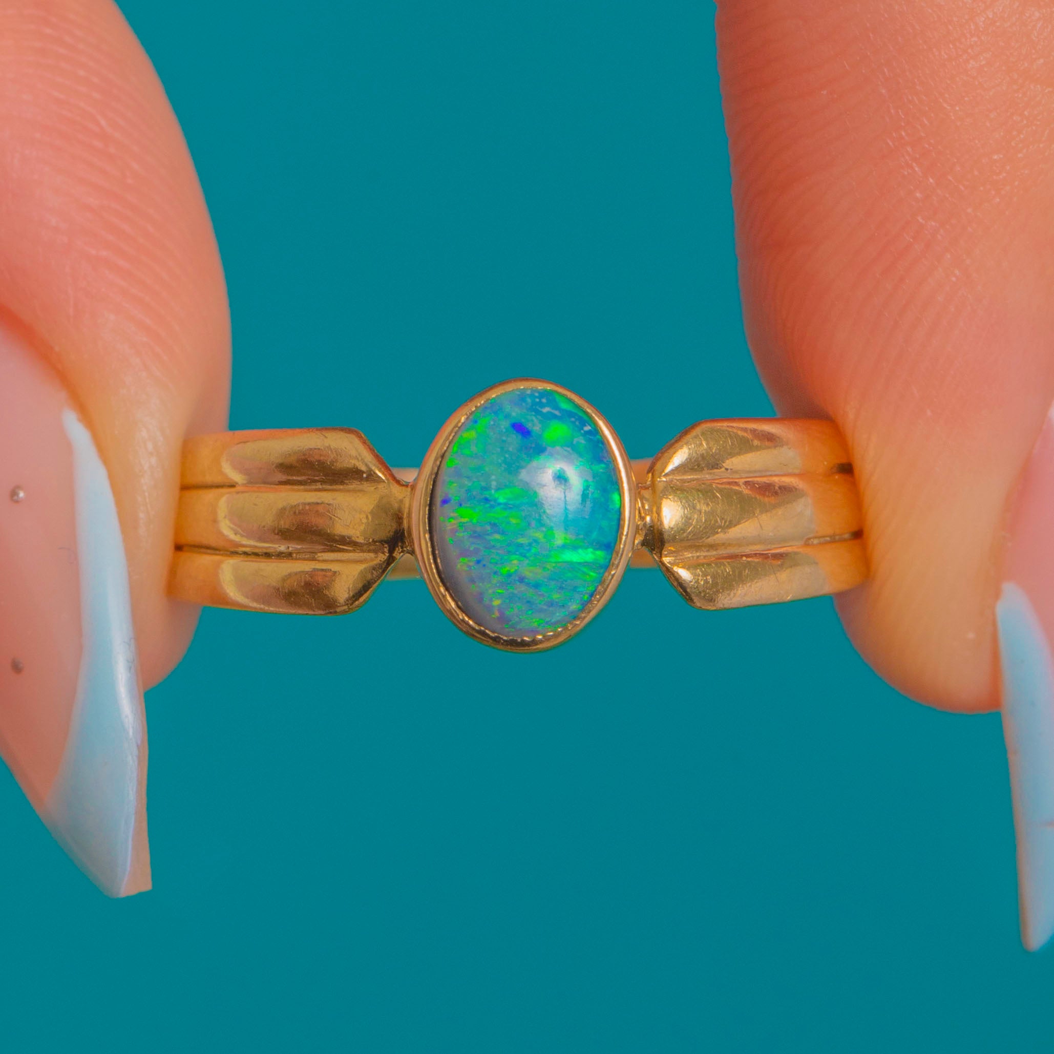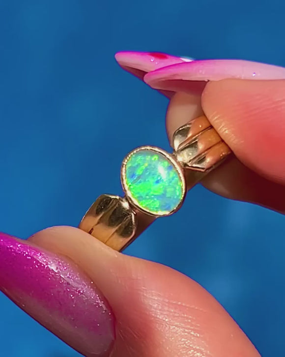 Sleek and sculptural, this Vintage Opal solitaire ring showcases a luminous oval cabochon in a smooth bezel of rich 9ct Gold. The Opal shimmers with blue‑green play‑of‑colour, its glow amplified by the ring’s low, polished setting for effortless, everyday elegance.