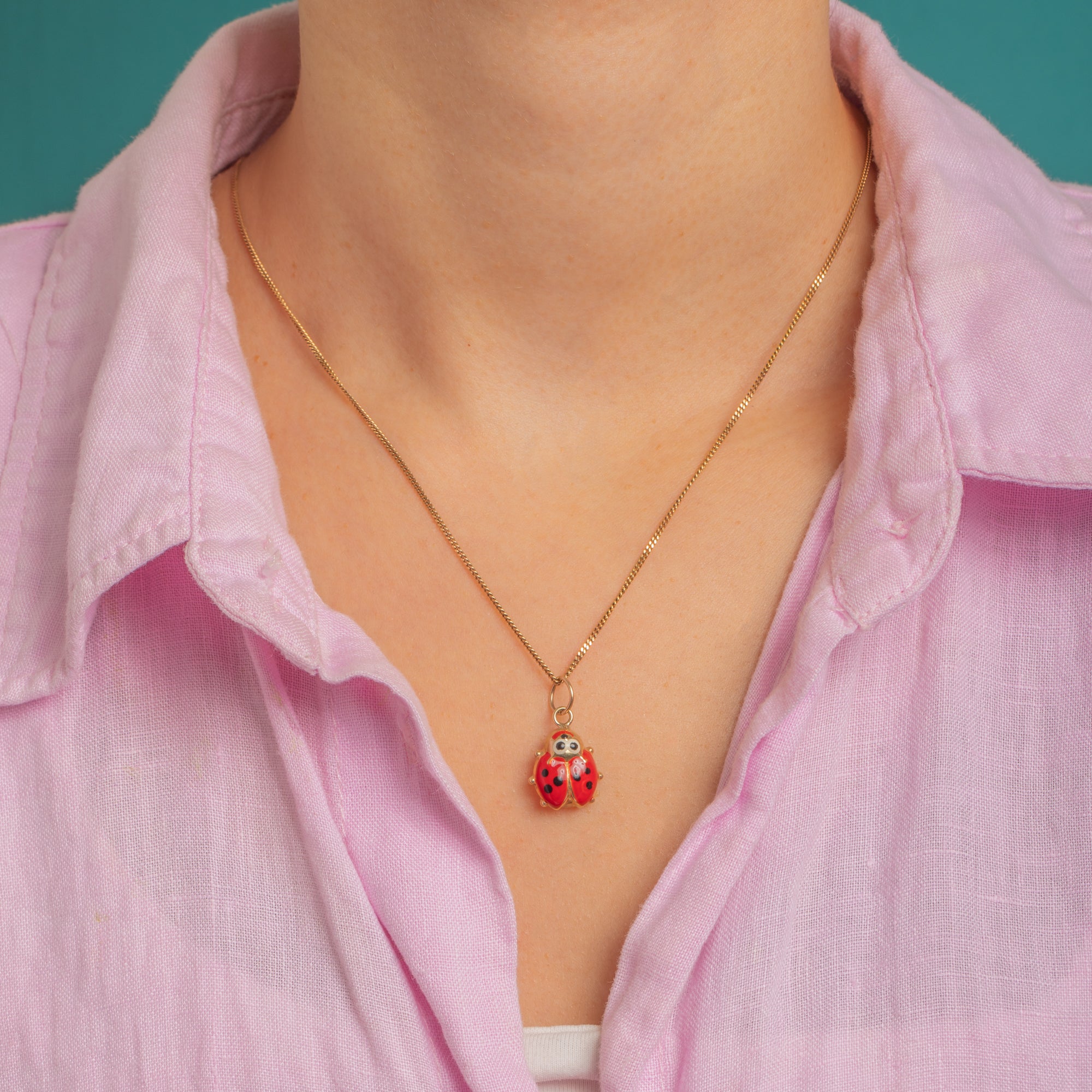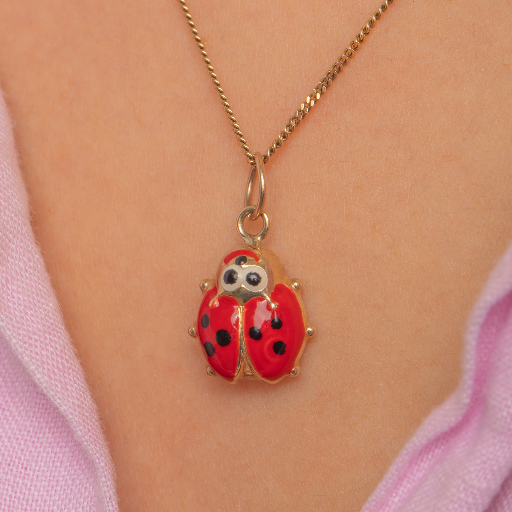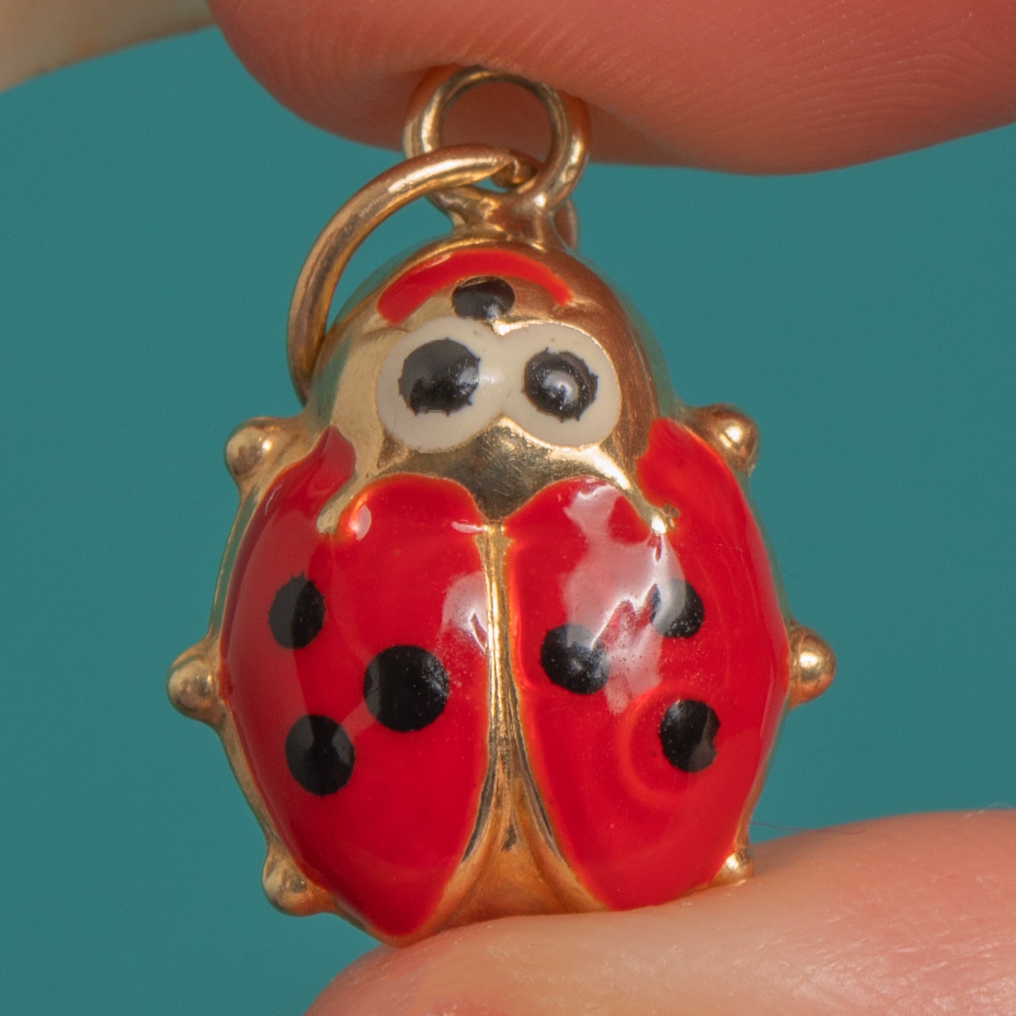 A joyful pop of colour in precious 9ct Gold, this Vintage ladybird charm is puffy and playful with glossy red and black Enamel. The domed body shows split wing covers dotted in black with sweet eye detail, delivering that irresistible, graphic look we all love.