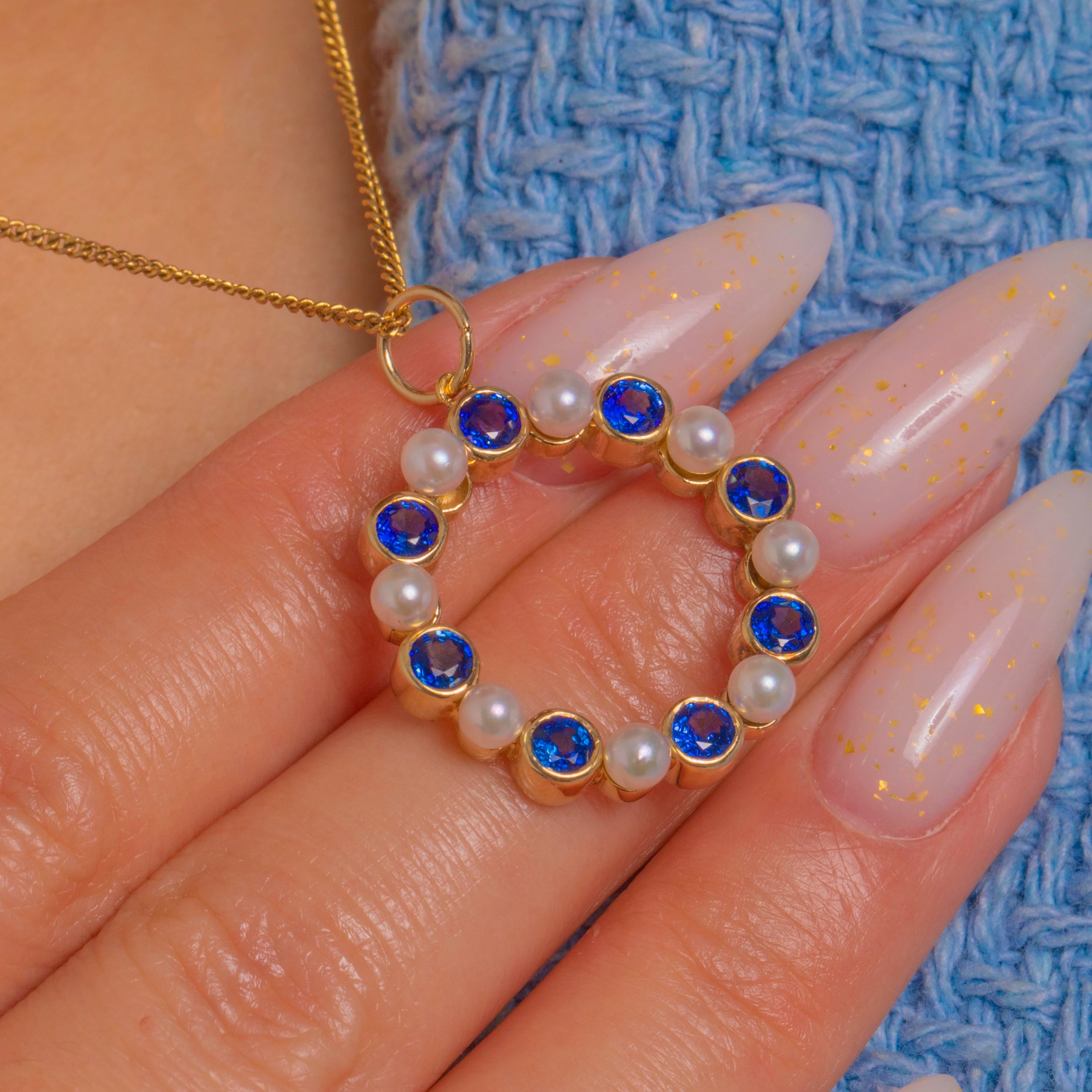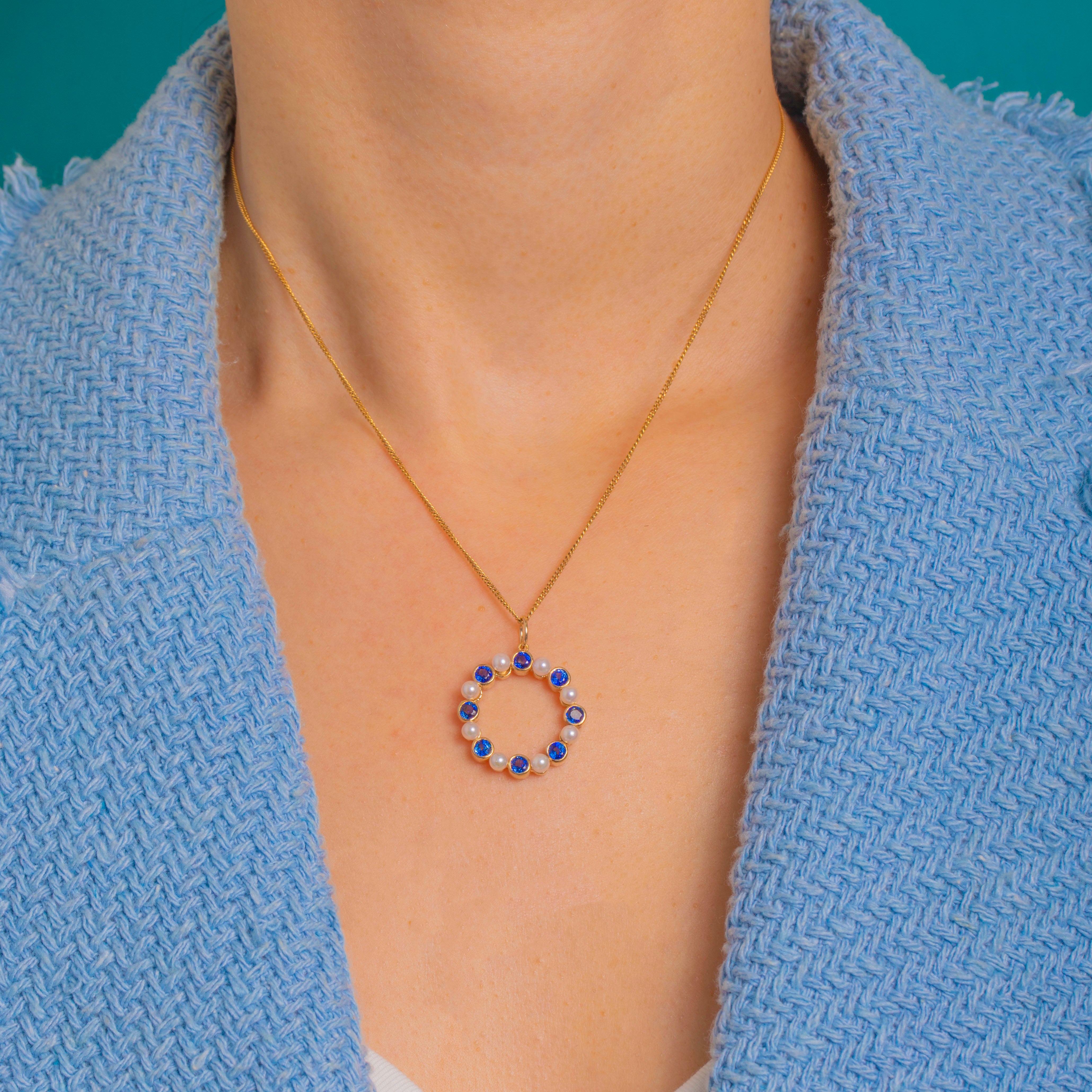 A chic Vintage wreath pendant in 9ct Gold, set with an elegant rhythm of round faceted Sapphires and luminous Pearls. The Sapphires are neatly embraced by smooth rub-over collets, creating a refined halo with a scalloped inner contour and a beautifully polished, golden glow.