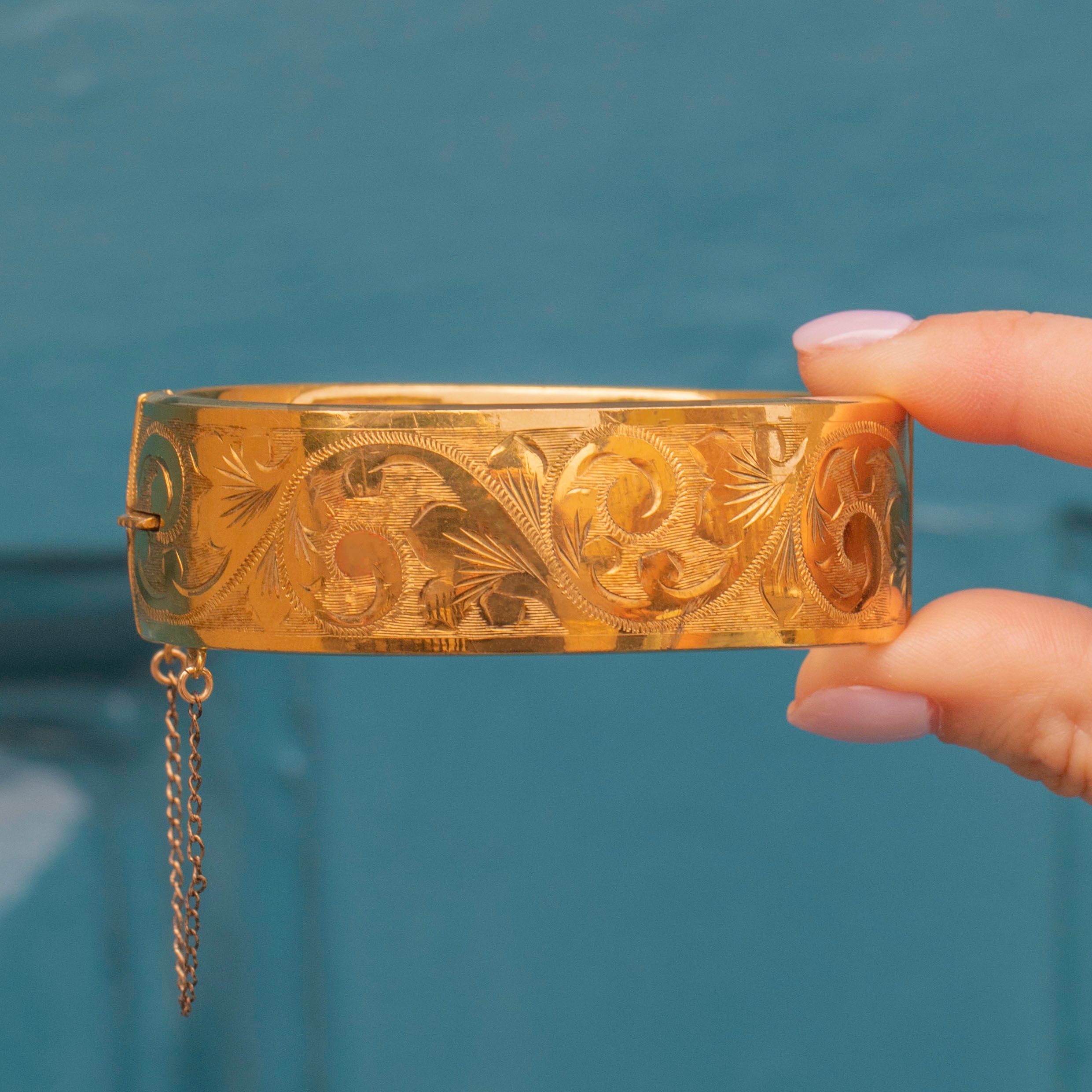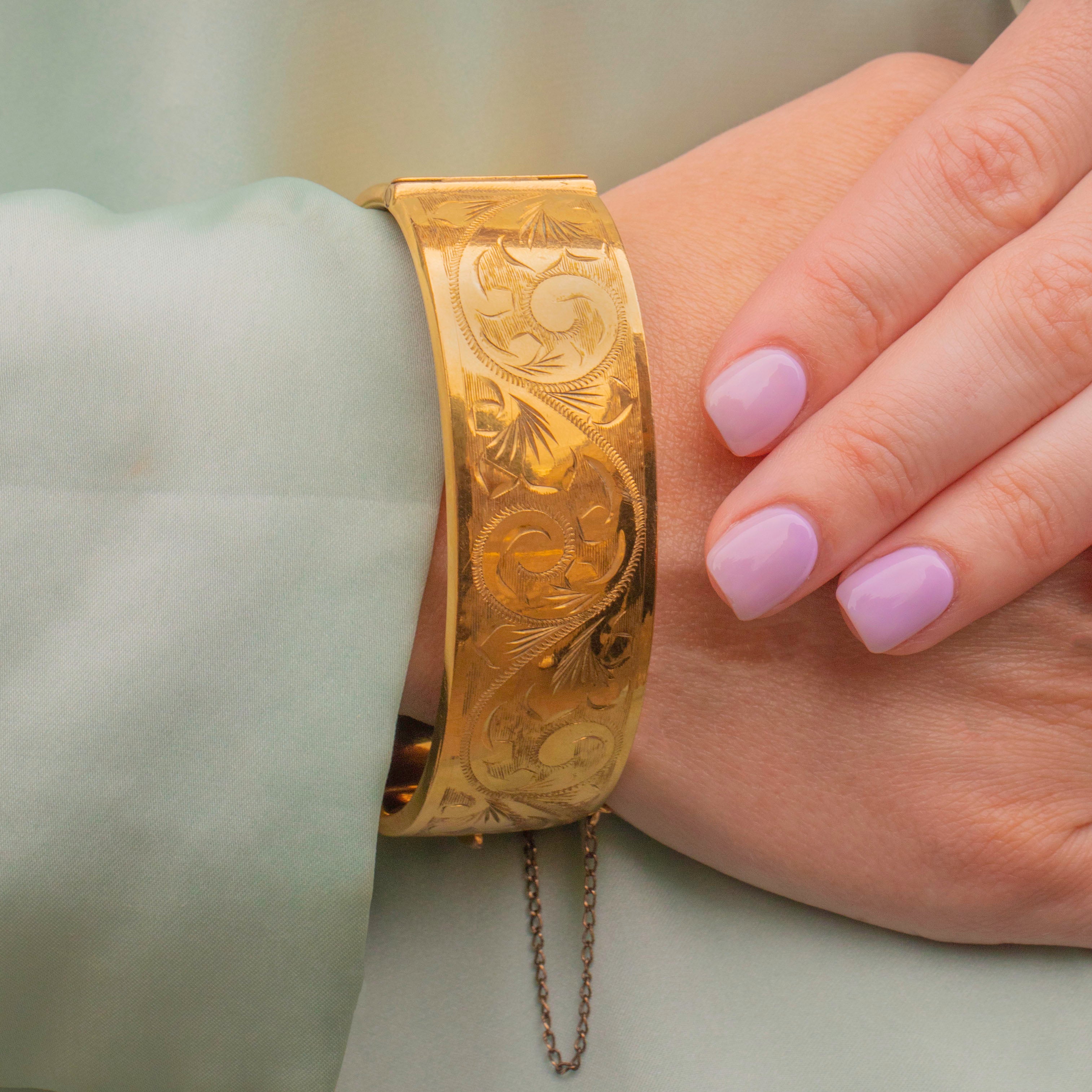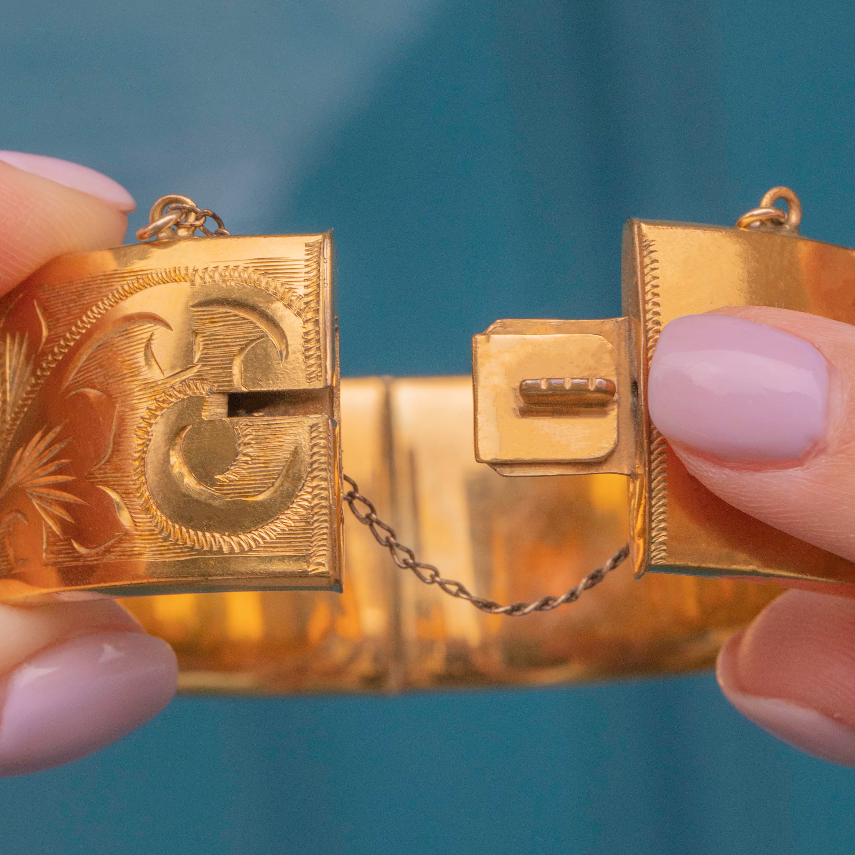 VERY GOOD: We bring this Vintage 9ct Rolled Gold engraved cuff bangle to you in wonderful condition. The 9ct Rolled Gold is akin to sunshine - rich, buttery and radiant! There is some wear to the inside and the back of the bangle, but nothing untoward given her Vintage age. The engravings are crisp with no signs of wear to note. The clasp shuts securely with a click so you can wear this vintage bangle with the utmost confidence.