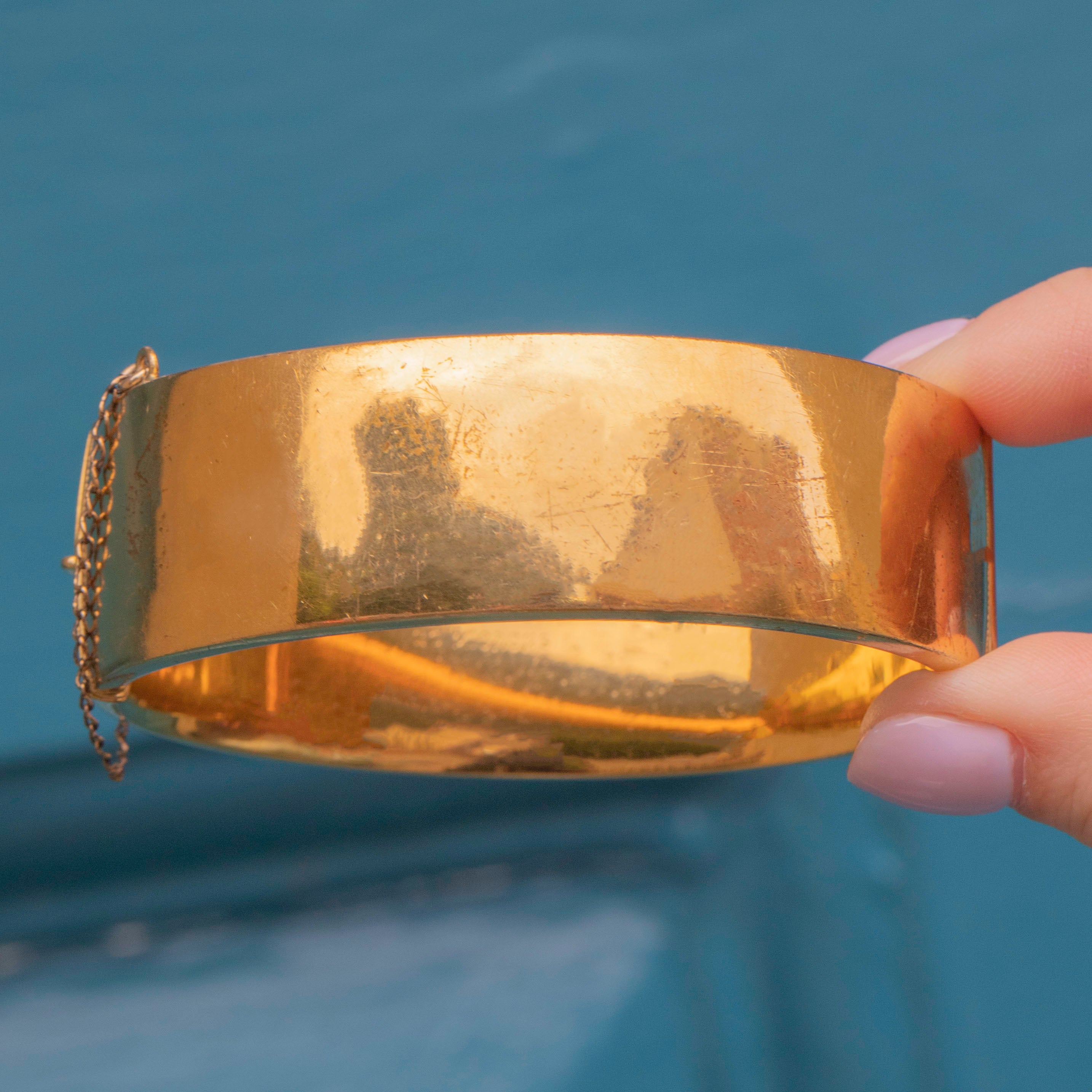 Providing great wrist coverage and crafted from buttery 9ct rolled Gold, she is perfect for dressing up an everyday outfit. Chunky and glossy, you can't go wrong with this delightful vintage bangle!