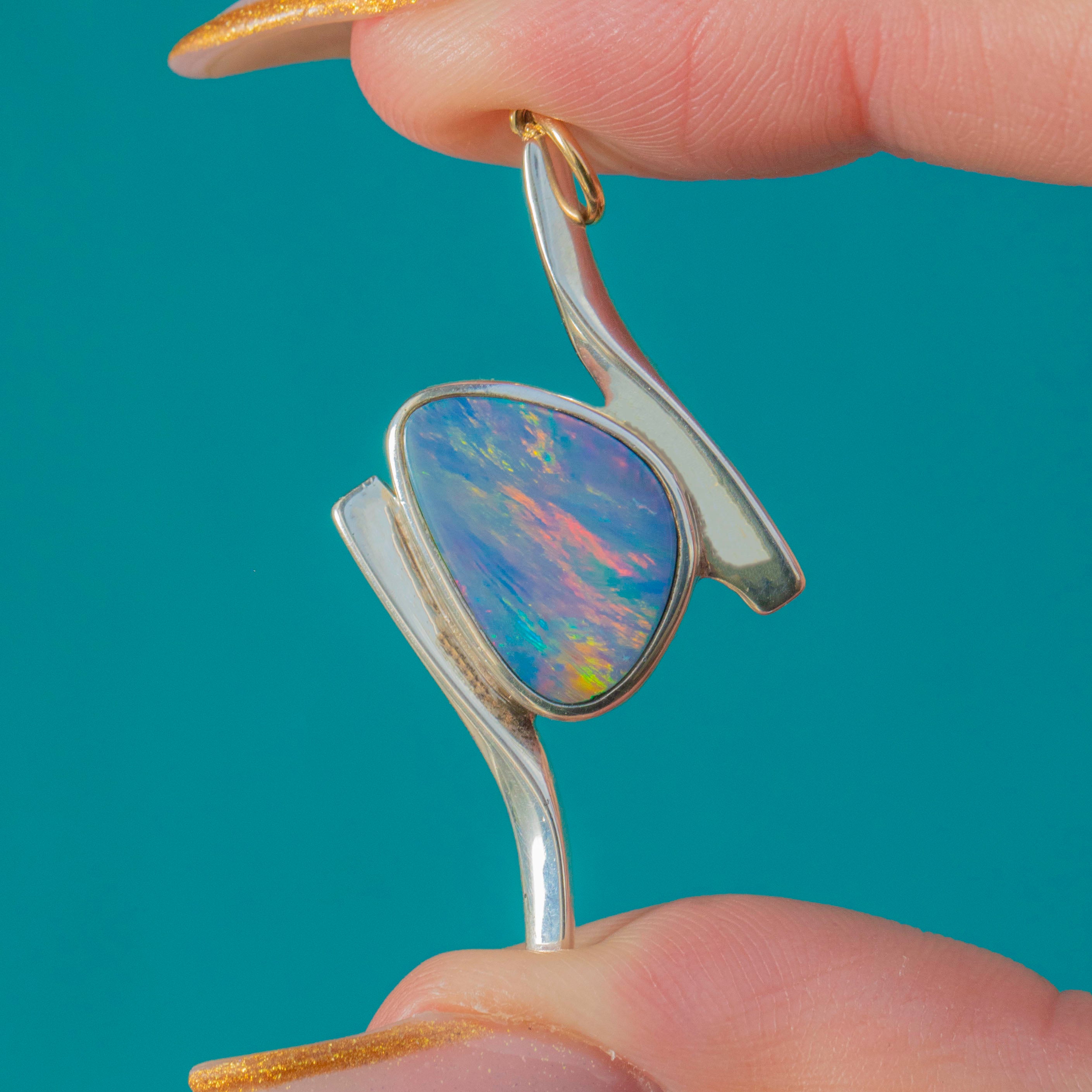 EXCELLENT: The Opal doublet is secure in its setting with no chips or cracks visible under close inspection. The Silver setting and curves are in excellent condition with only light surface wear in keeping with age. Overall the pendant has been well cared for and presents beautifully.