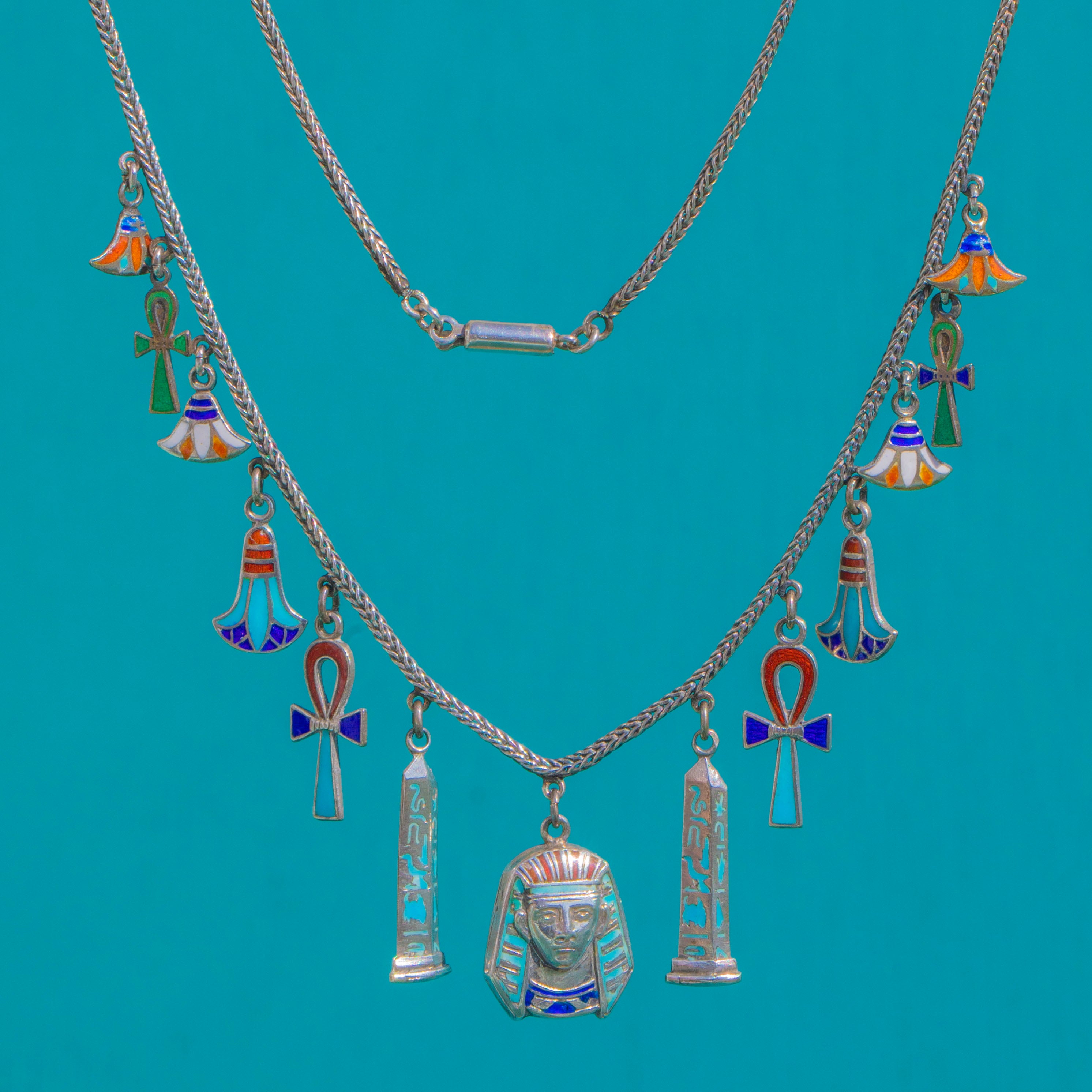 Art Deco Silver Egyptian Revival Enamel Necklace with Tutankhamen head