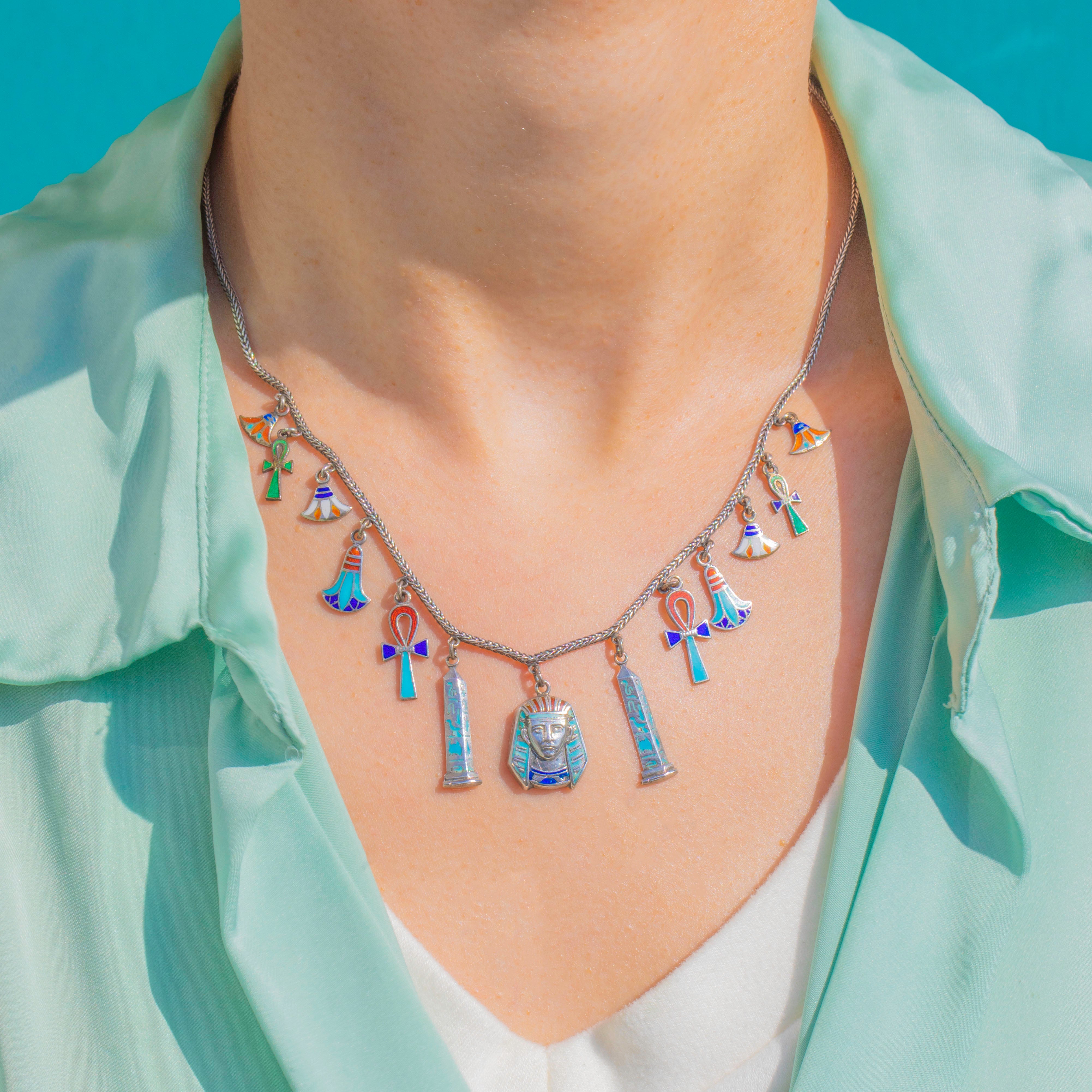 Vivid and full of movement, this Vintage Silver Egyptian Revival charm necklace brings together a rope chain with a parade of colourful Enamelled motifs. A bold Tutankhamun head sits among ankhs, cartouche and obelisk-style panels with hieroglyphic detailing, and lotus-like drops, each charm articulated on small jump rings for a playful, kinetic drape. The palette glows in turquoise, deep cobalt, green, orange-red and white, with a neat barrel clasp completing the collarbone-length silhouette.