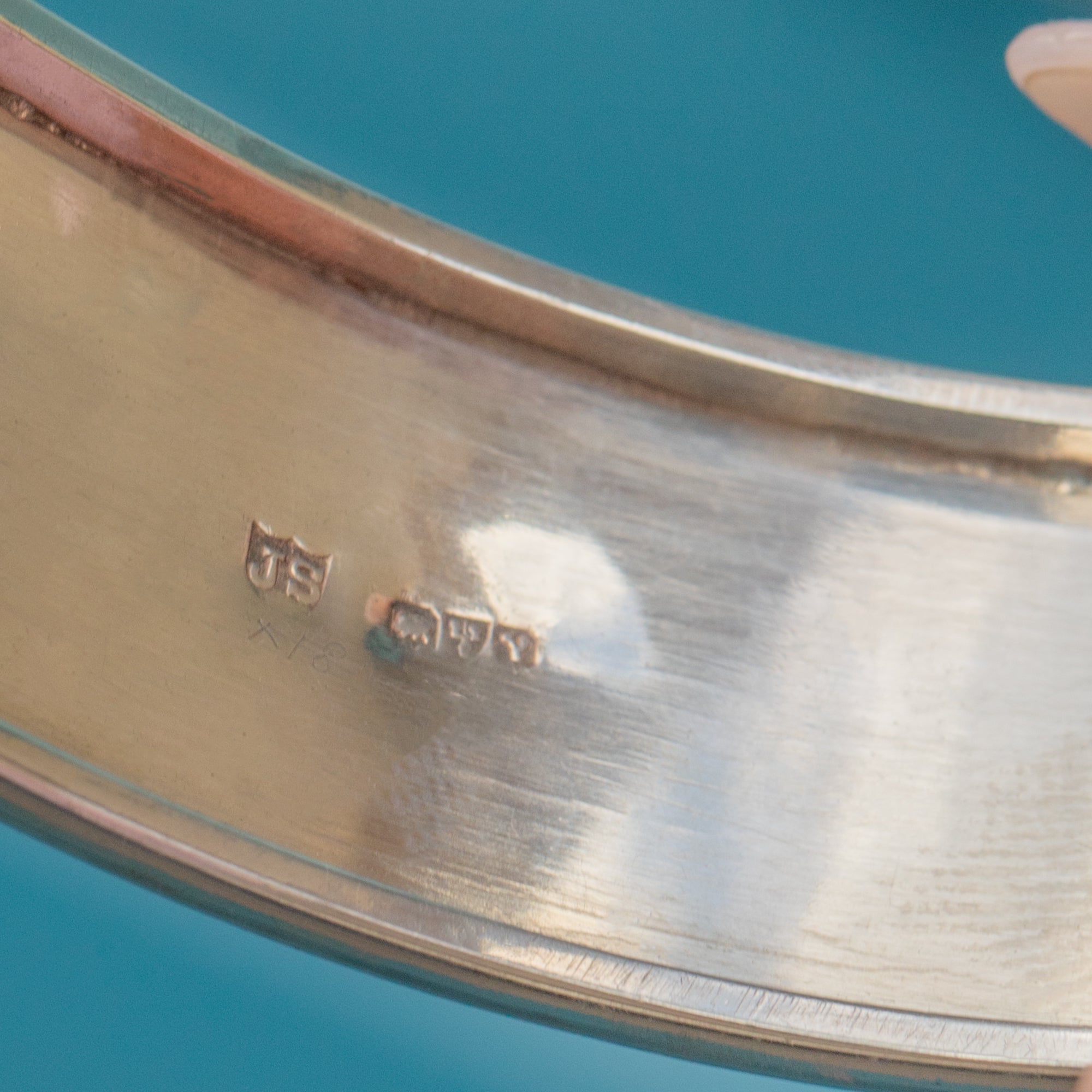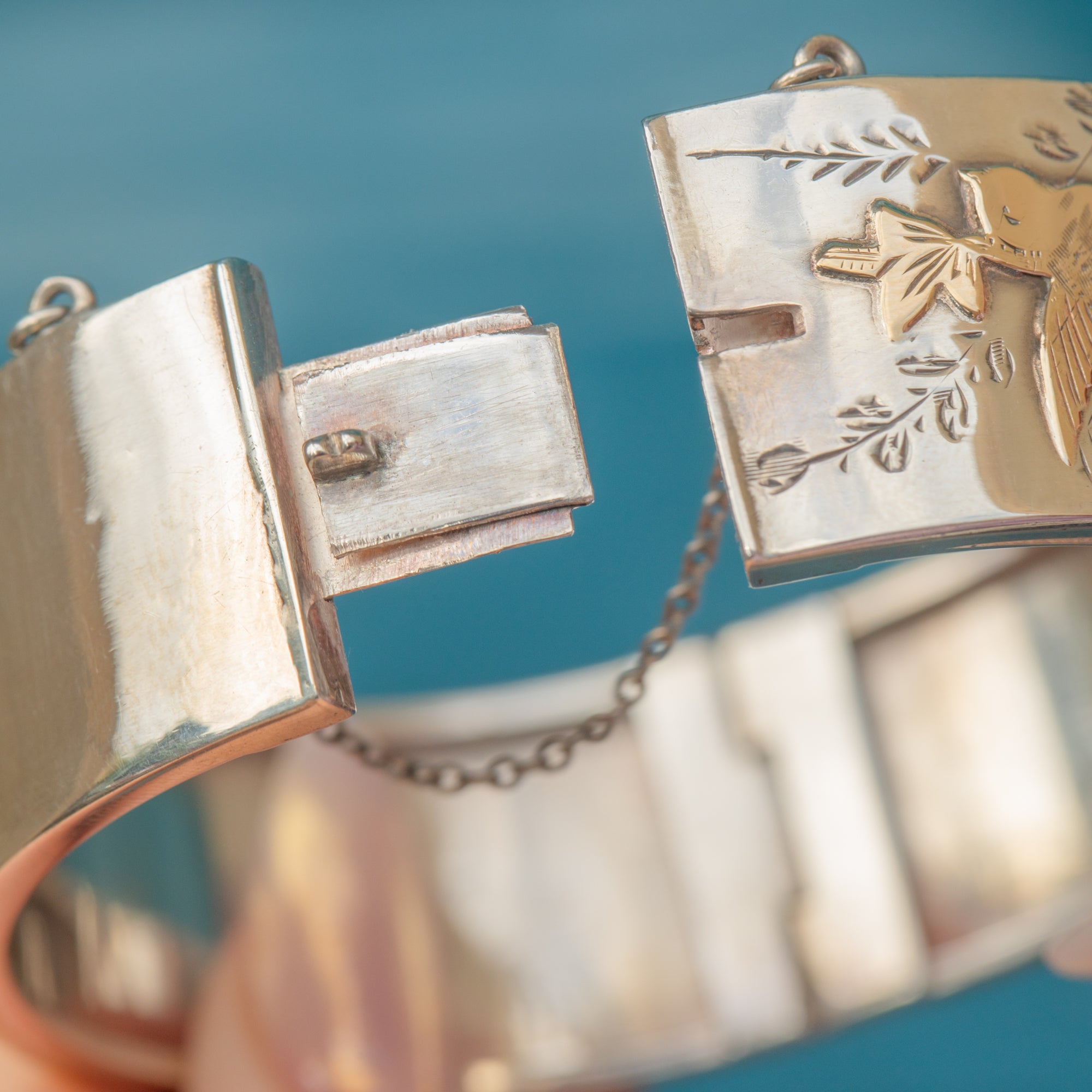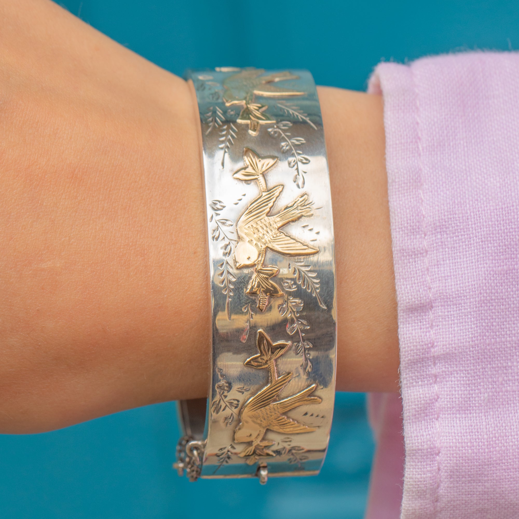 This mid-century vintage bangle is crafted in Sterling Silver and decorated with 9ct Gold bird motifs in the Aesthetic style. The detailed engraving and applied birds bring texture and symbolism to the piece, representing peace and renewal in the post-war era.