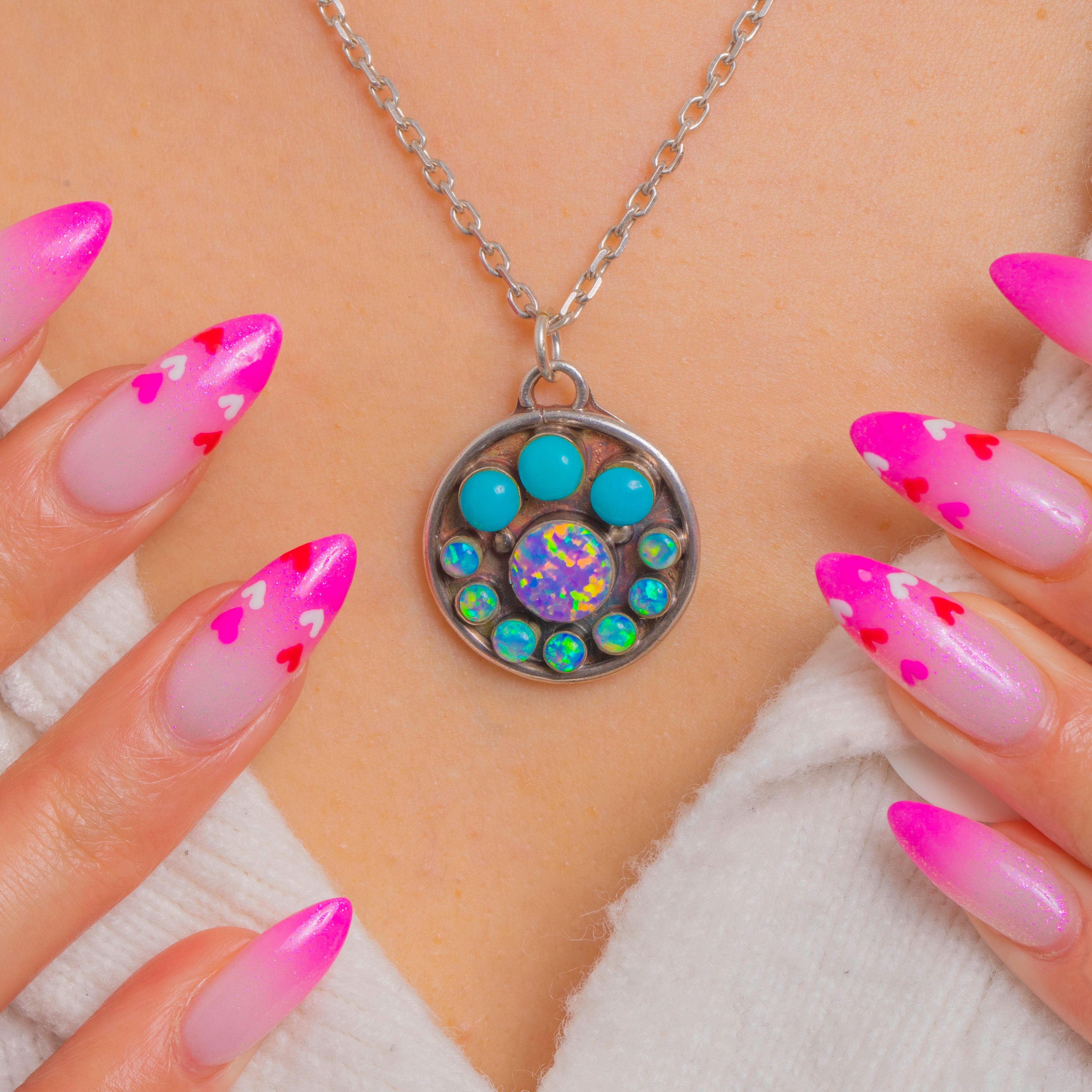 A vibrant Vintage pendant necklace brimming with colour and texture. A domed Opal Doublet shimmers at the centre with electric greens, blues and violets, encircled by a halo of smaller Opal Doublet cabochons for a glowing, mandala-like effect. Three bright Turquoise cabochons crown the composition, lending a joyful pop of sky-blue contrast.