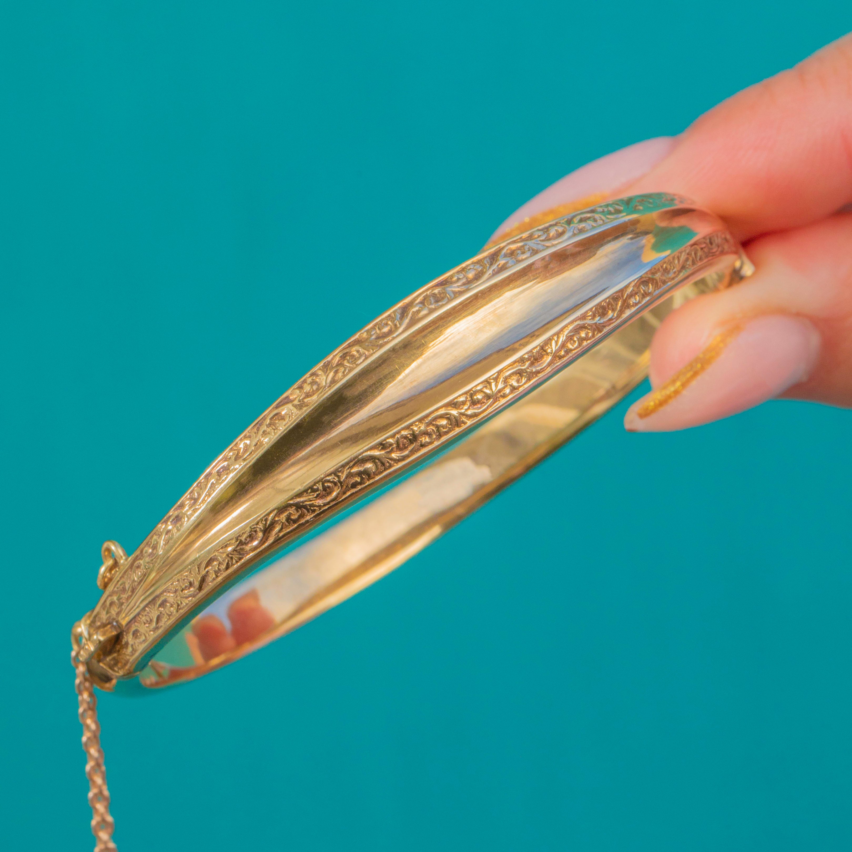 This Vintage solid 9ct Gold bangle is a beautifully wearable classic from 1970. The front is softly domed and richly engraved, giving it a pretty, decorative feel while the back is smooth and comfortable against the wrist.