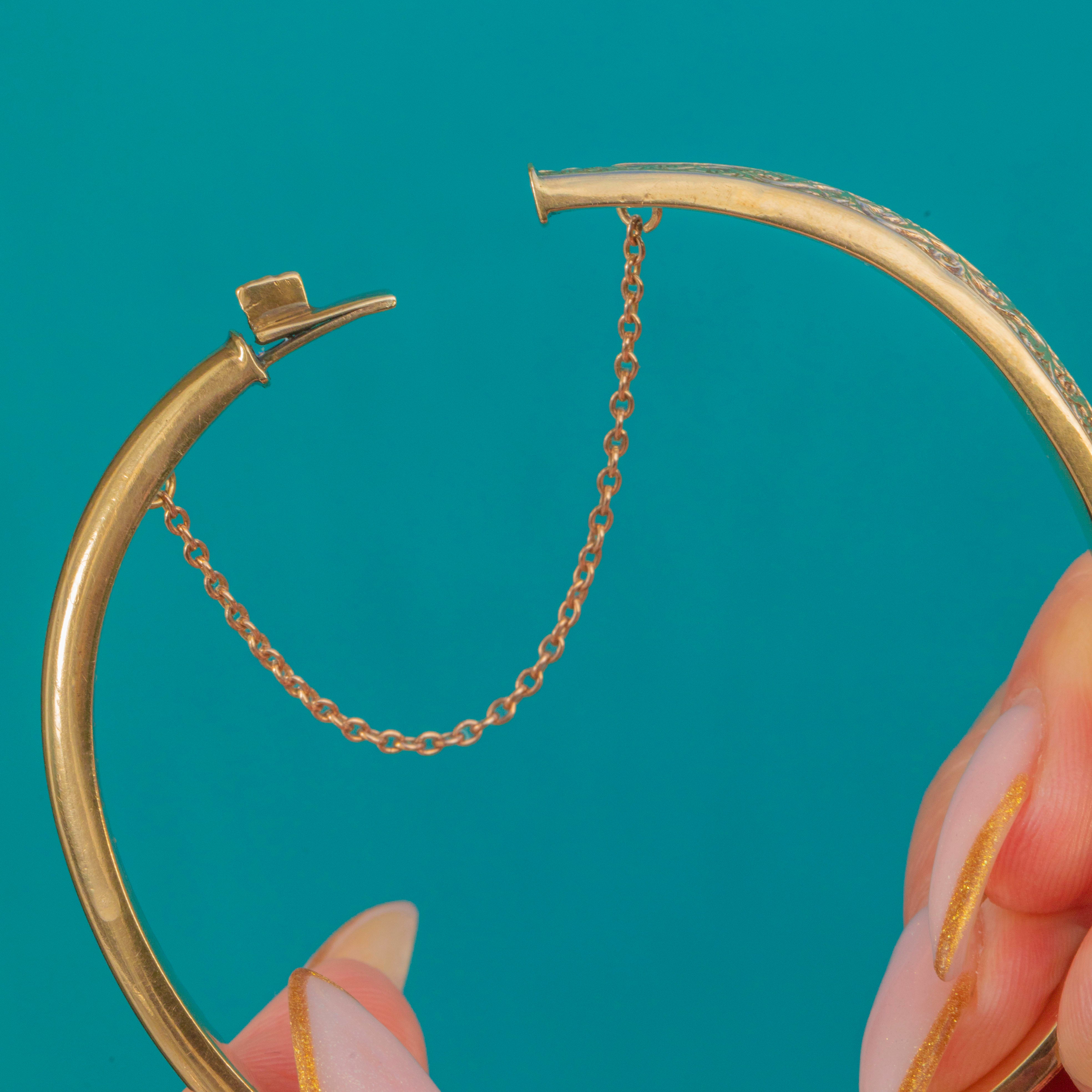 EXCELLENT: The engraved front panel is crisp and well-defined with only light surface wear visible under close magnification. The hinge and clasp are in perfect working order, closing securely as they should. There are no dings, dents or distortions to the bangle, and overall it has been very well cared for.