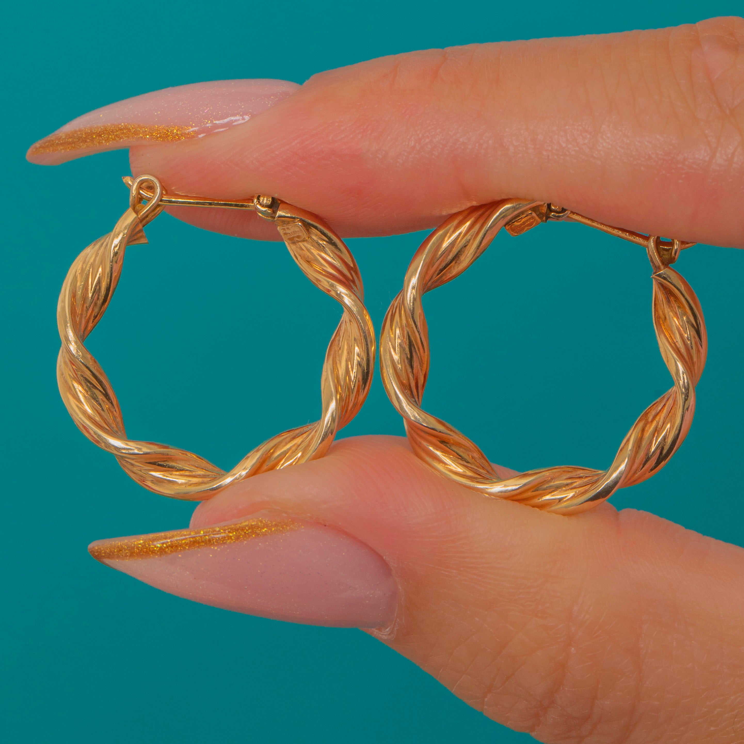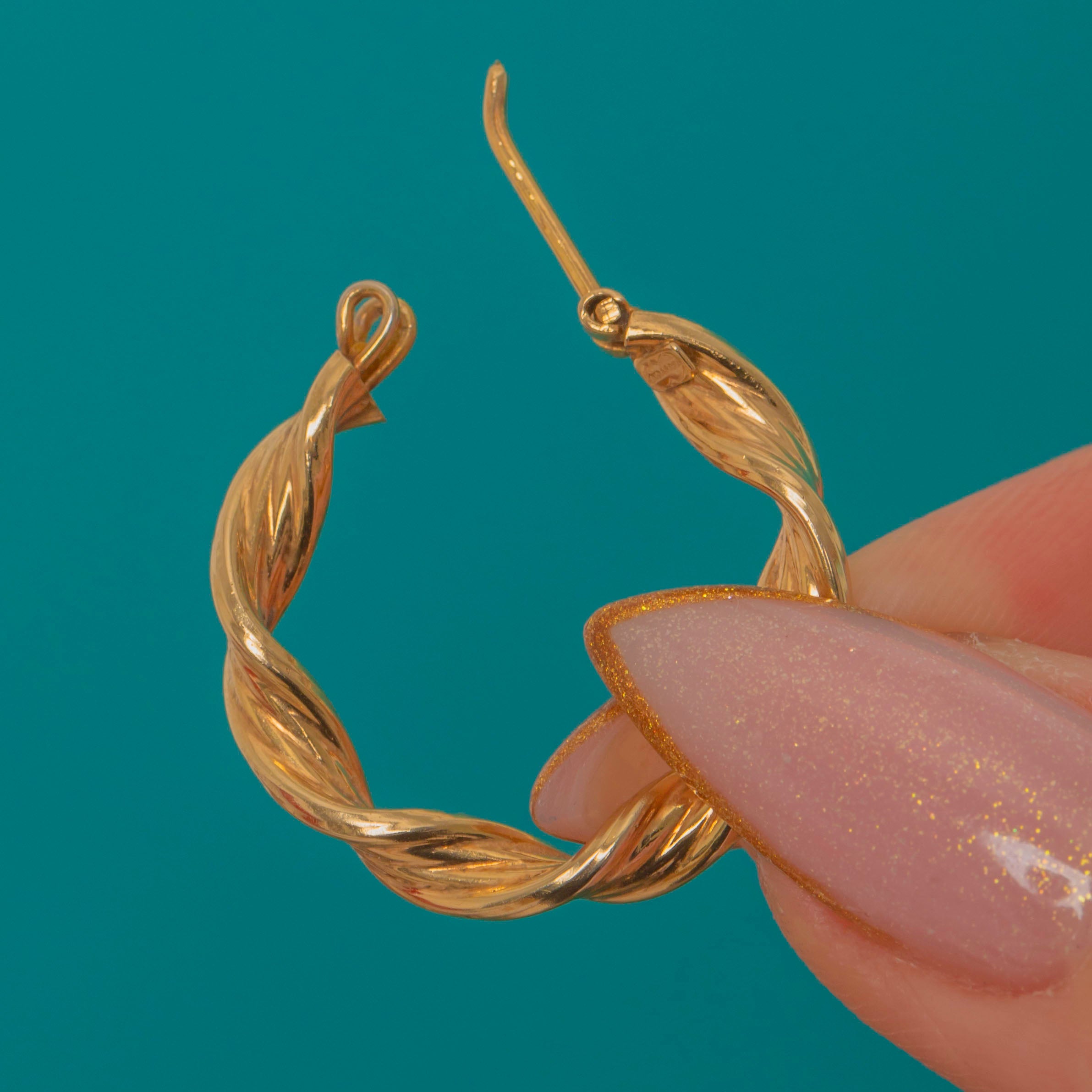 EXCELLENT: These Vintage hoop earrings are in outstanding condition with bright, glossy Gold throughout. The twist design is crisp, the surface highly polished, and the fittings close securely. Beautifully made and ready to wear.
