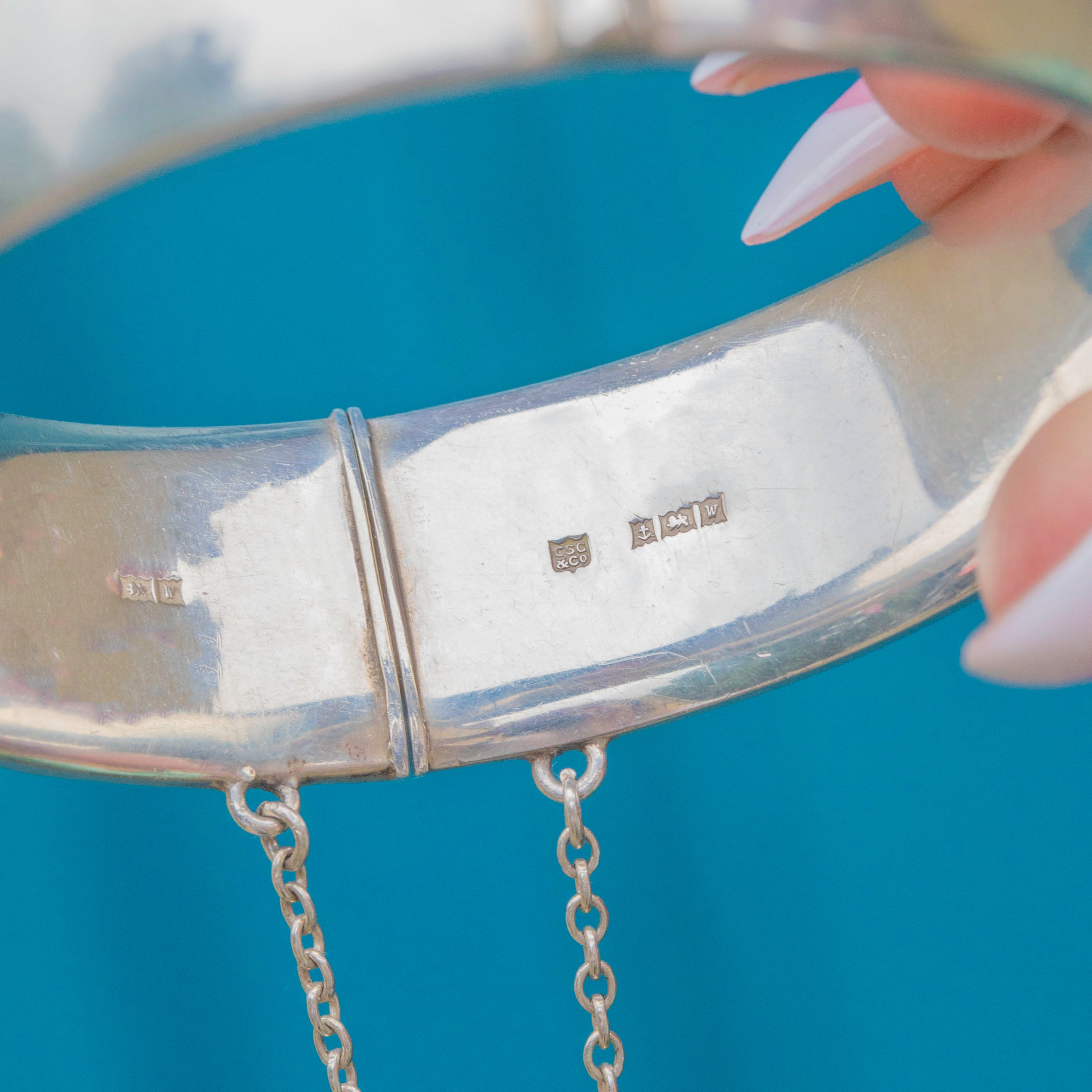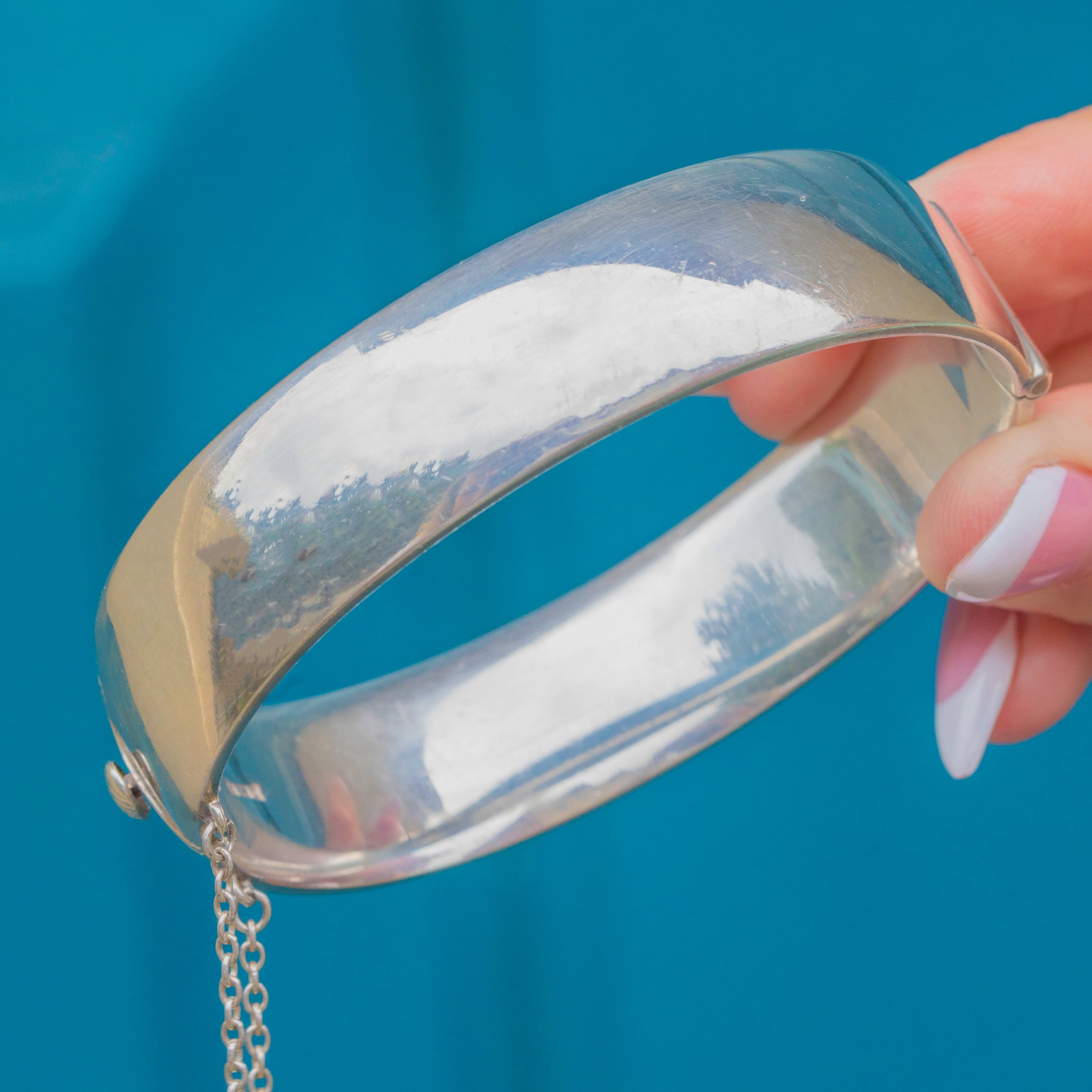 EXCELLENT: The Silver is bright and glossy and the Gold details are pristine. The bangle closes securely and has an added safety chain, so you can wear this mid-century cuff bangle with utmost confidence!