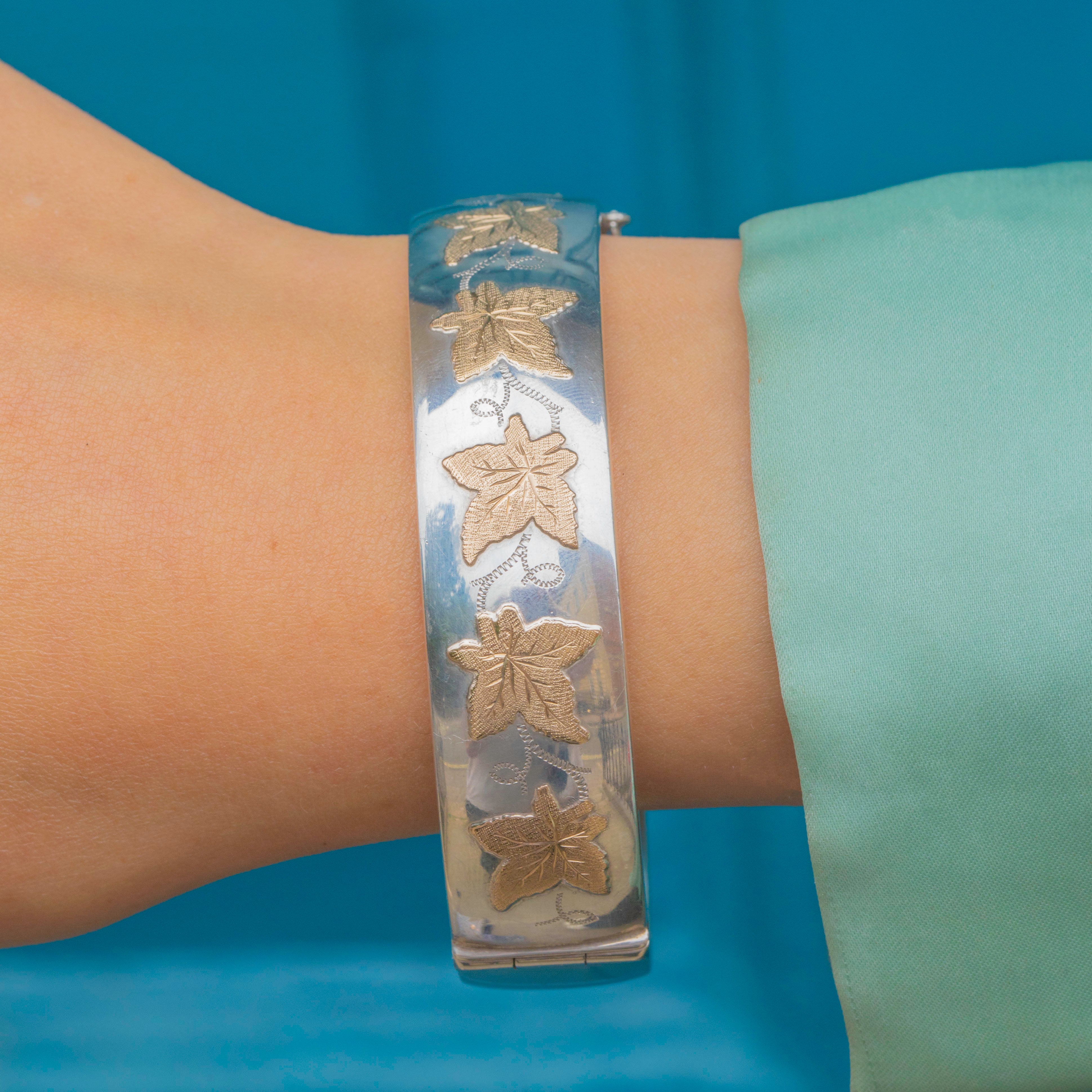 Vintage Sterling Silver Bangle with 9ct Gold Ivy Leaf Motifs