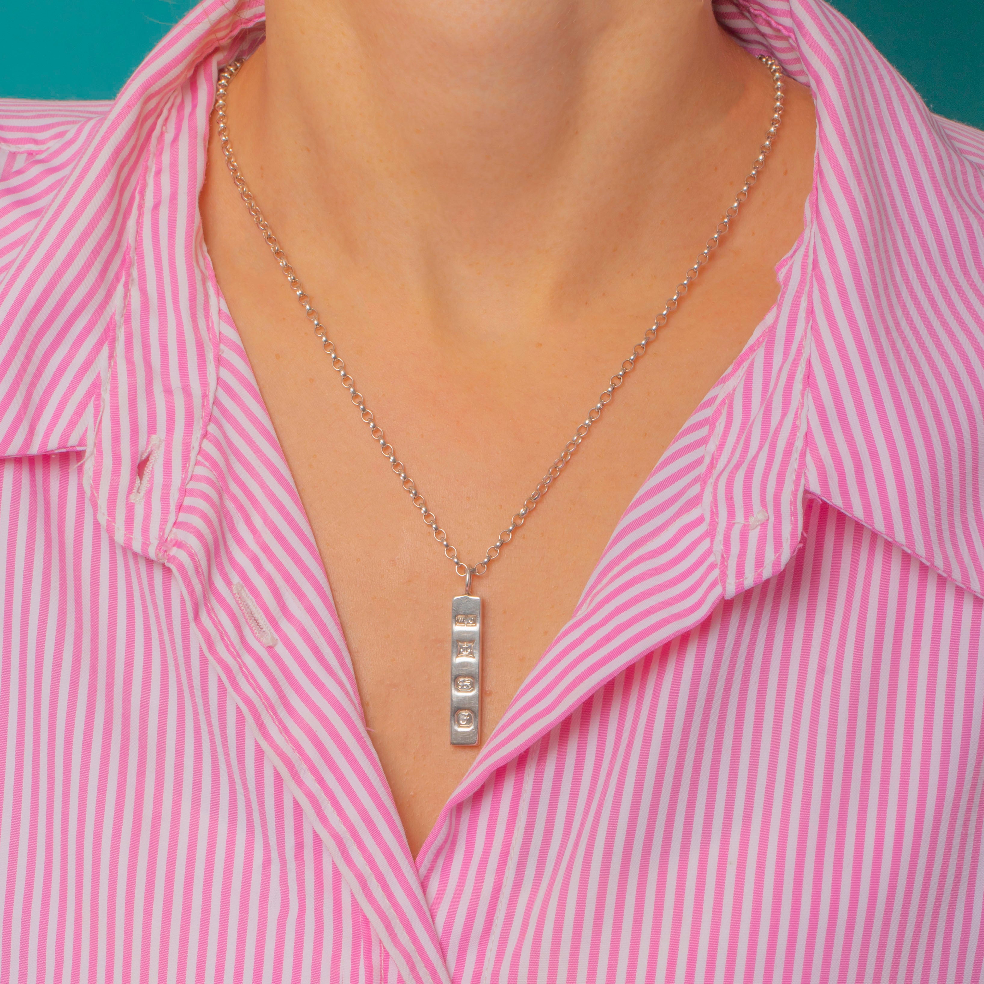 This handsome Vintage Silver ingot pendant is a timeless classic — simple, solid, and satisfyingly weighty. Crafted in Sterling Silver, its sleek rectangular form showcases a full set of crisp Birmingham hallmarks for 1980.