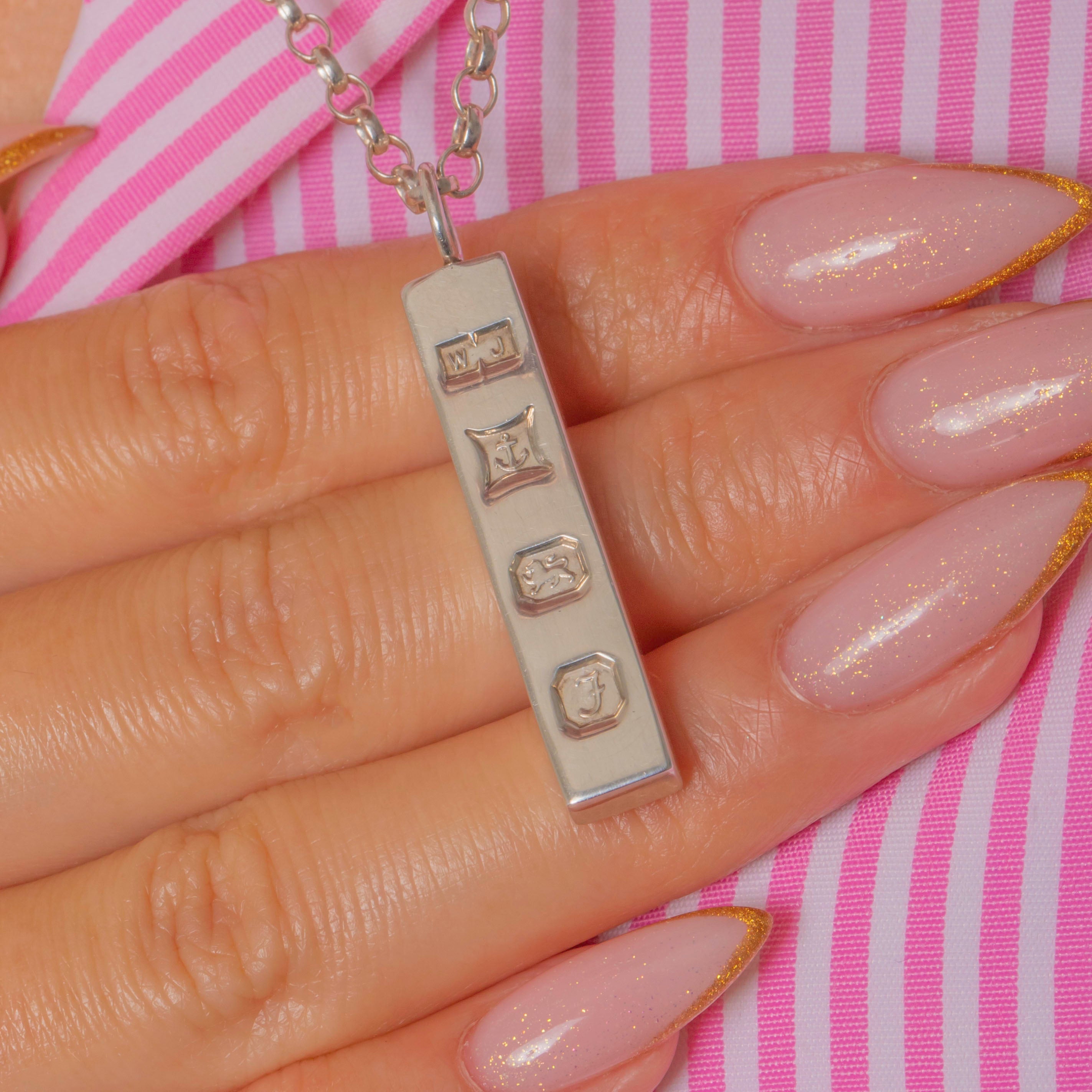 EXCELLENT: A sturdy and well-preserved vintage ingot pendant with crisp hallmarks and a bright, high-shine polish. The Silver is free from dents or scratches, retaining its pleasing weight and tactile feel.