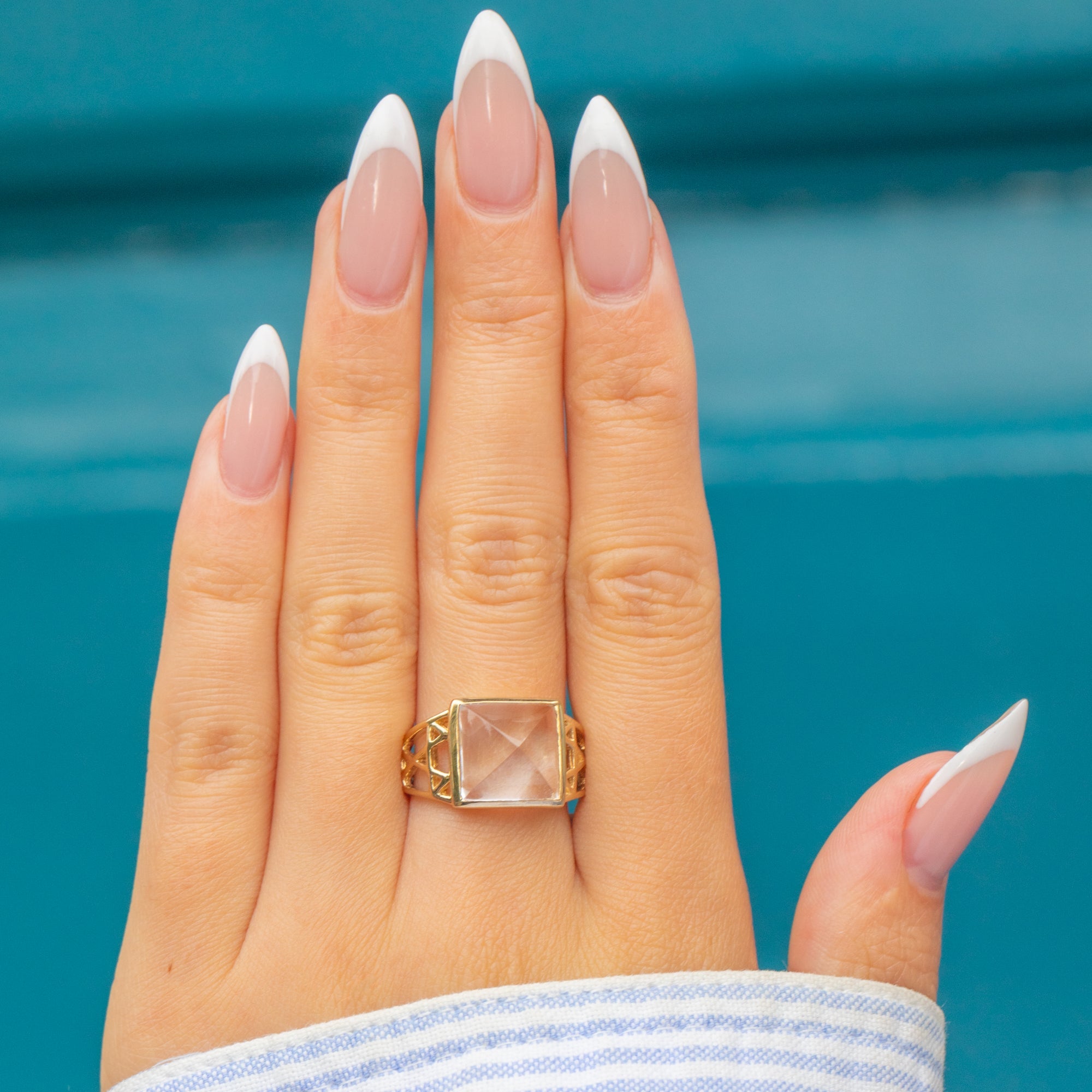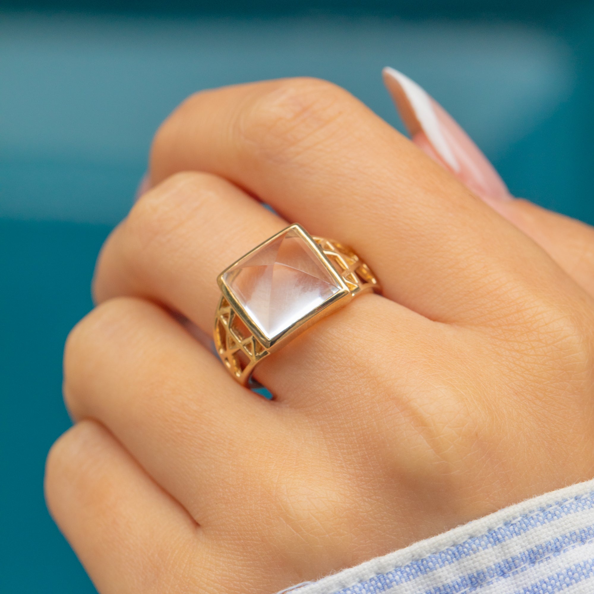 This striking 9ct Gold Rock Crystal ring features a bold sugarloaf cut stone, creating a captivating pyramid-like effect. The Rock Crystal measures an impressive 11mm across and rises 8mm tall, catching and reflecting light beautifully. Its unique profile gives the ring a statement presence while maintaining a timeless elegance.