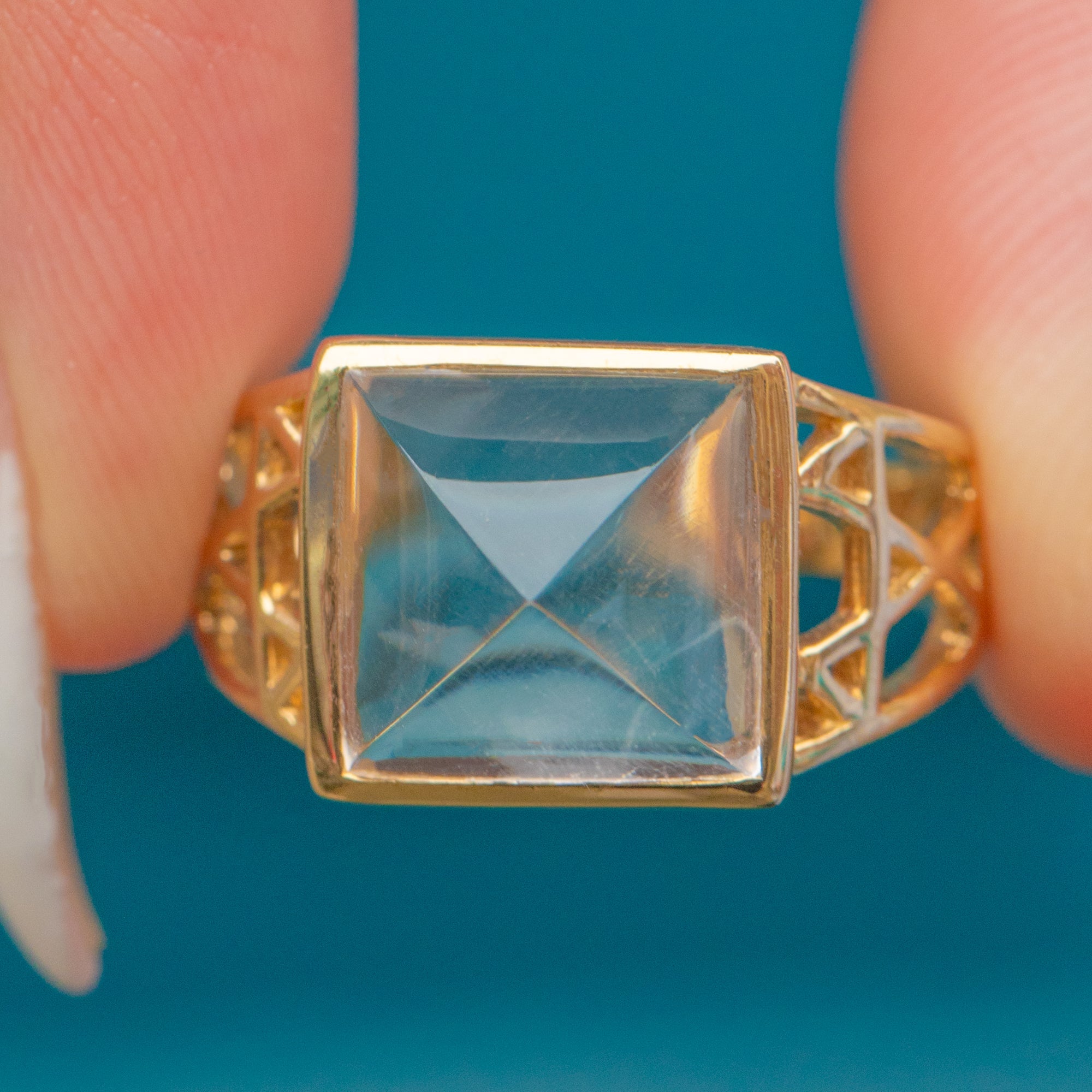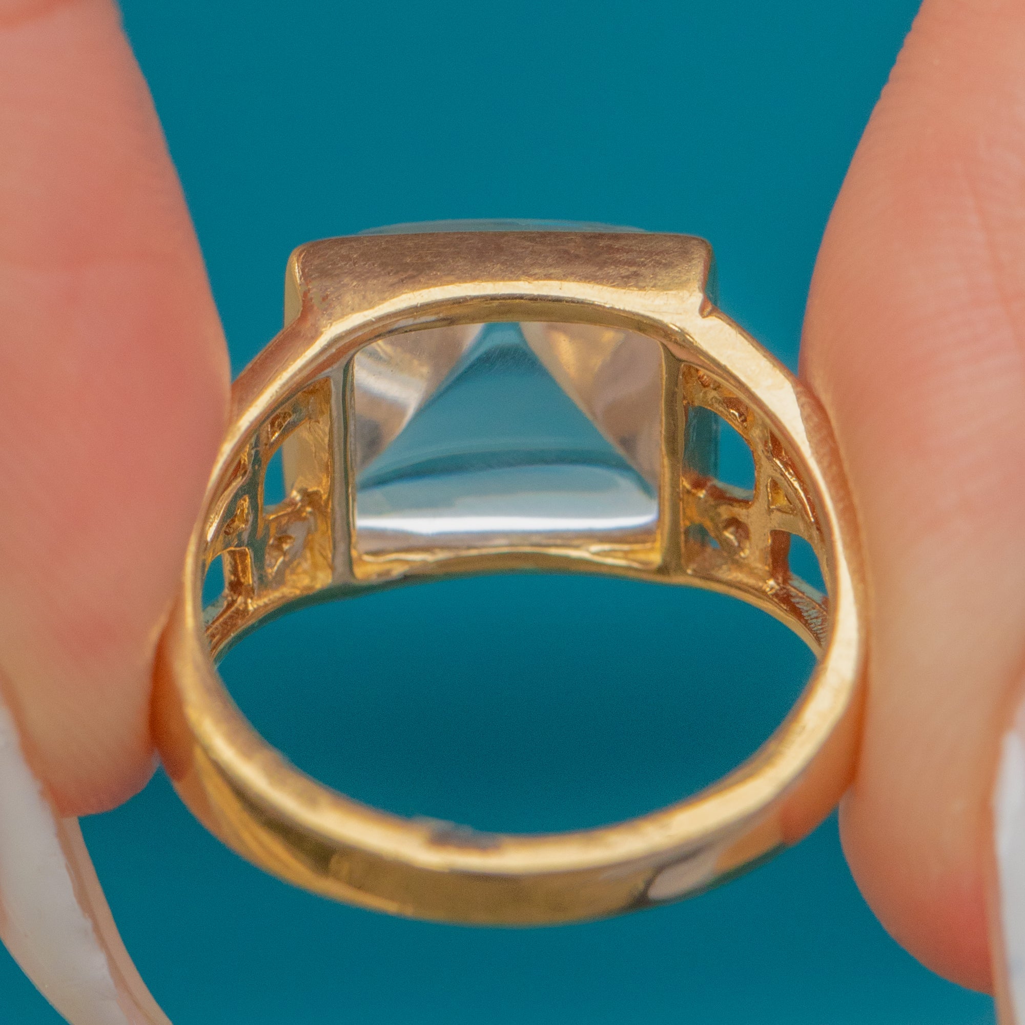 The substantial Gold setting is crafted with openwork shoulders, adding an extra layer of visual interest and lightness to the design. Known as the "Uri Geller Ring", this style is celebrated for its mystical and eye-catching qualities. A fabulous piece of Vintage jewellery, perfect for collectors or anyone seeking a distinctive everyday ring.