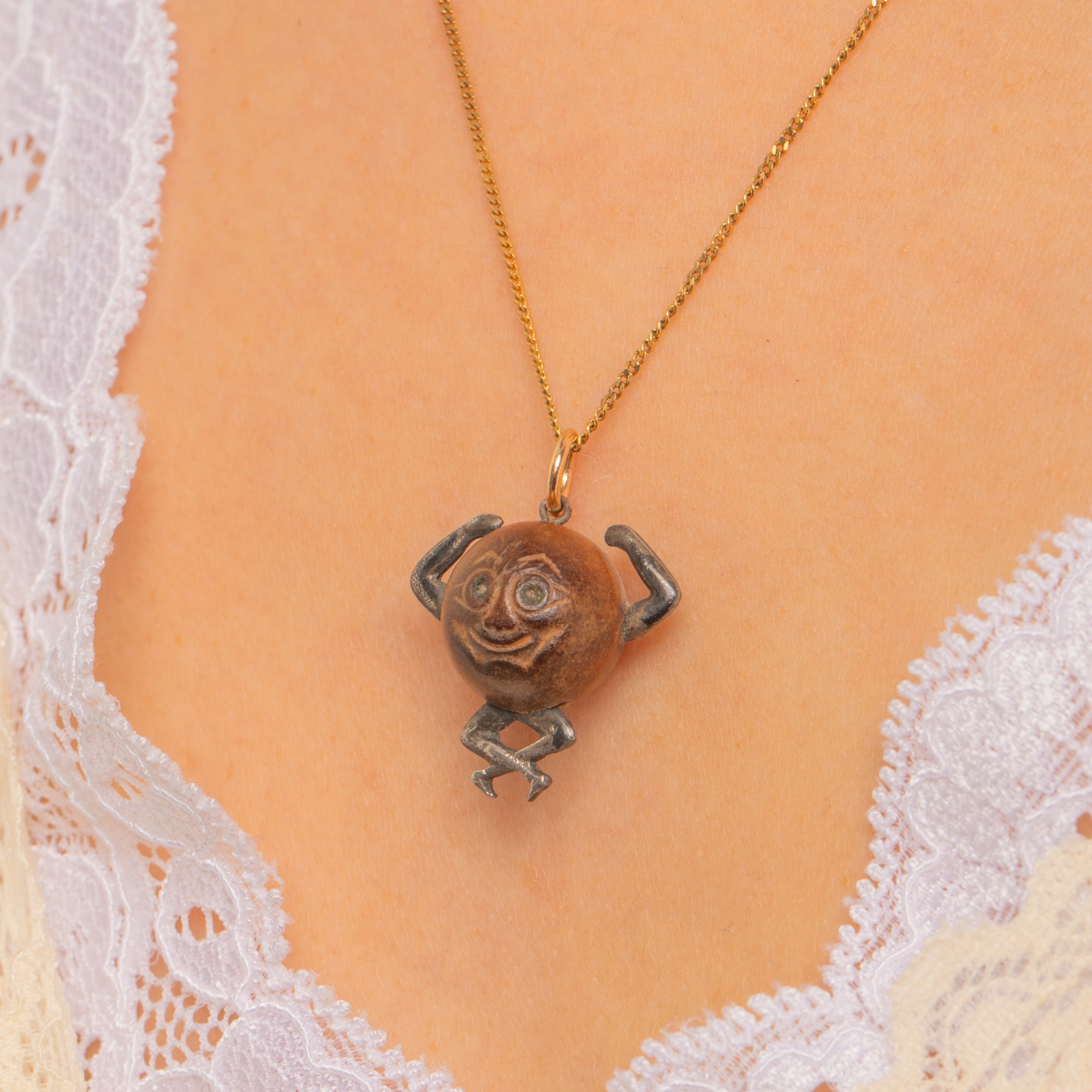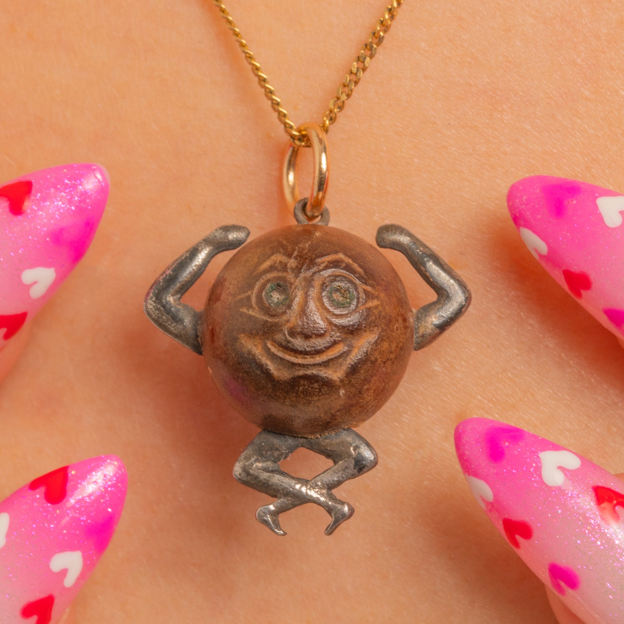 A charming World War I era “Tommy Touch Wud” fumsup good luck charm, crafted with Sterling Silver arms and legs and a smiling Wood orb. Playful yet steeped in sentiment, this figural pendant captures the quintessential wartime talisman—raised hands giving the “thumb’s up” and “Touch Wud” embossed to the back for luck.