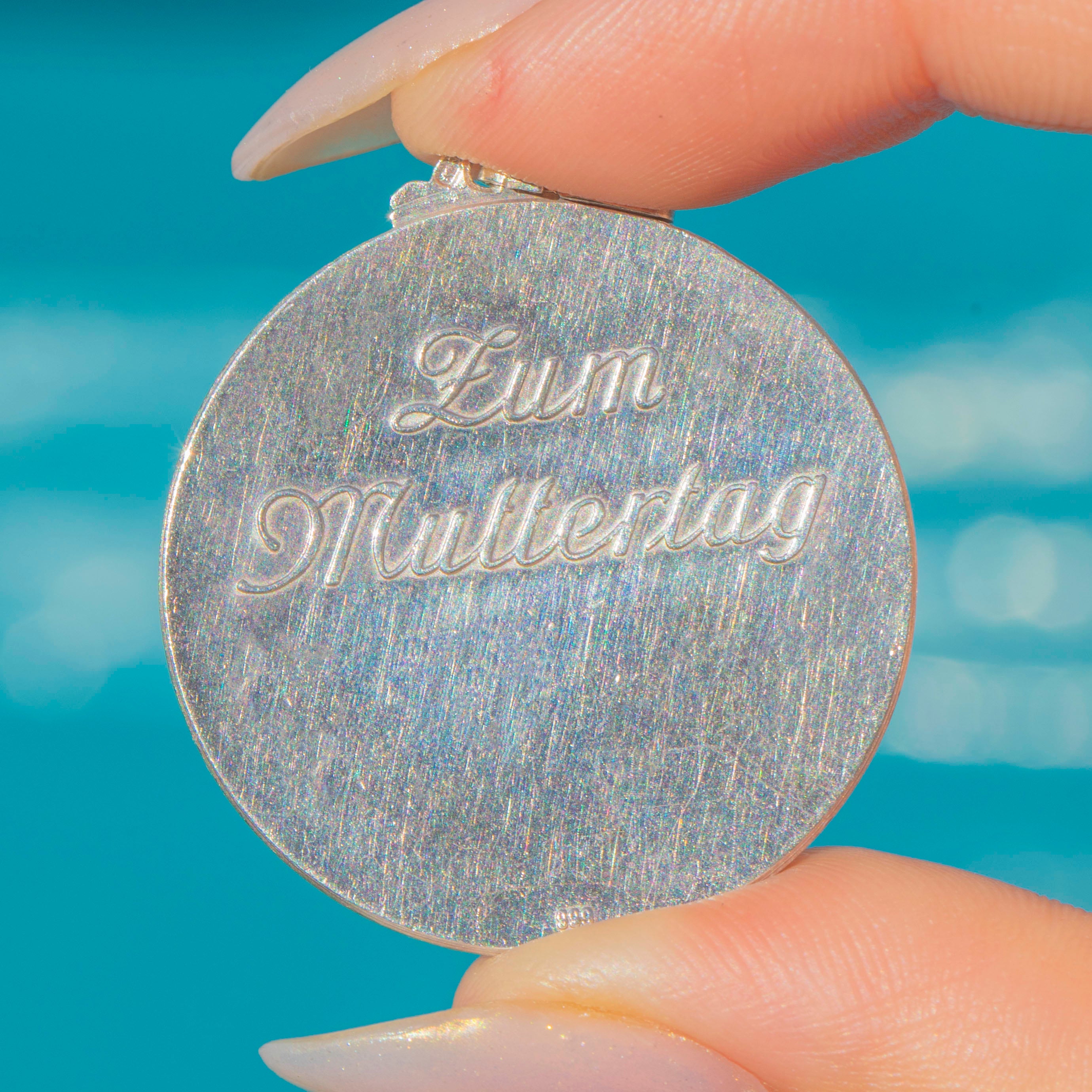 This charming mid-century pendant was created “Zum Muttertag” (“For Mother’s Day”), featuring an Enamel design inspired by Albrecht Dürer’s “Vintage Violets” painting. The front shows delicately Enameled purple blossoms with bright green leaves against a Silver ground, while the reverse is engraved “Zum Muttertag”.